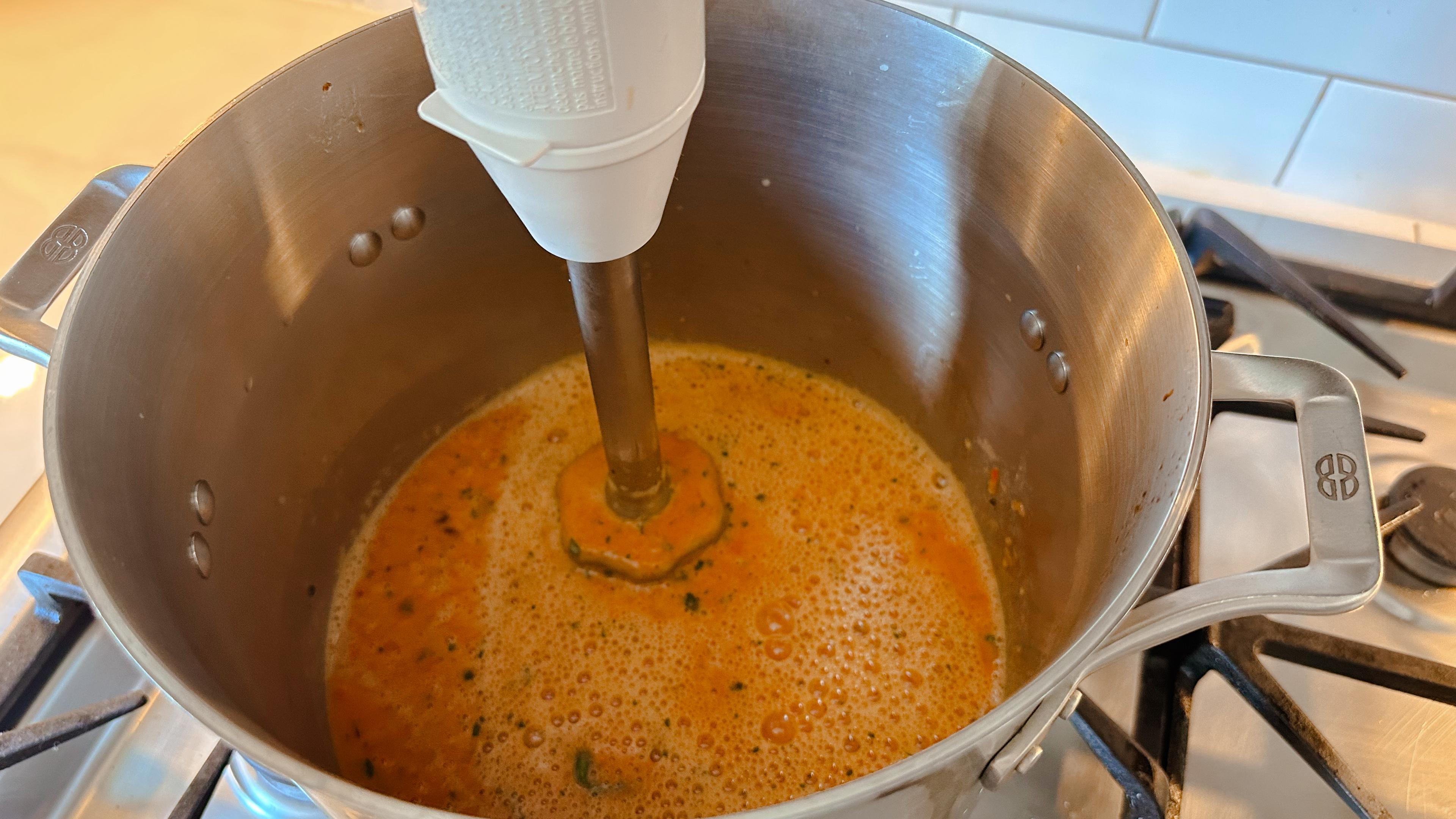 Transfer the soup to a blender and puree until smooth, and then put back in the large pot. You could also use an immersion blender in the pot. Season with salt and pepper to taste.
