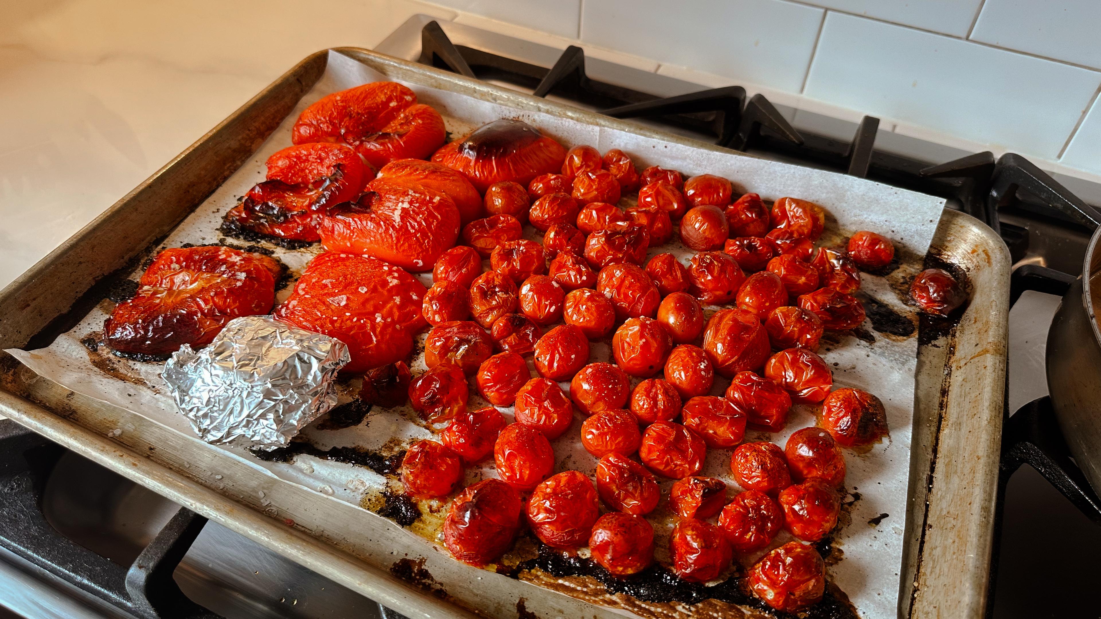 Bake for approximately 45 minutes or until bell peppers have sunk in and started to show signs of charring.