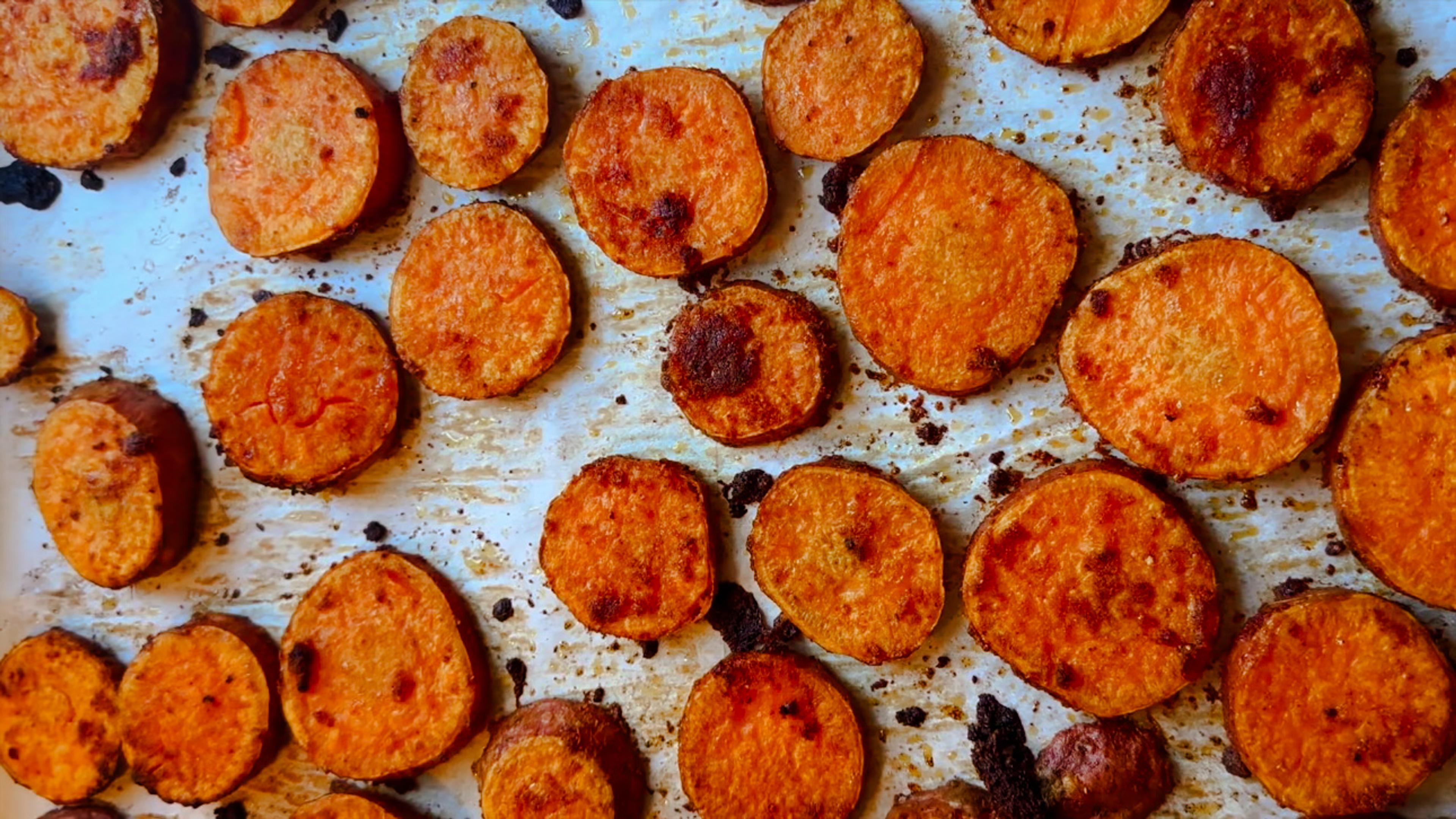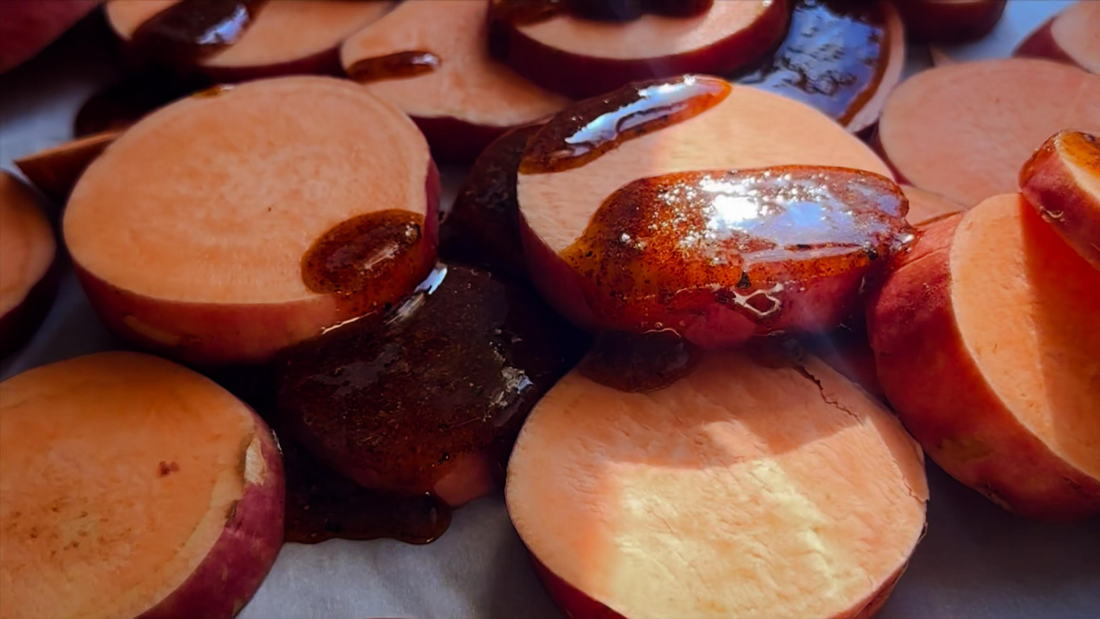 Add to large, lined sheet pan and add olive oil, spices, honey and salt and pepper to taste.
