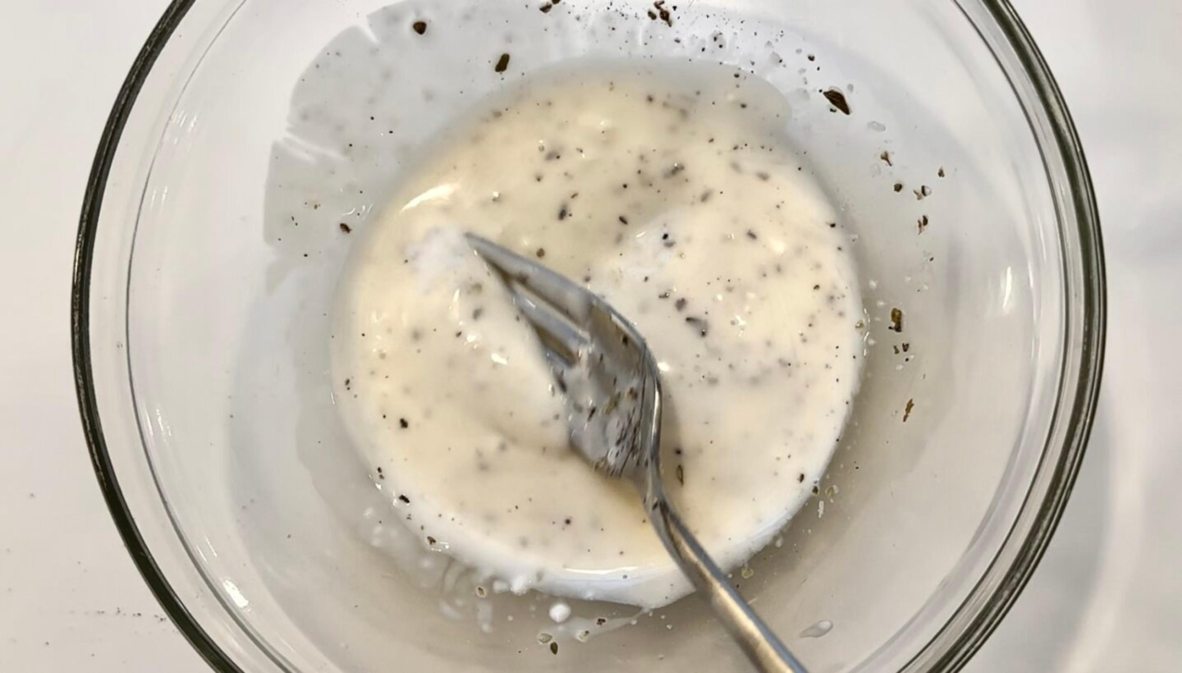 While the potatoes are roasting, prepare the dressing. In a bowl, combine crushed garlic, oregano, lemon juice, mayonnaise, salt and pepper to taste. Add a little water at a time until it has reached your desired consistency. Mix until smooth.