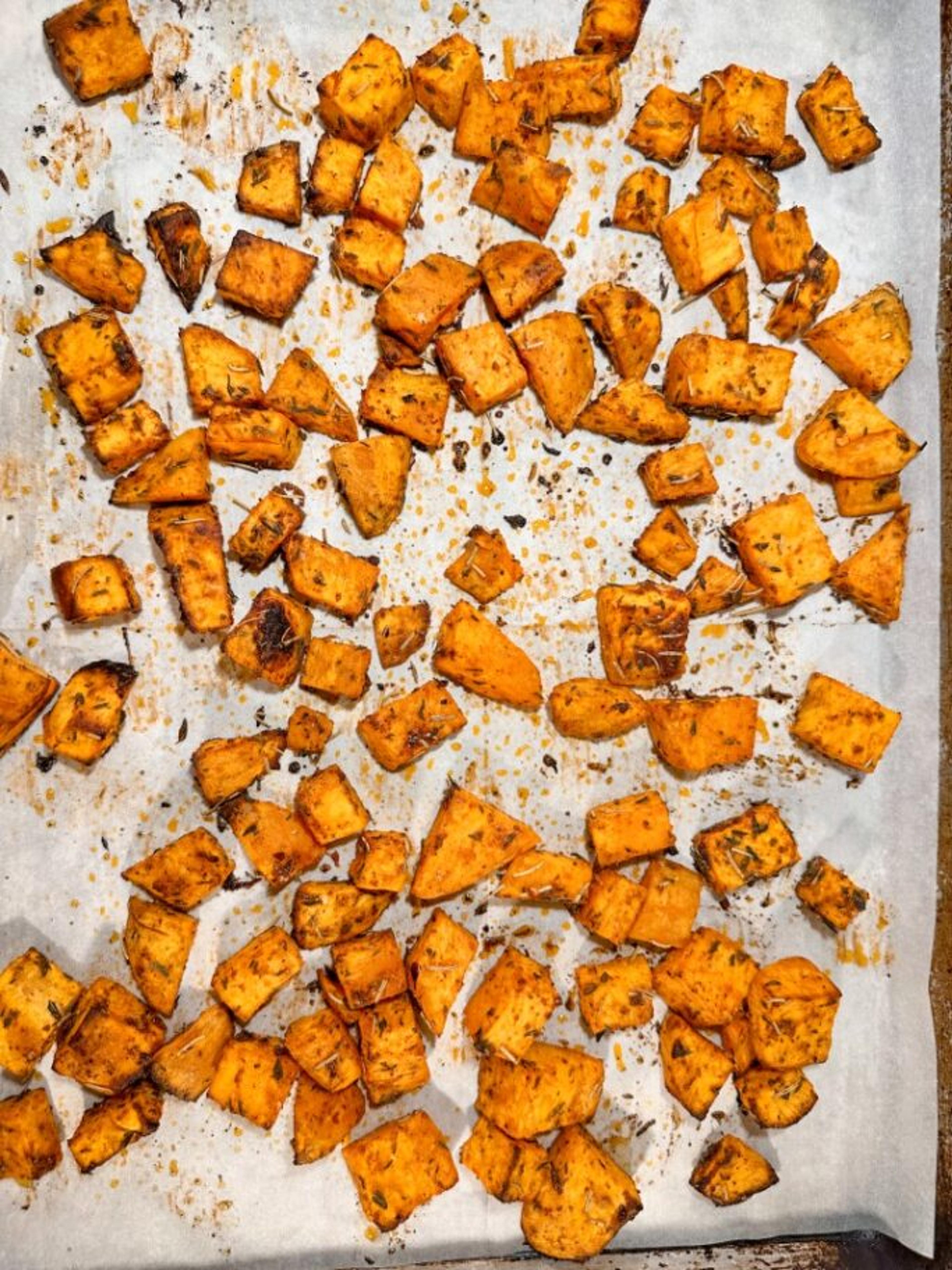 Spread the cubes in an even layer on the sheet pan and bake 30 to 35 minutes, tossing halfway, until tender, golden and lightly browned on the edges.