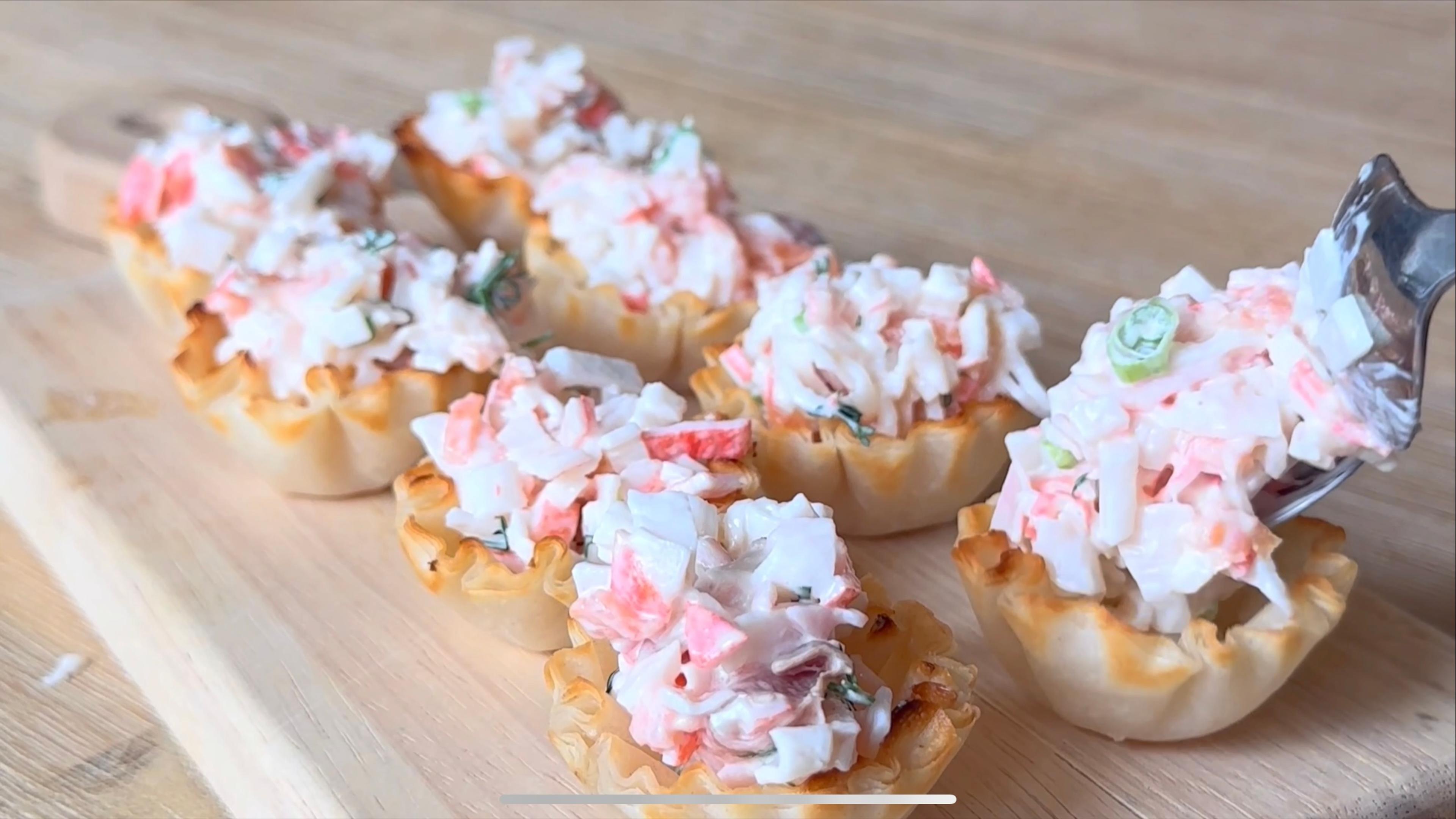 Add a spoon of the mixture to the mini shells. Add a halfmoon slice of English cucumber and sprinkle chopped green onions.