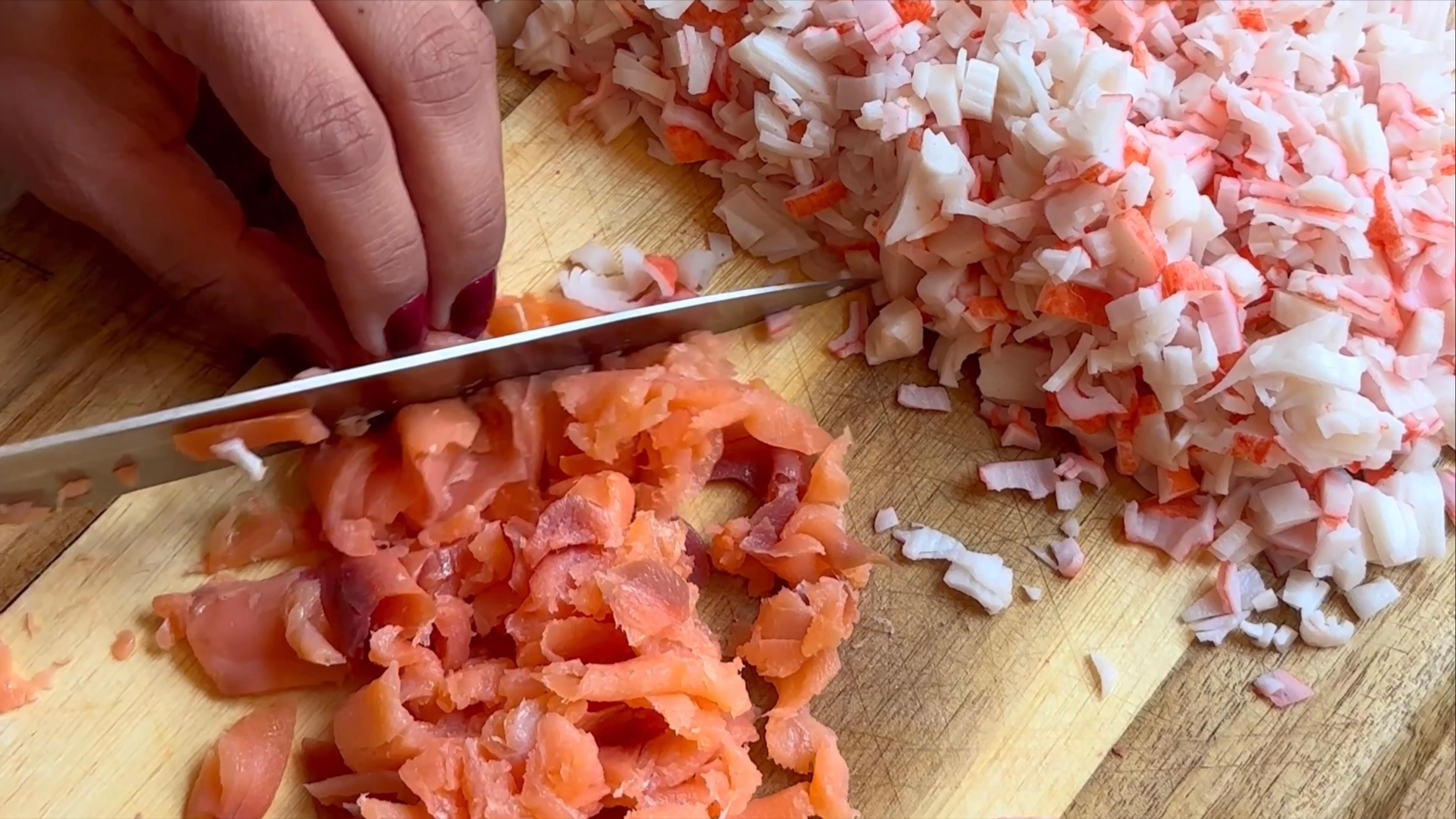 Chop imitation crab legs and smoked salmon until fine in texture, then add to the mayonnaise mixture. Season with salt to taste. Keep in mind that smoked salmon is salty.