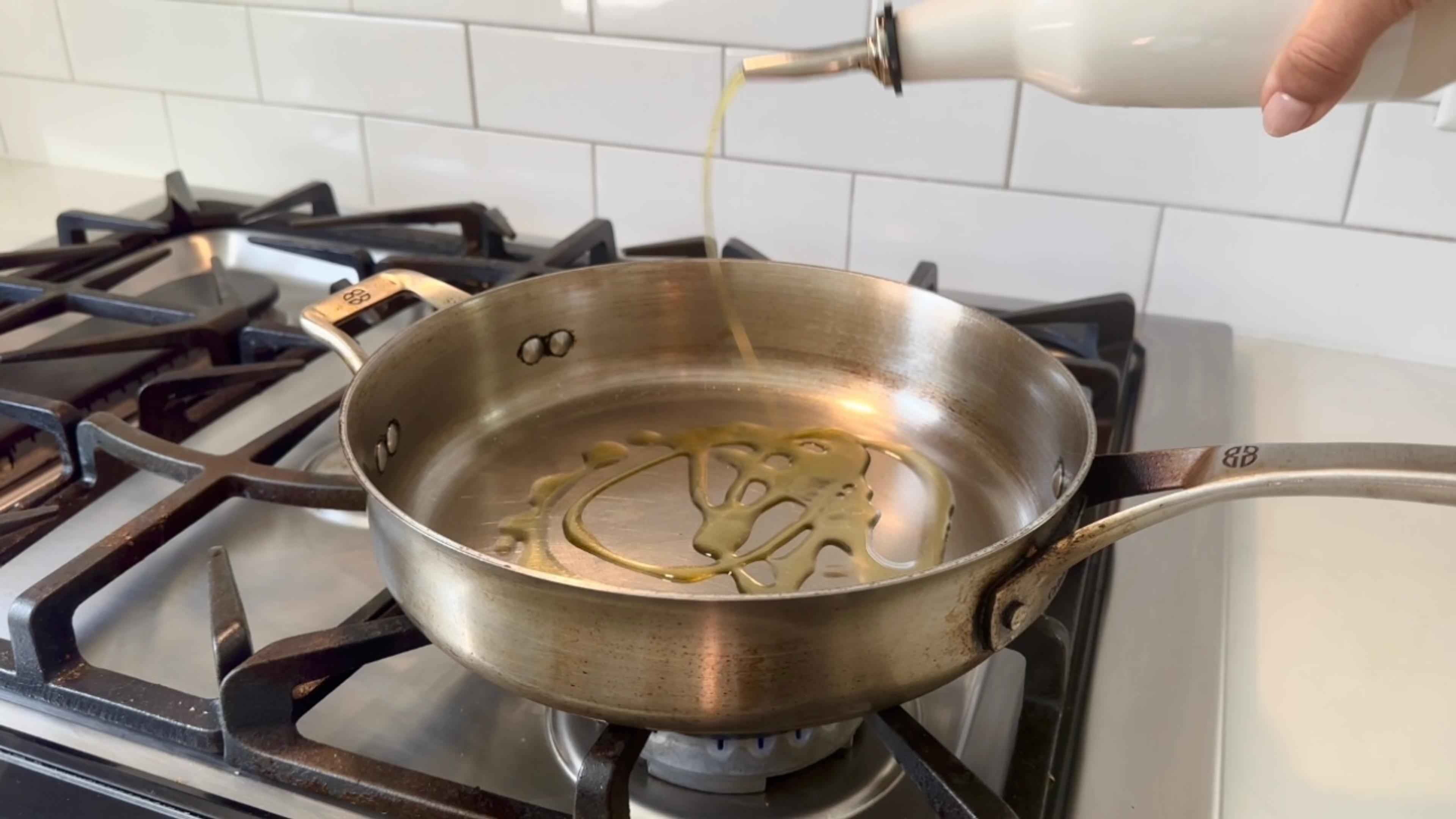 In a large pan over medium heat, heat olive oil. Once oil is hot, add green beans and sear for about 5-7 minutes, stirring occasionally.