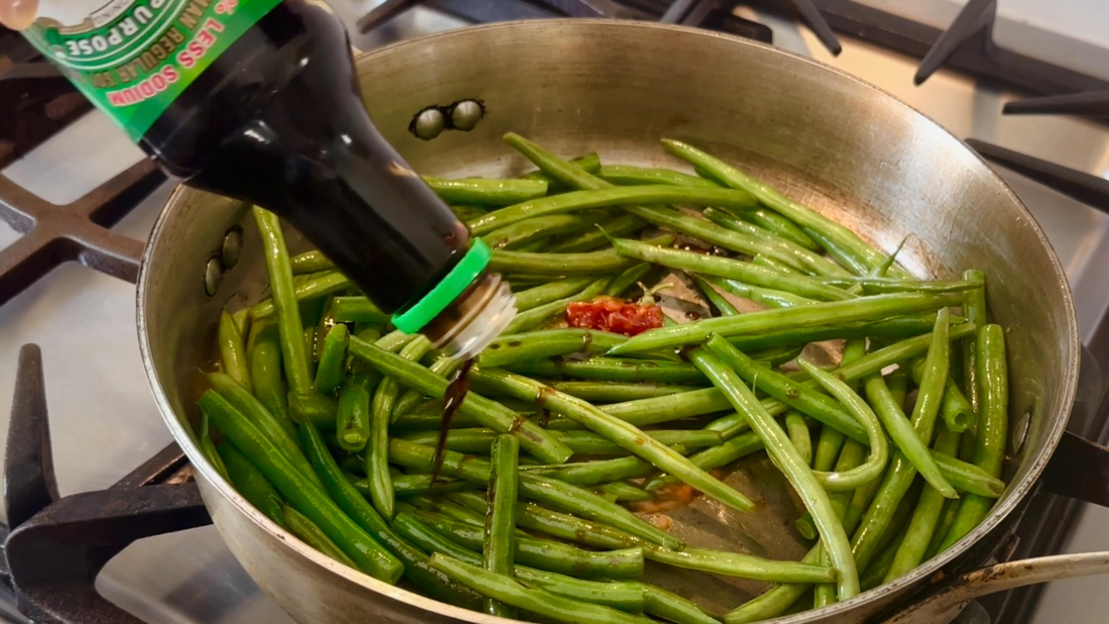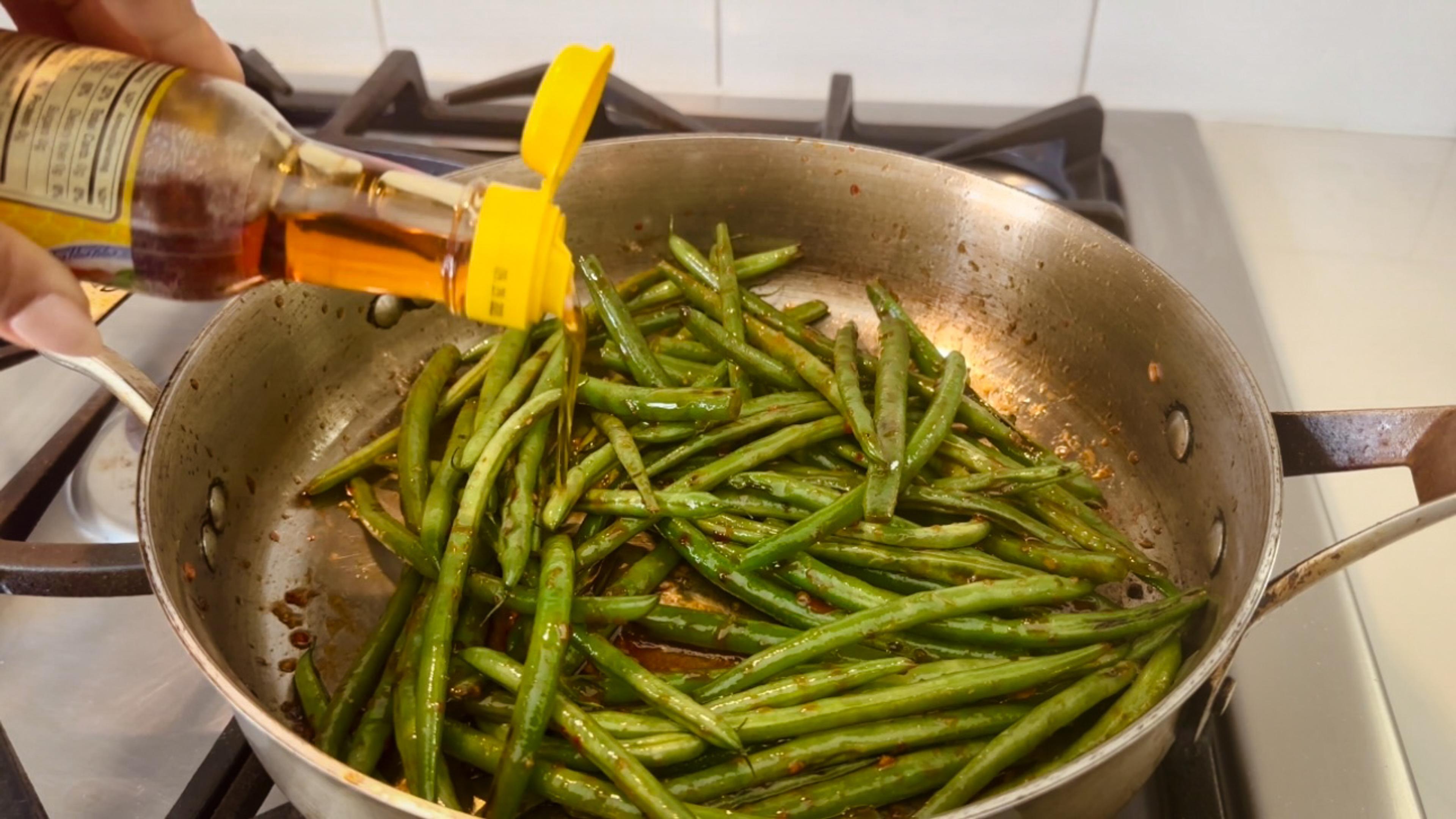 Drizzle the sesame oil over the beans in the pan and allow to cook for 1 minute.