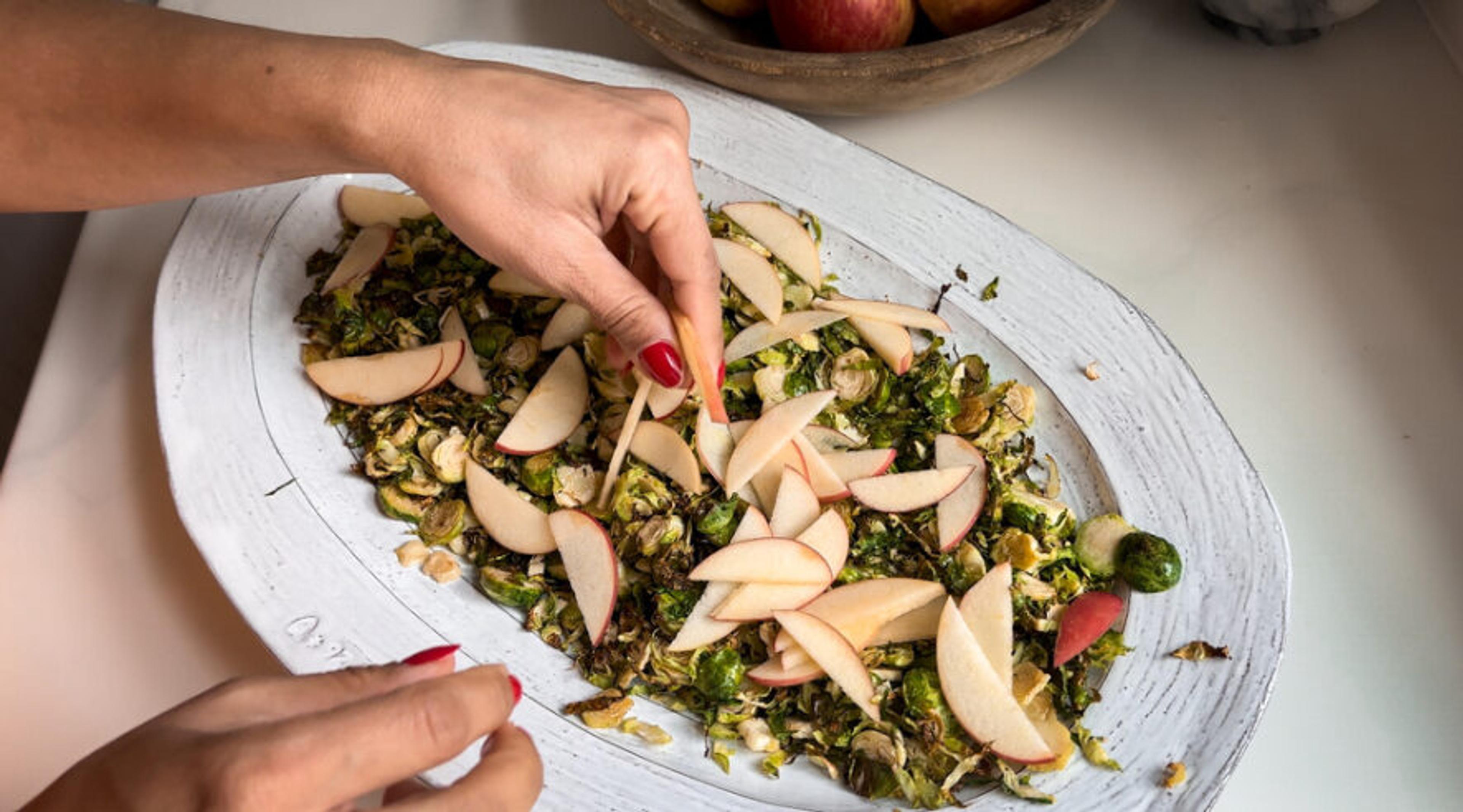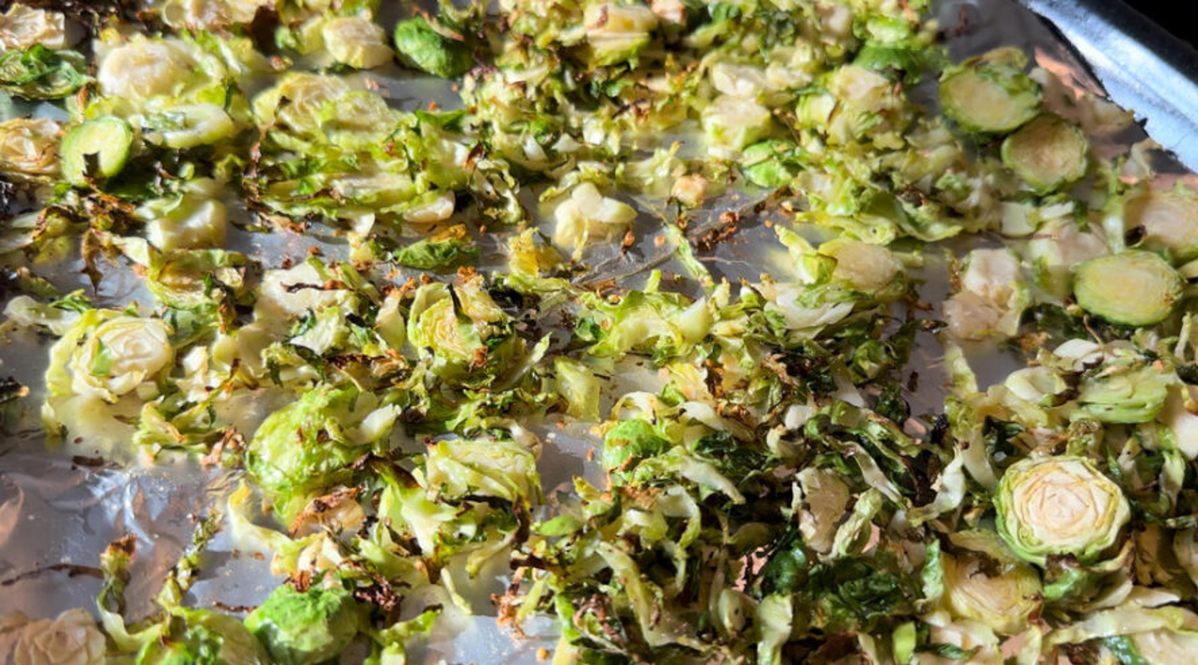 3. On a baking sheet with parchment paper, add Brussels sprouts and toss with olive oil and salt and pepper to taste. Roast for 7-10 minutes, or until mostly golden and crispy.