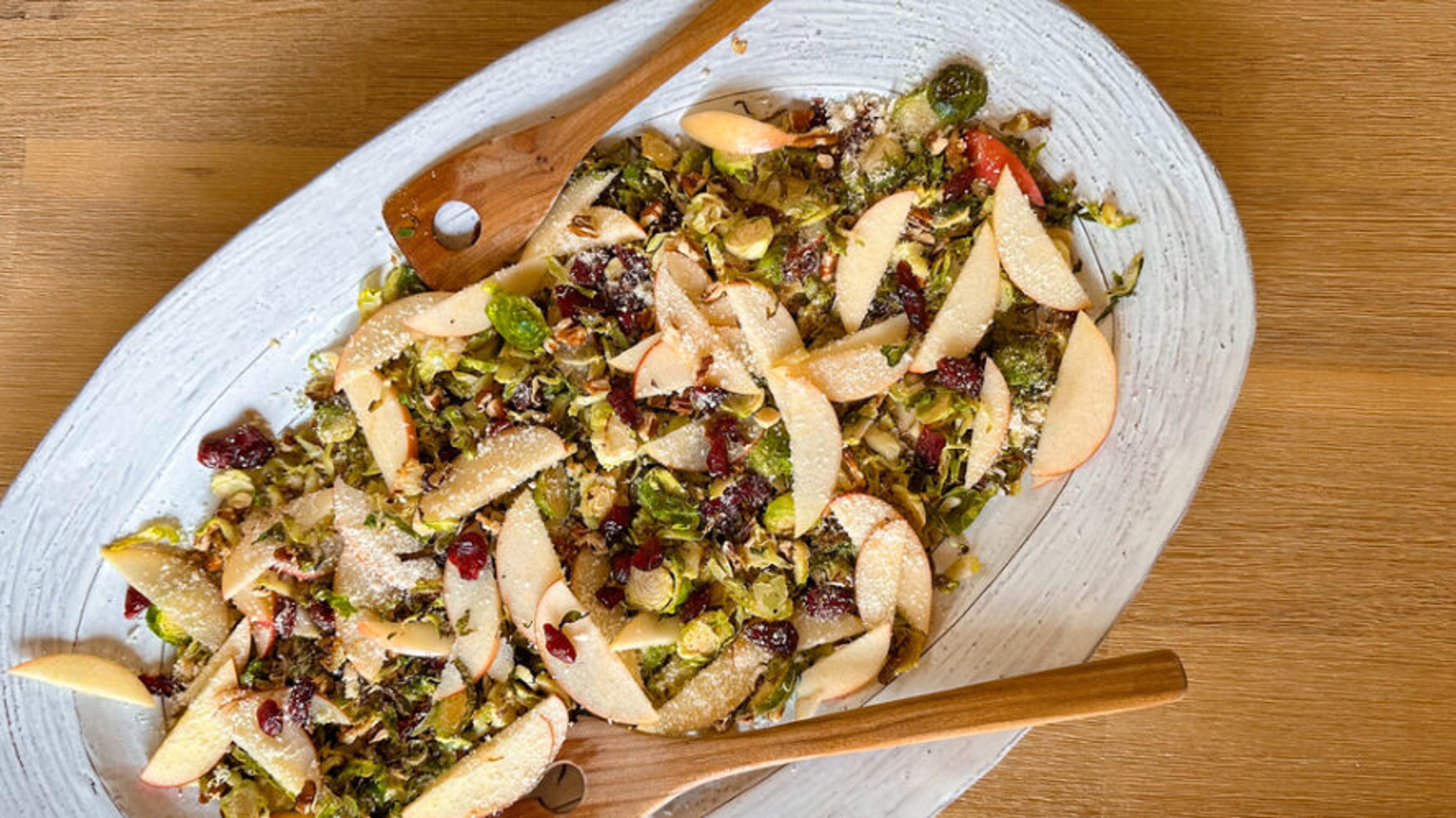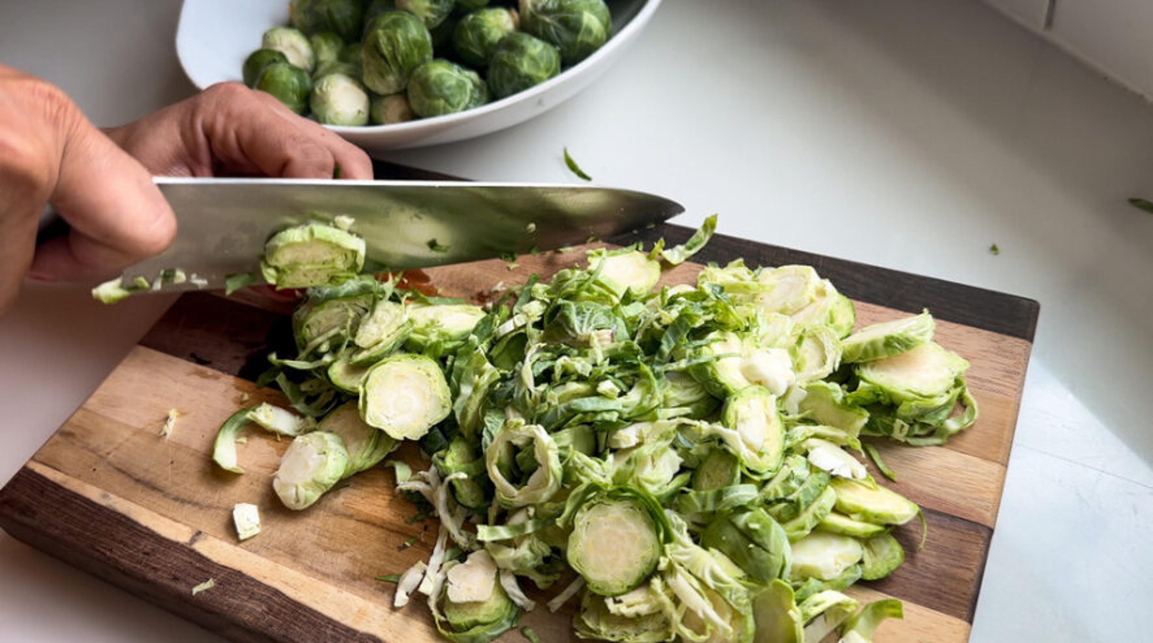 2. Clean Brussels sprouts then shave with a mandolin or shred with a knife.