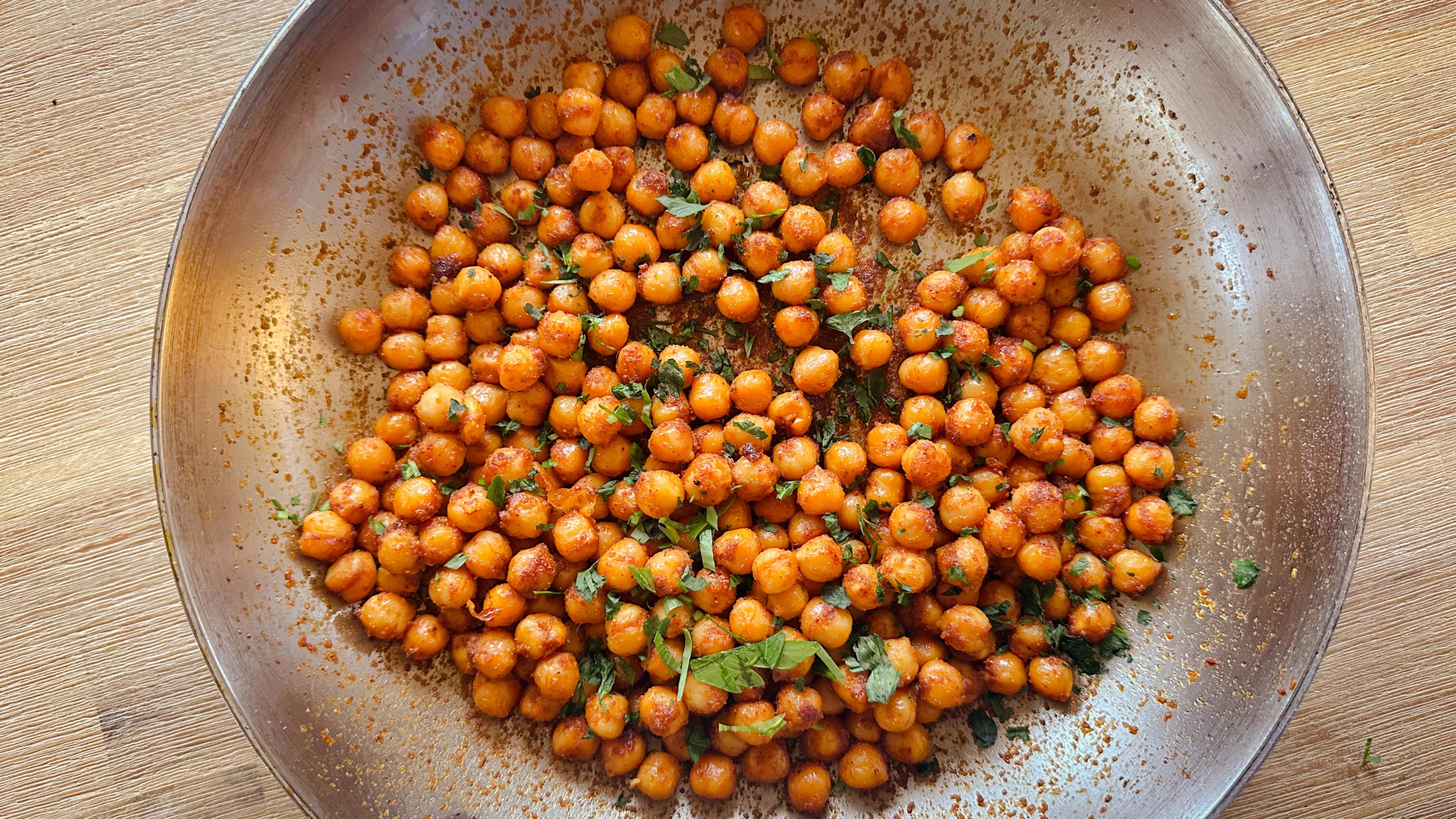 This recipe is a great and versatile way to elevate chickpeas. Sauté canned chickpeas with olive oil and spicesgarlic then finish with a squeeze of lemon. They crisp up nicely in the pan and can be served over on top of a salad, hummus or a grain. To save more on this recipe, the oil can be swapped for canola, vegetable oil or whatever is in the pantry.