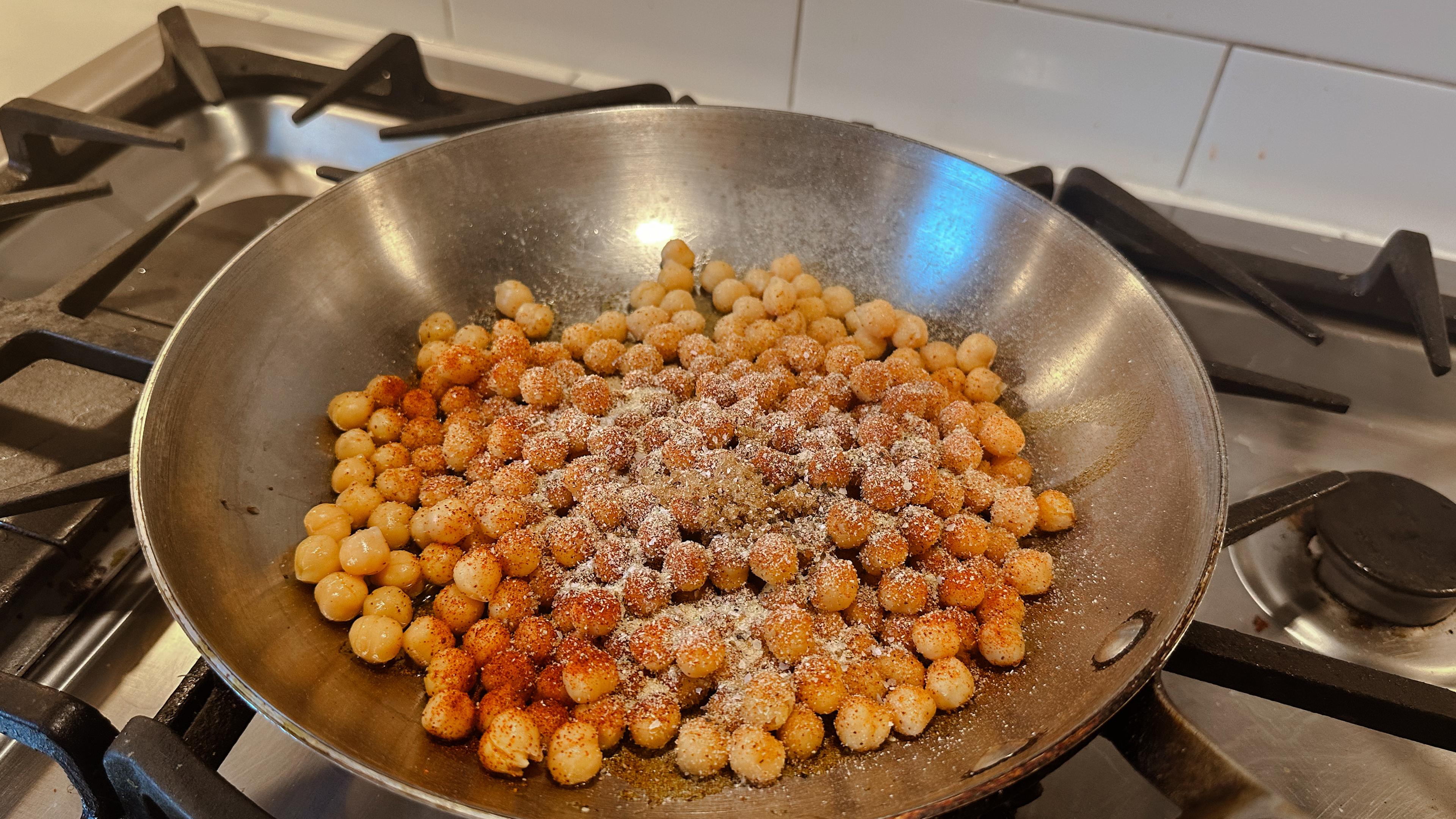 In a pan over medium heat, add oil. Once warm, add chickpeas, spices and the sweet element. Sauté, stirring frequently, until chickpeas crisp up and are softened, about 7-10 minutes.
