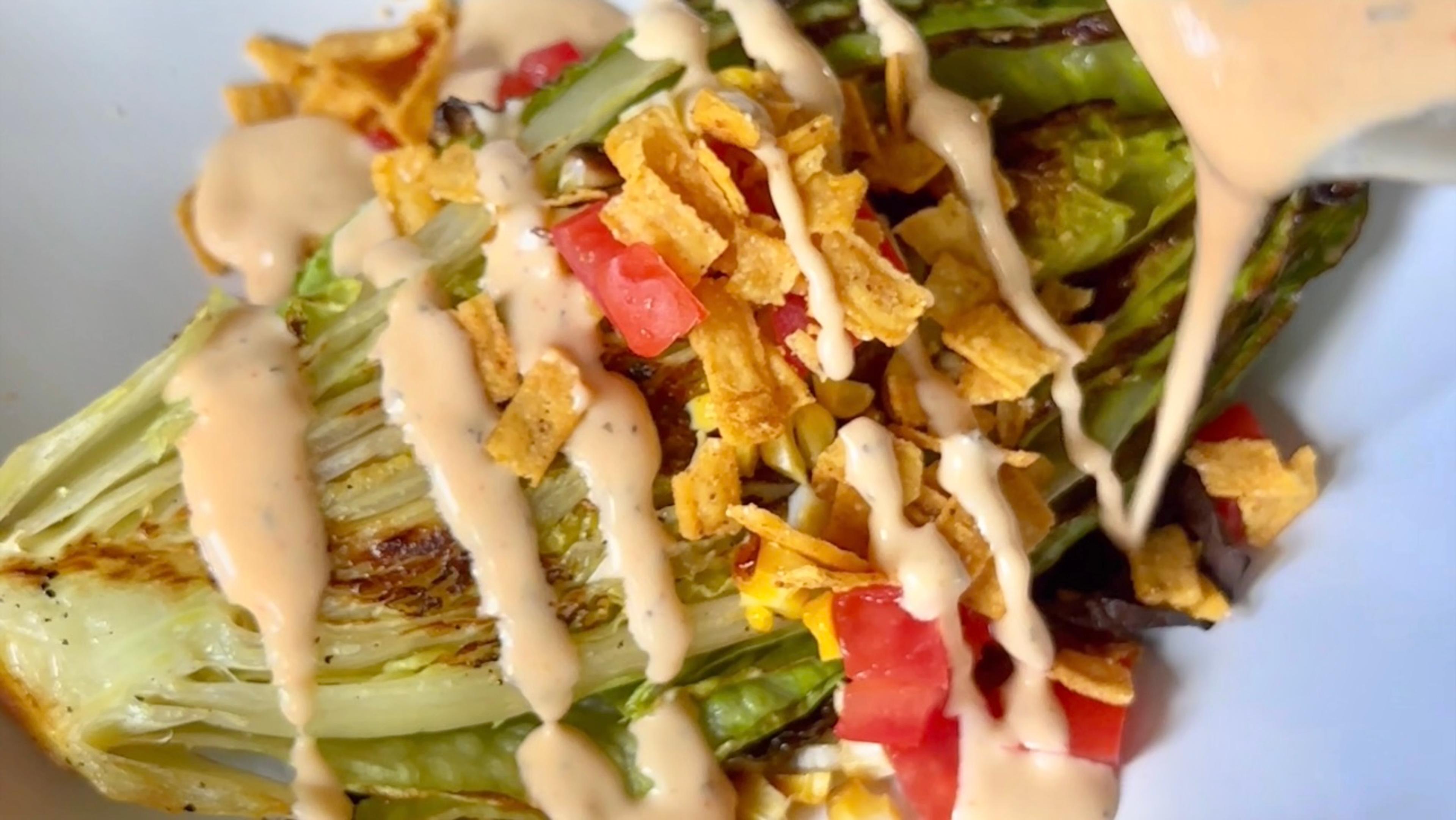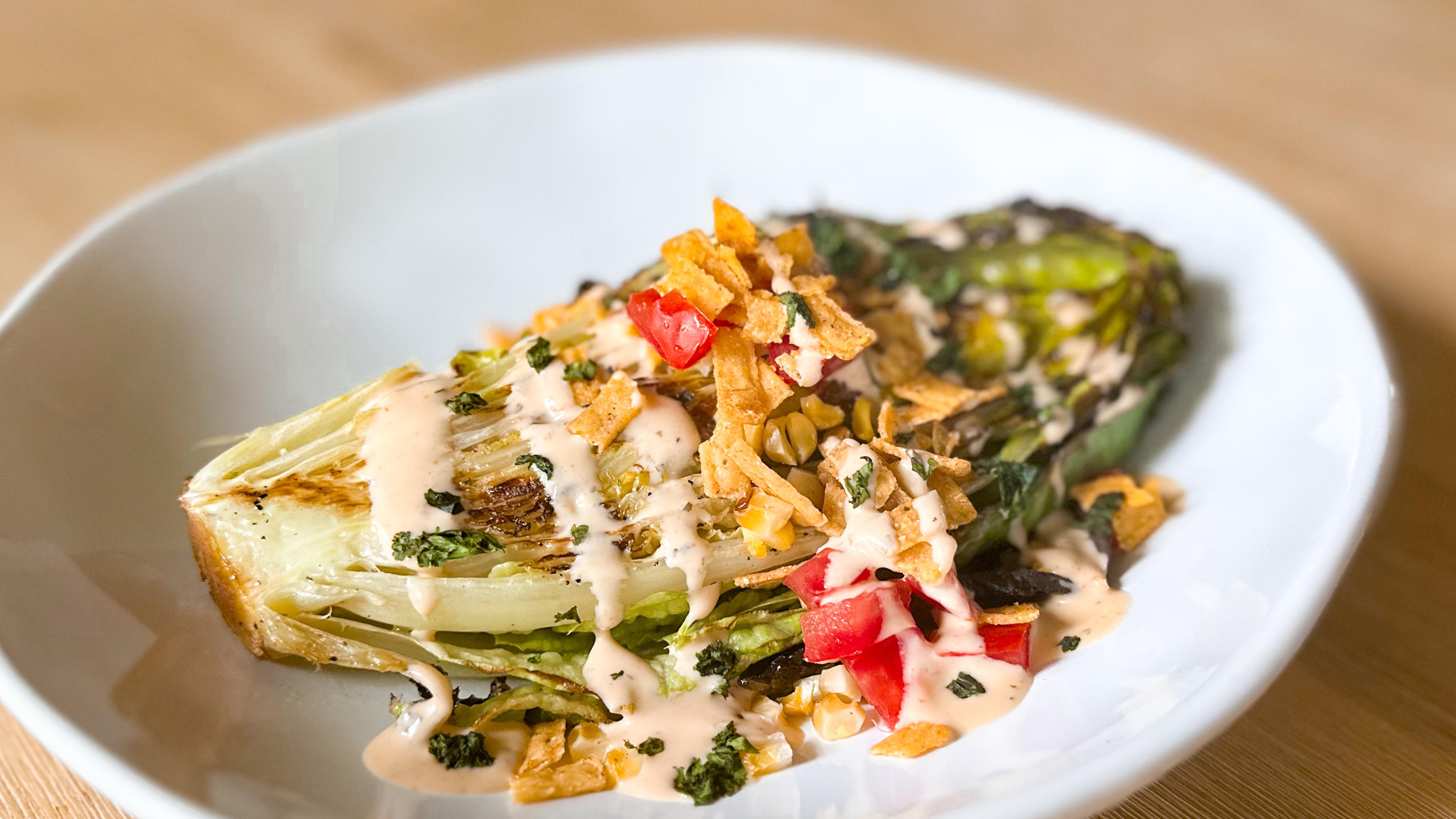 Place the grilled half head of romaine in a bowl. Top with diced Roma tomatoes, grilled corn, crispy tortilla strips, cotija cheese, cilantro and a drizzle of chipotle ranch.