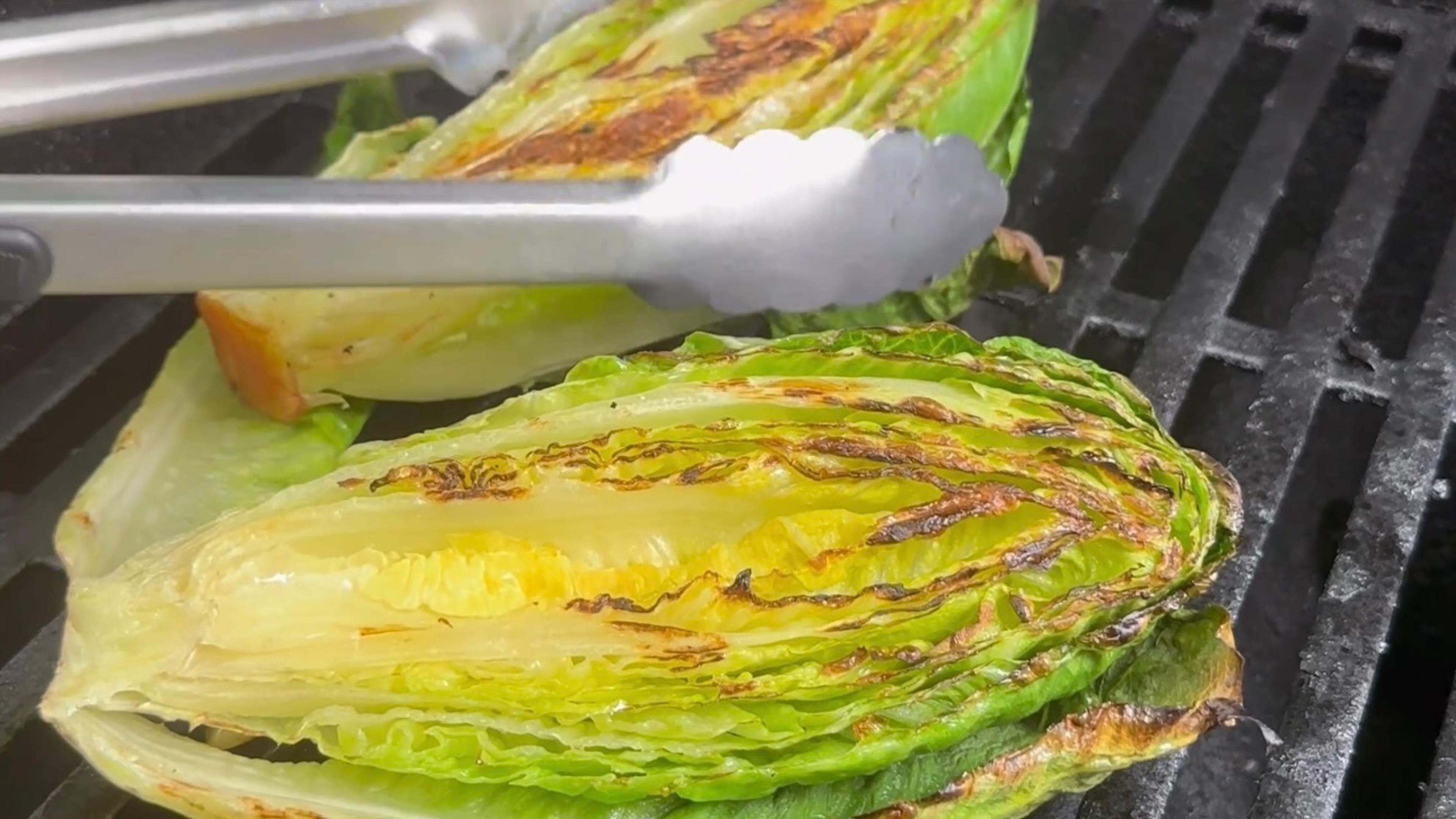 Add corn to the grill, turning every couple of minutes. Place the romaine face down, without moving it, for about 3 minutes. Turn, then grill on the other side. The corn may take longer to grill. Using a knife, cut the corn off the corn.