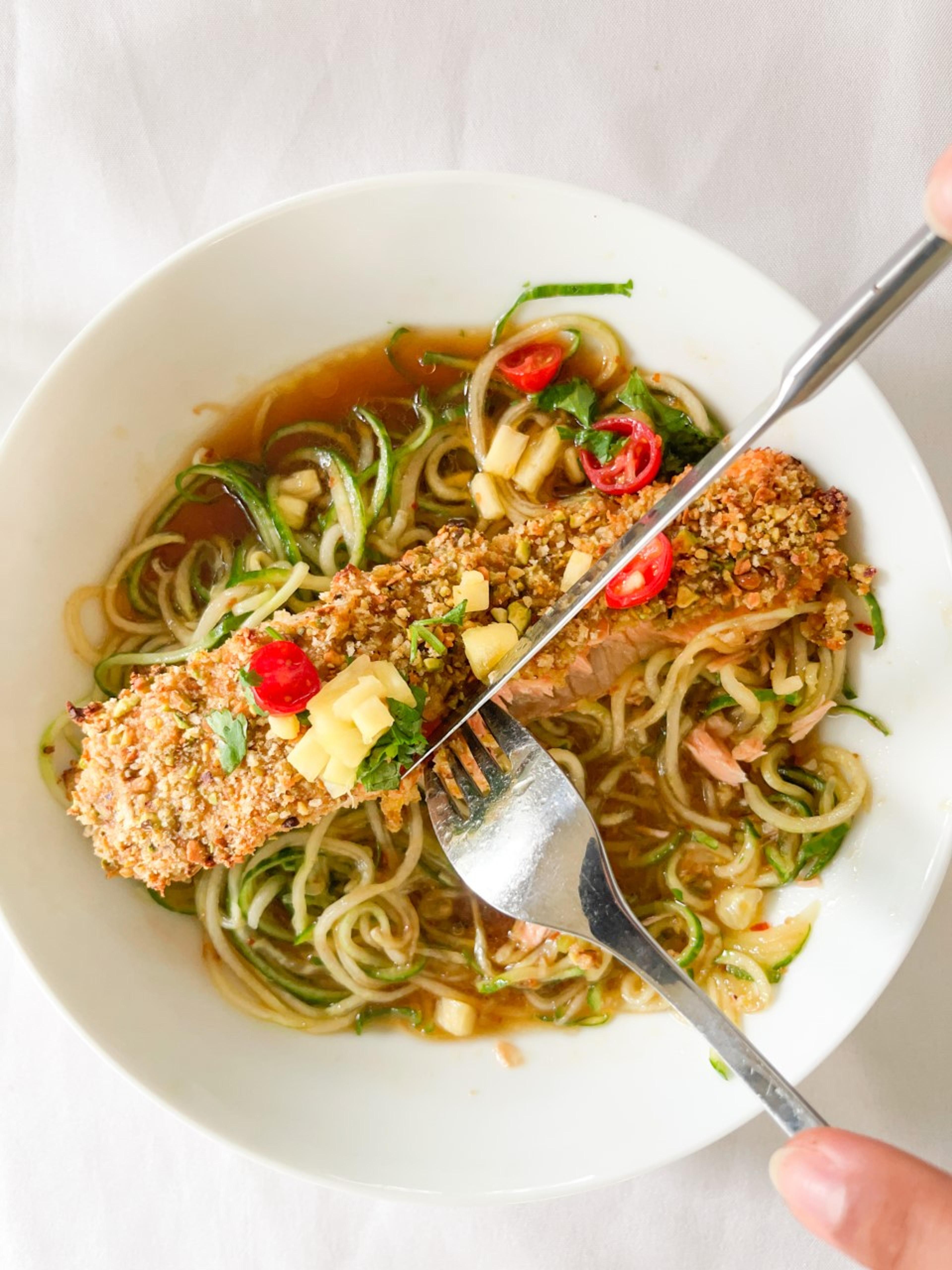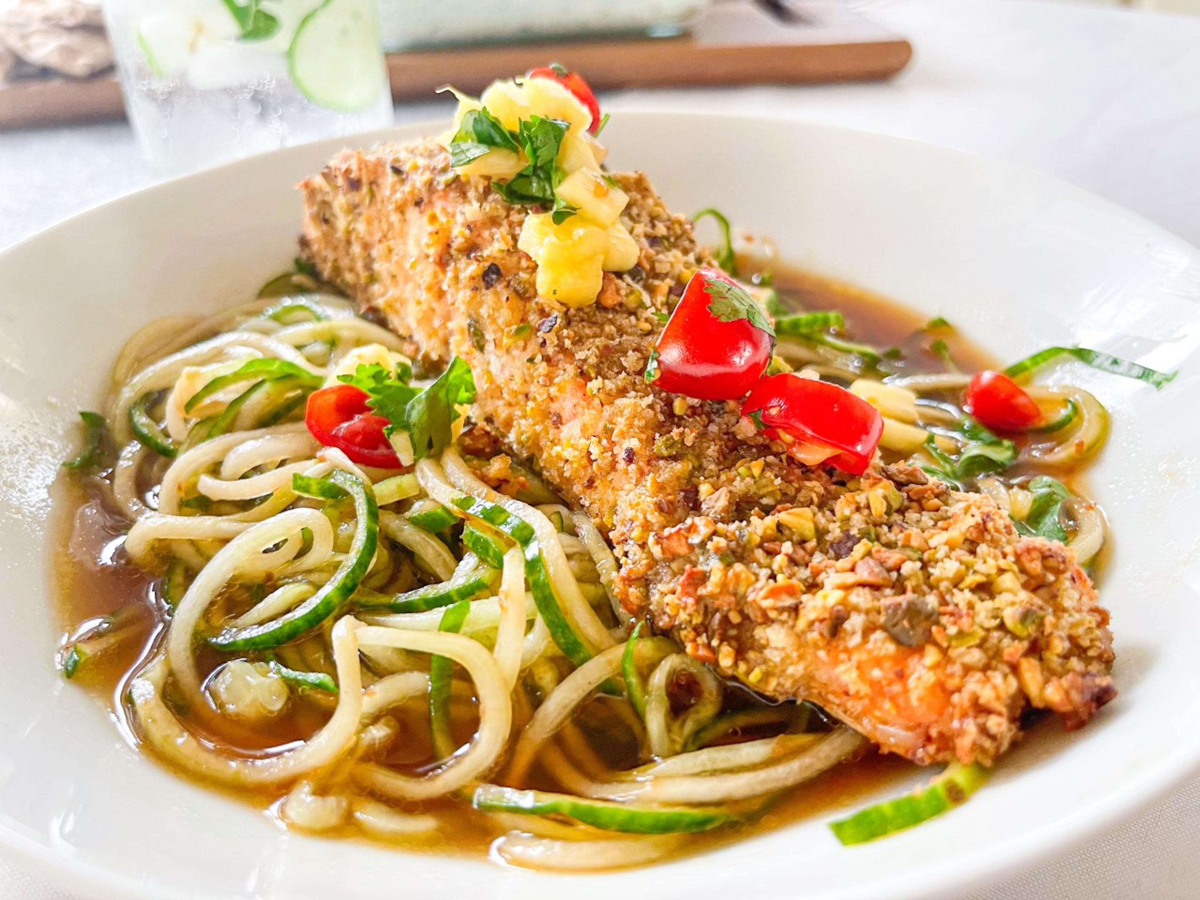 Spiralized Cucumber Salad with Pistachio Crusted Salmon and Pineapple Salsa