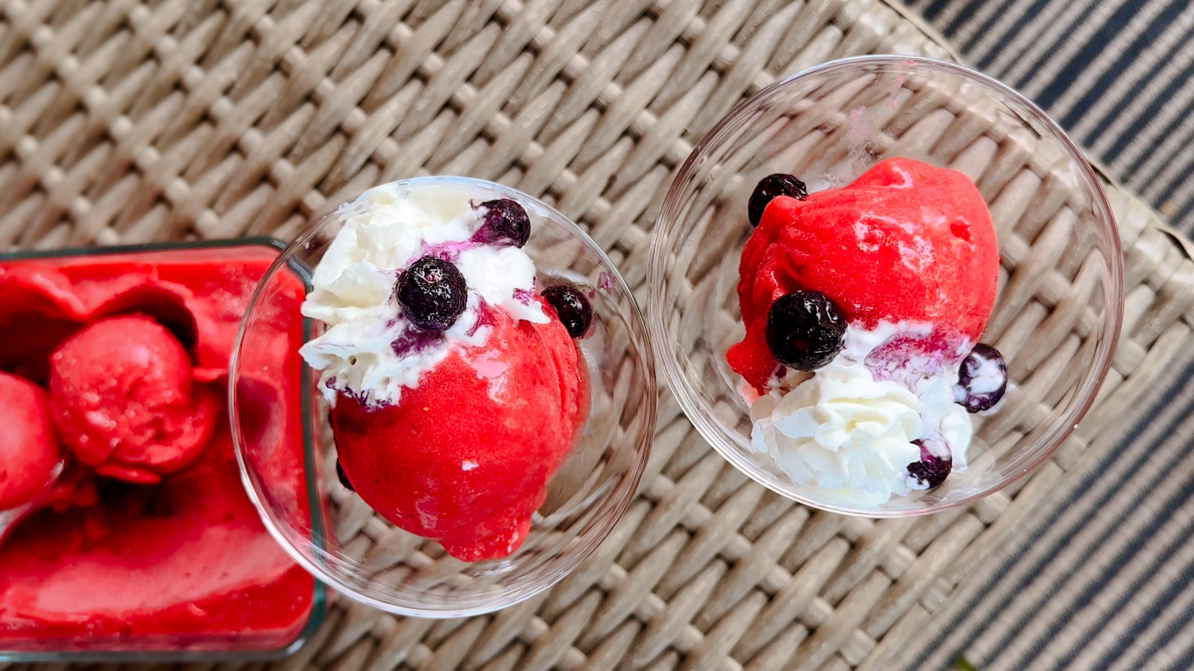 2. Once the texture is smooth, place in a freezer-safe dish that has a secure lid. Serve with fresh berries and a dollop of whipped cream. Alternatively, it can be frozen to be enjoyed later.