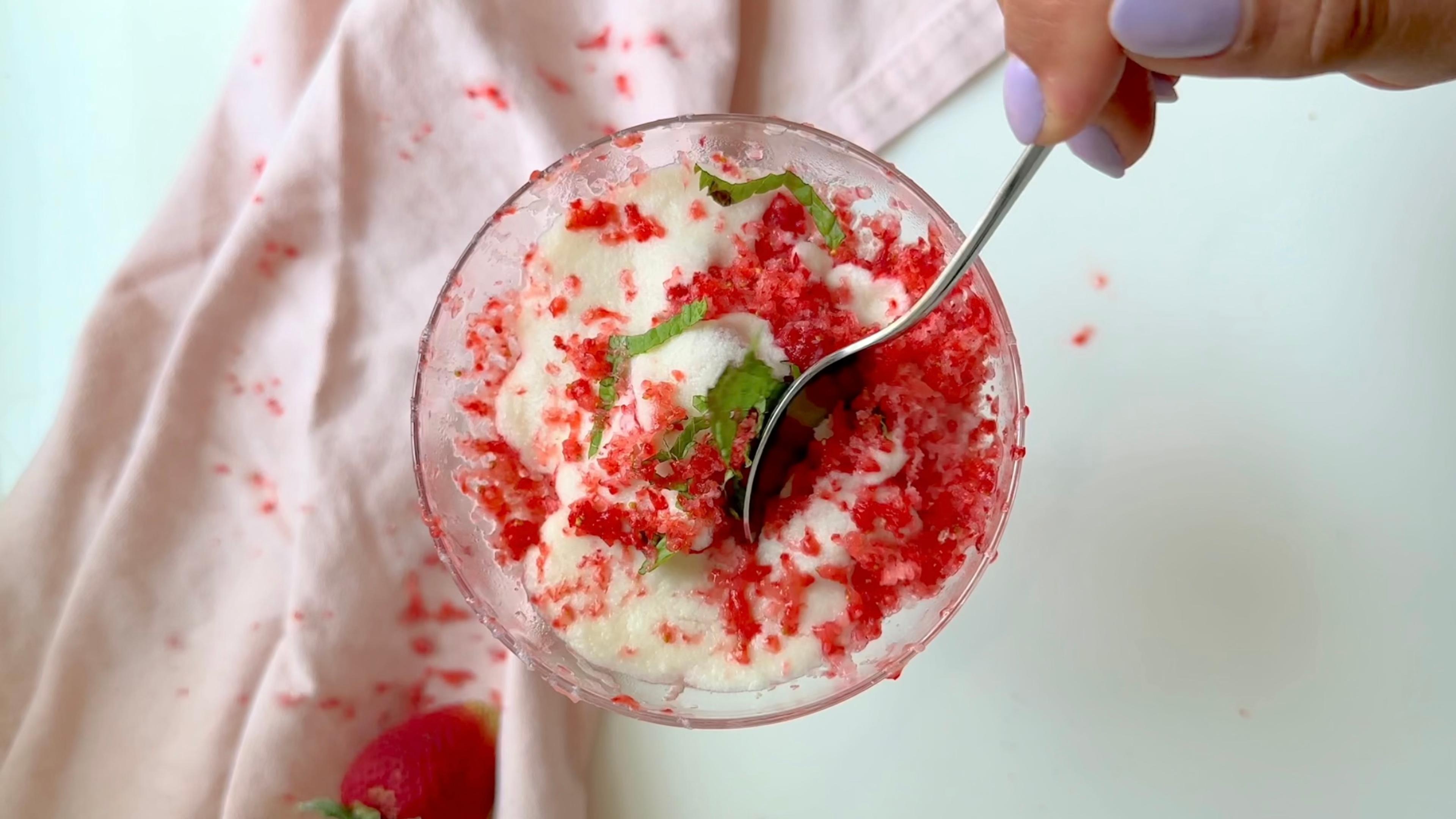 Skip the sugar-laden ice cream and opt for a naturally sweet, antioxidant-rich dessert. This shaved frozen fruit treat relies on the natural sweetness of ripe seasonal strawberries. Strawberries are loaded with vitamin C, fiber and phytonutrients that support heart health and reduce inflammation. After a simple prep of freezing the fruit, it comes together in less than 5 minutes by simply grating and adding toppings.