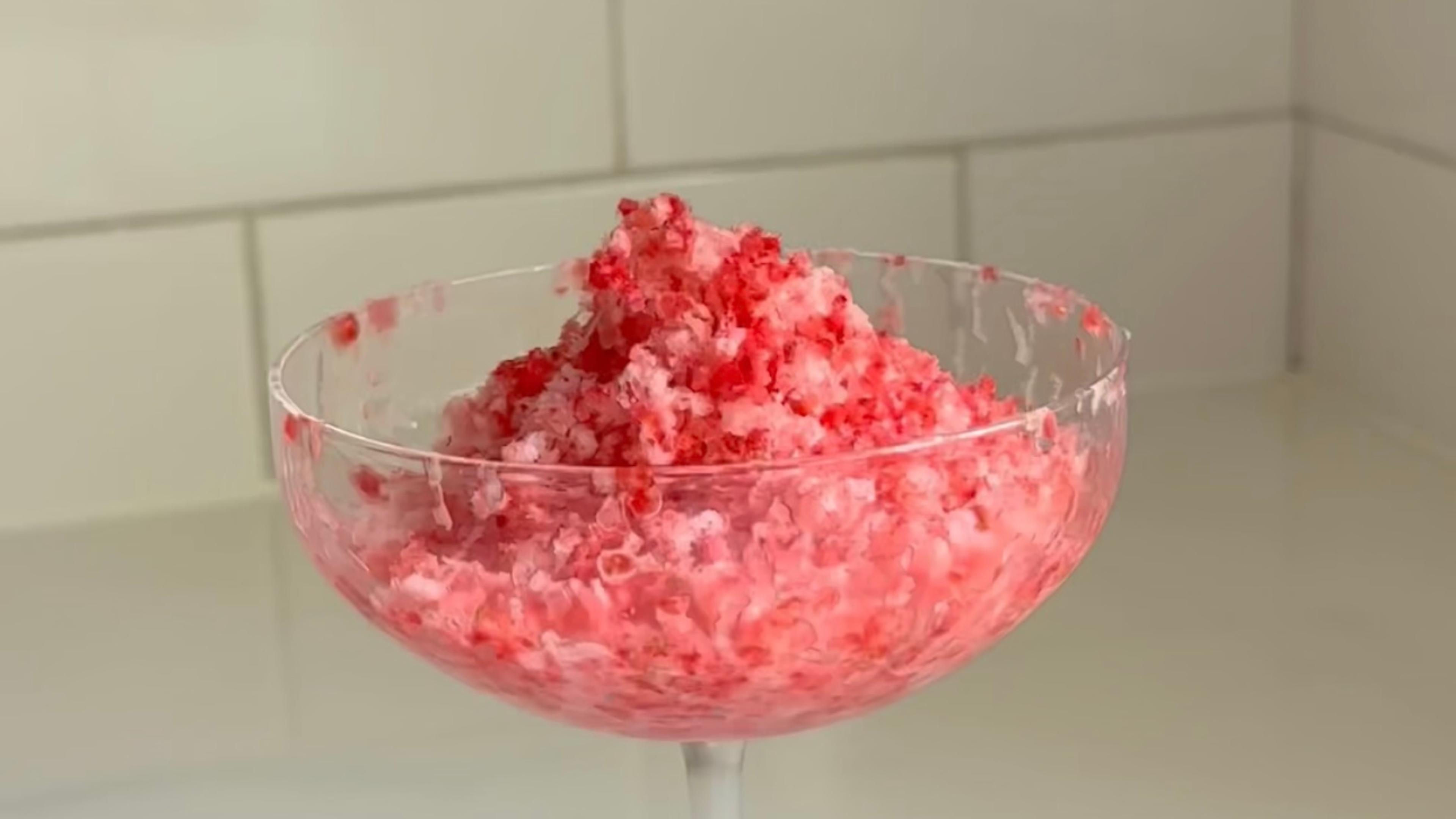 Over a serving bowl, prepare a single serving using a grater to grate 5-6 frozen strawberries.