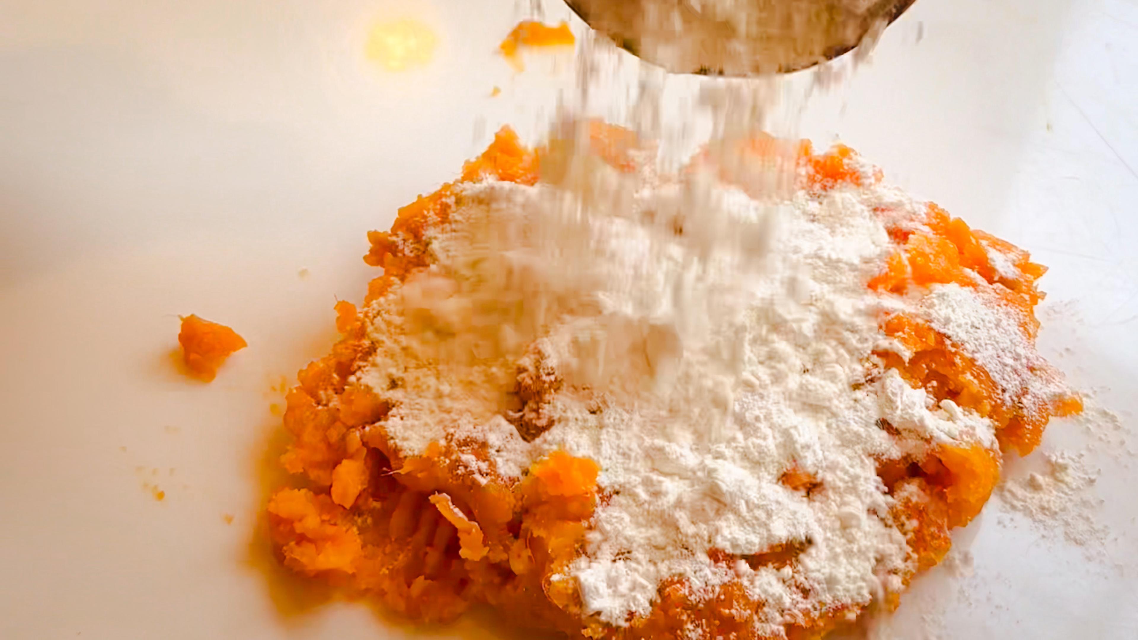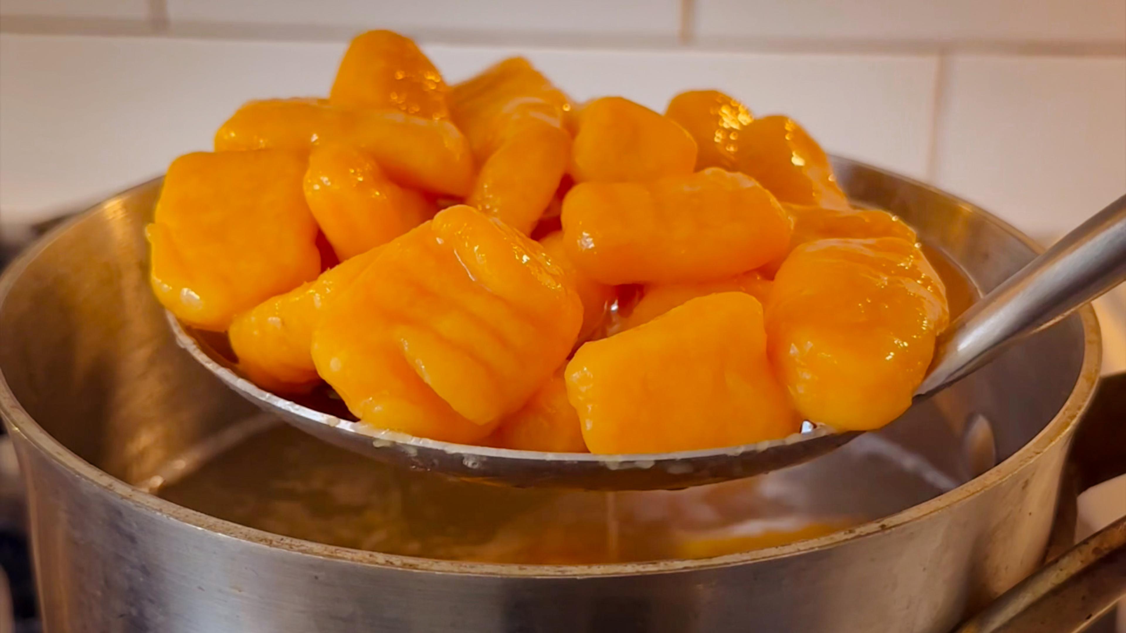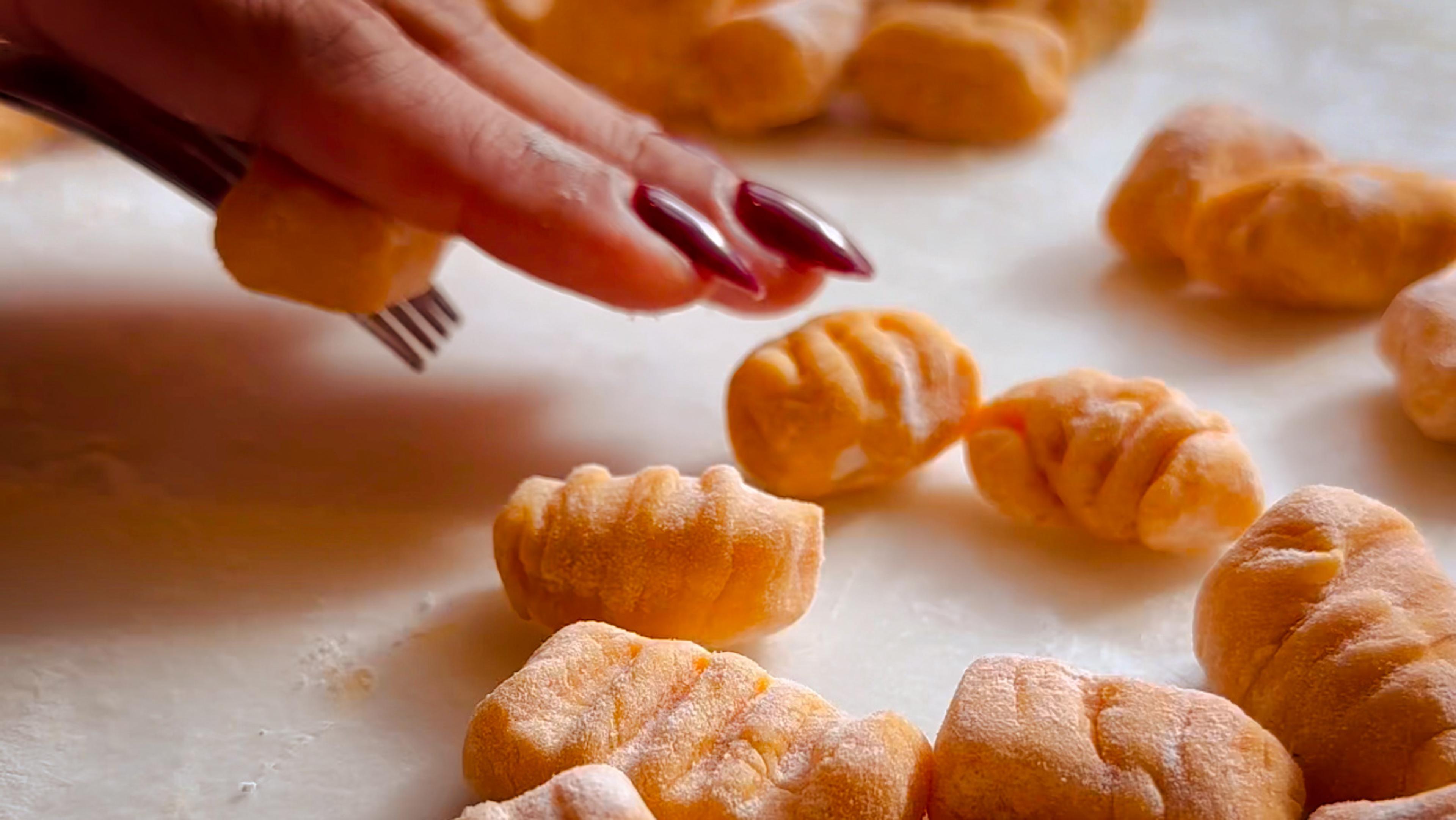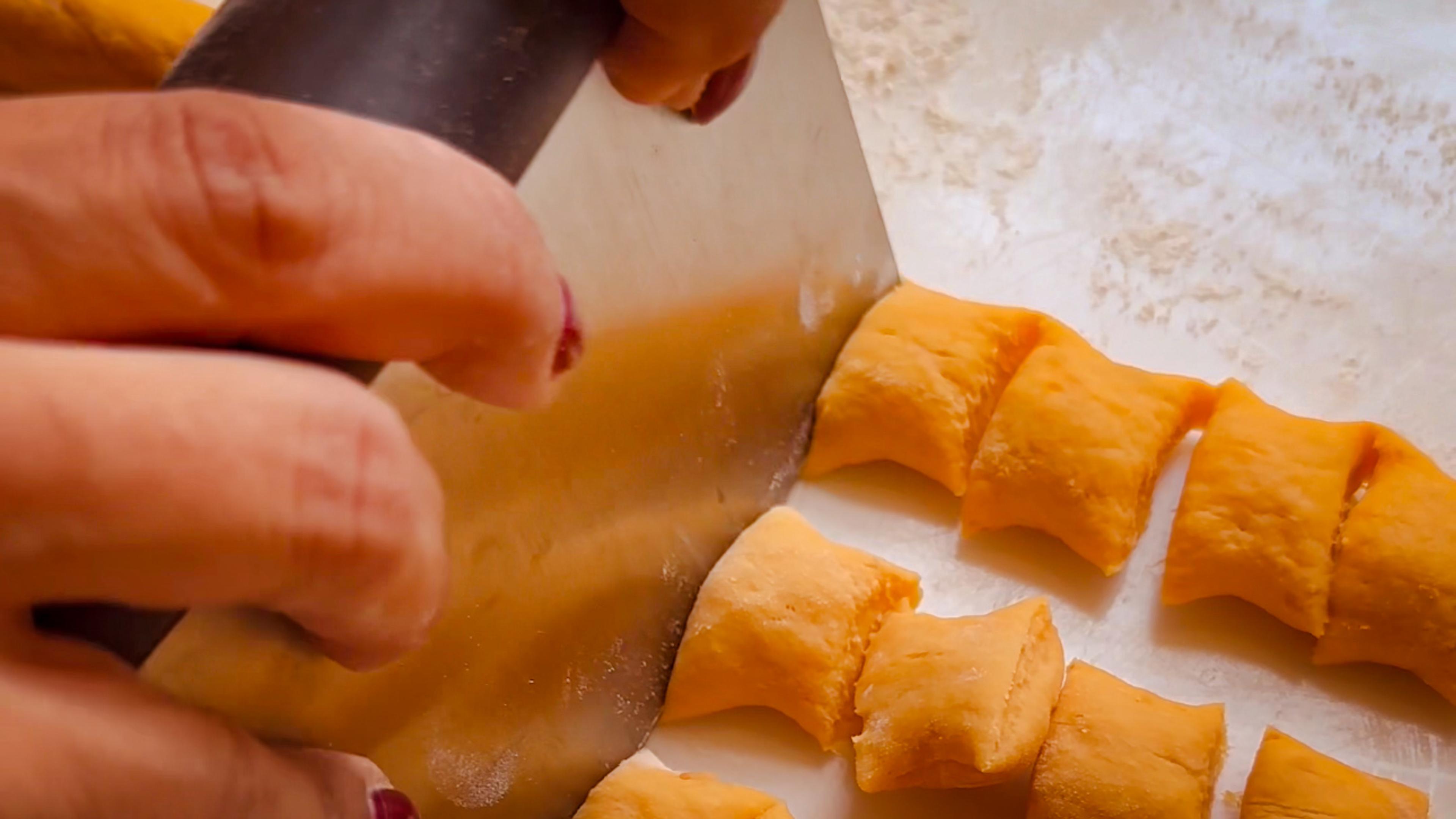Cut dough into 4 pieces, roll out into long ropes, then cut into small pillow-shaped gnocchi (about 1/2 inch or 1 cm in size).