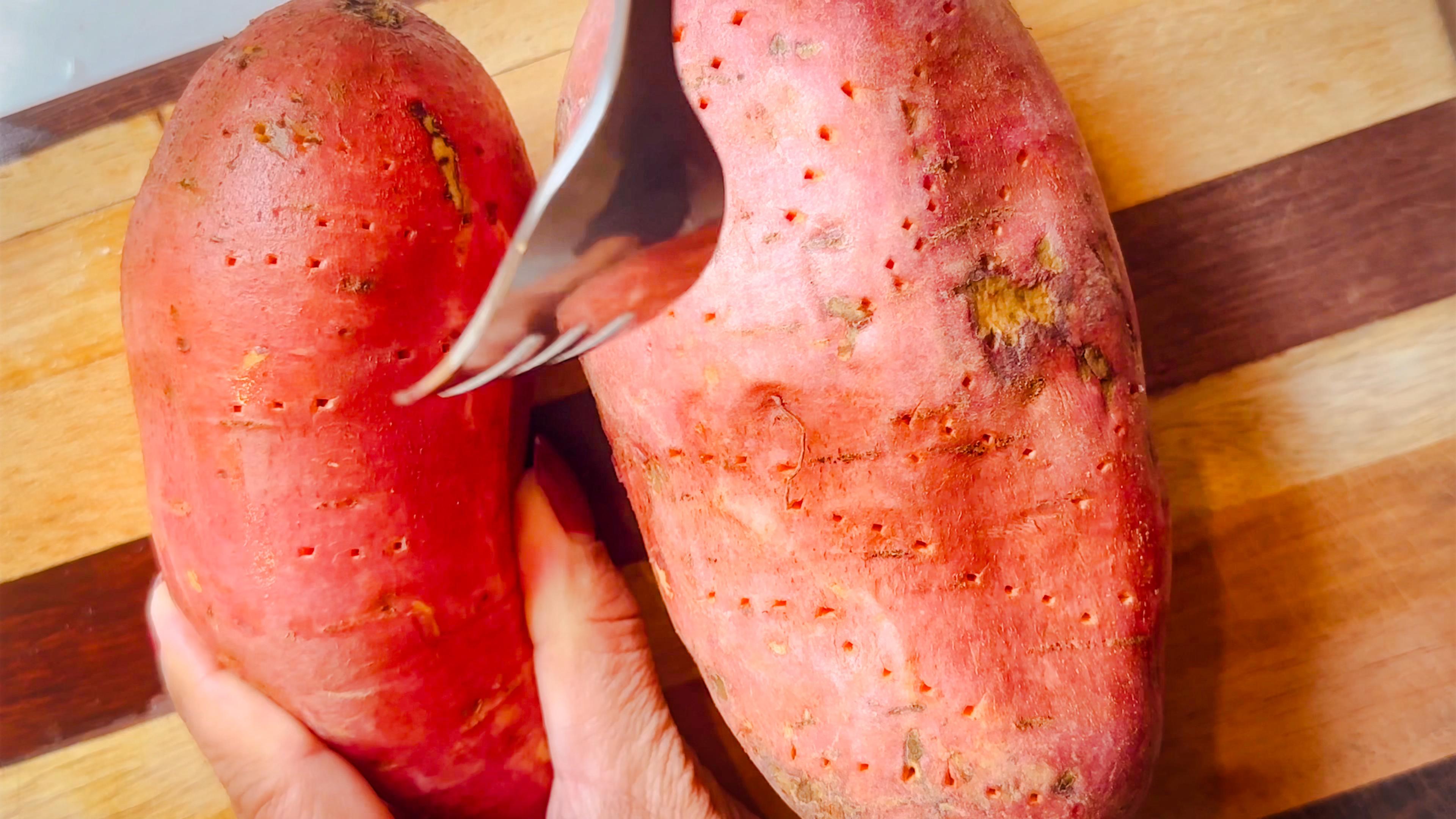 Prick sweet potatoes with a fork and microwave them for 7-10 minutes until tender.