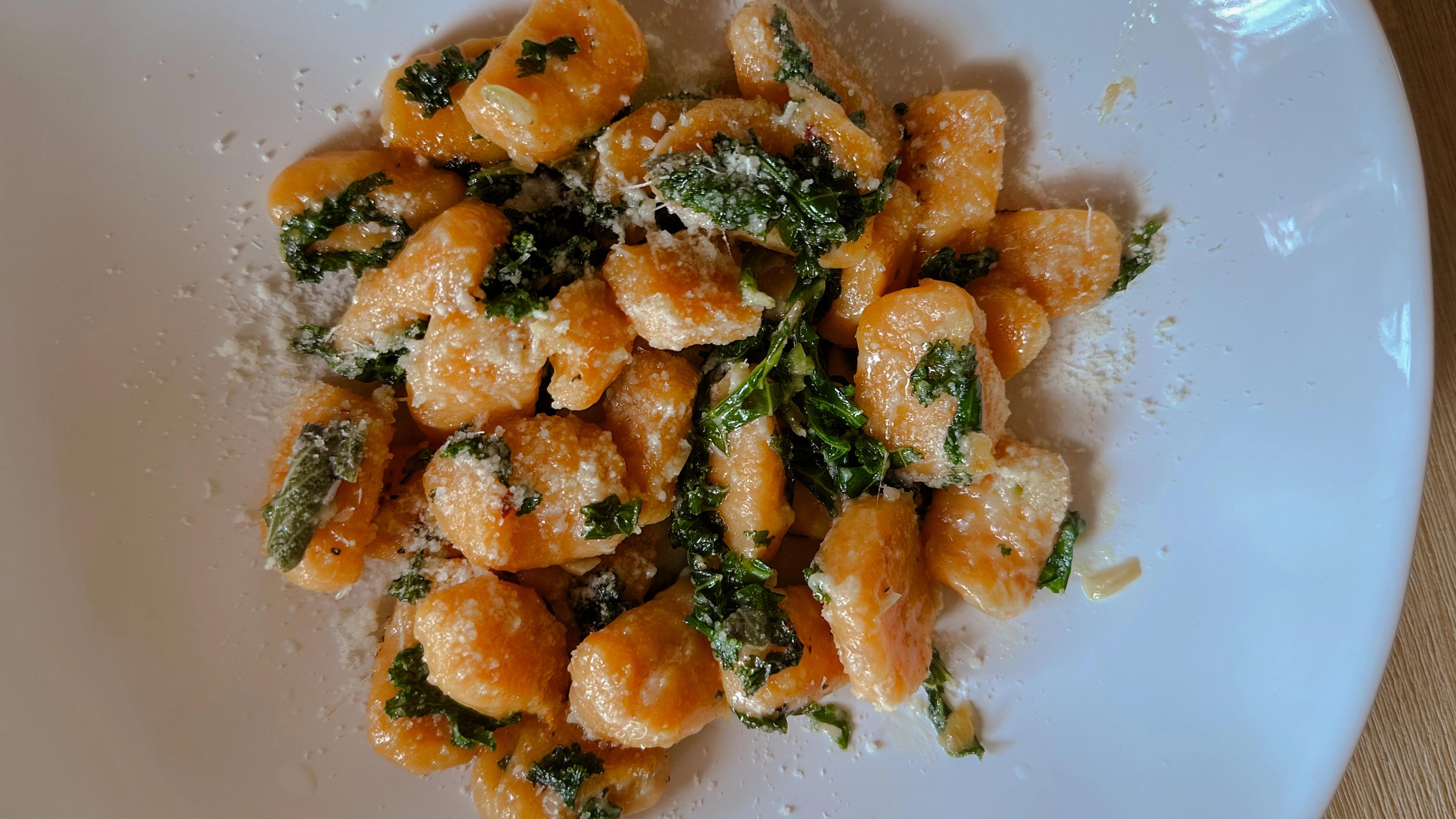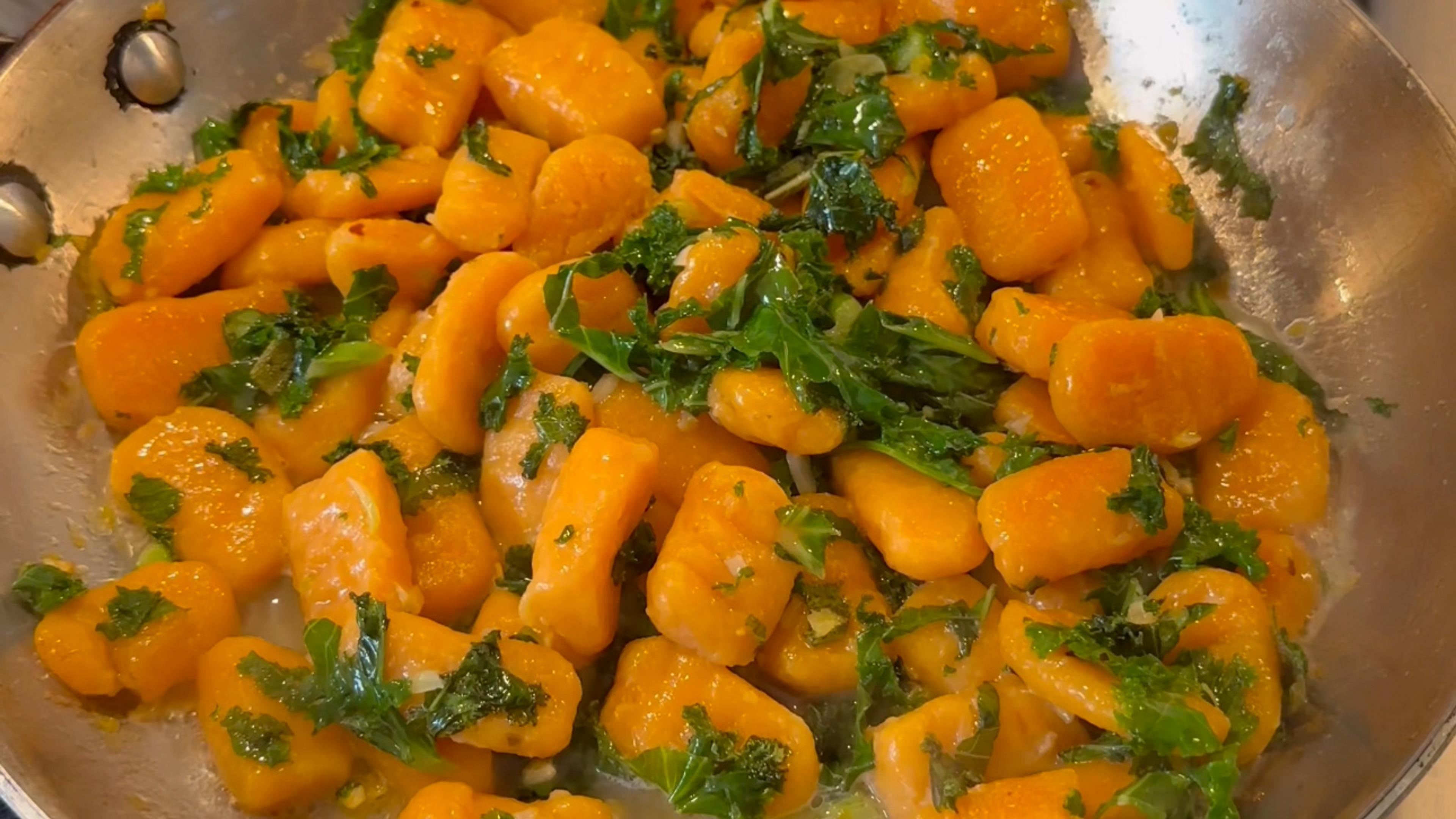 Stir in kale until softened. Add a couple of spoonfuls of pasta water to sauce, careful not to add too much. Add gnocchi to sauce along with salt and pepper to taste.