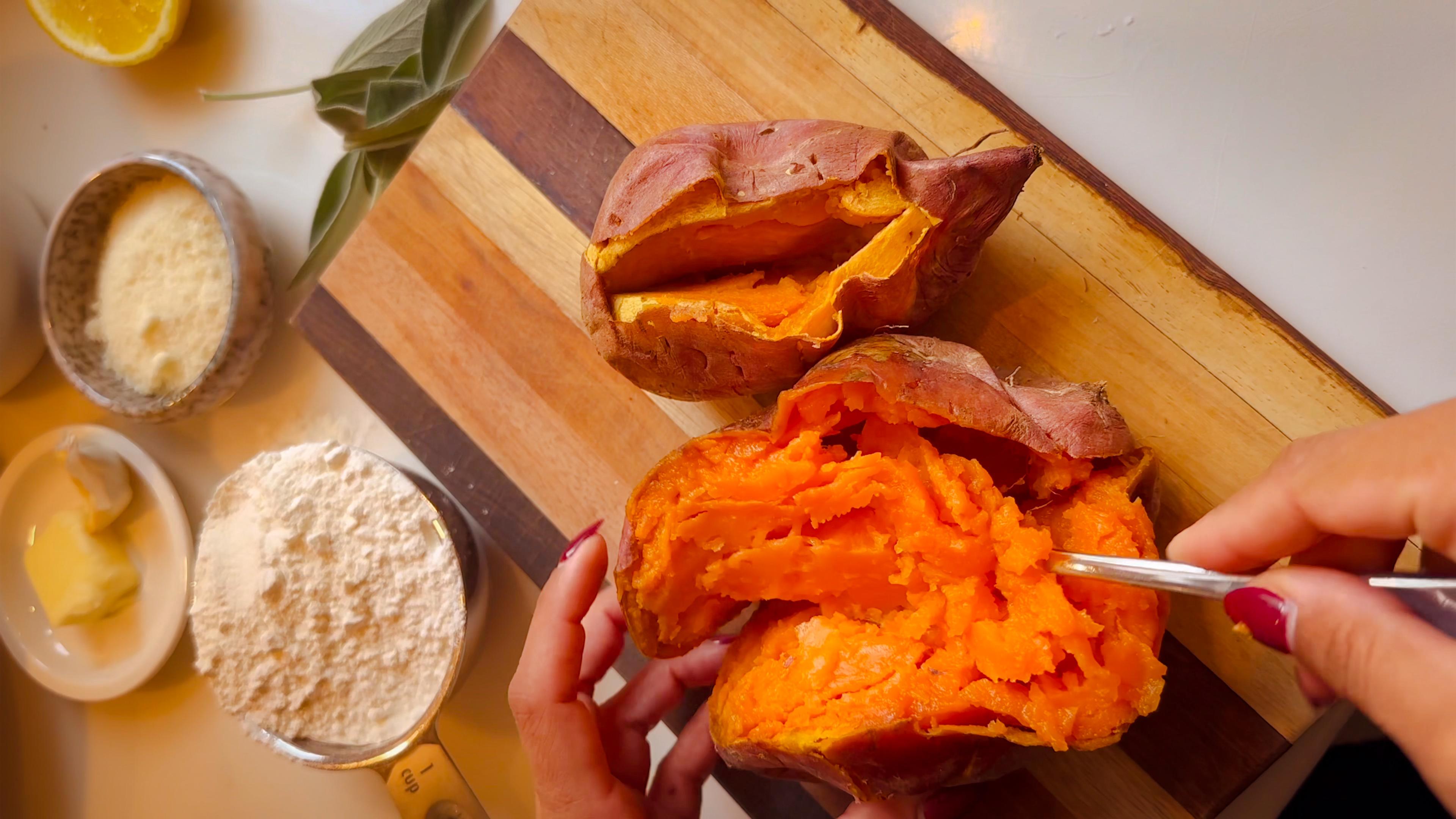 Cut them in half, scoop out the flesh, add it to a bowl, and mash with a fork.