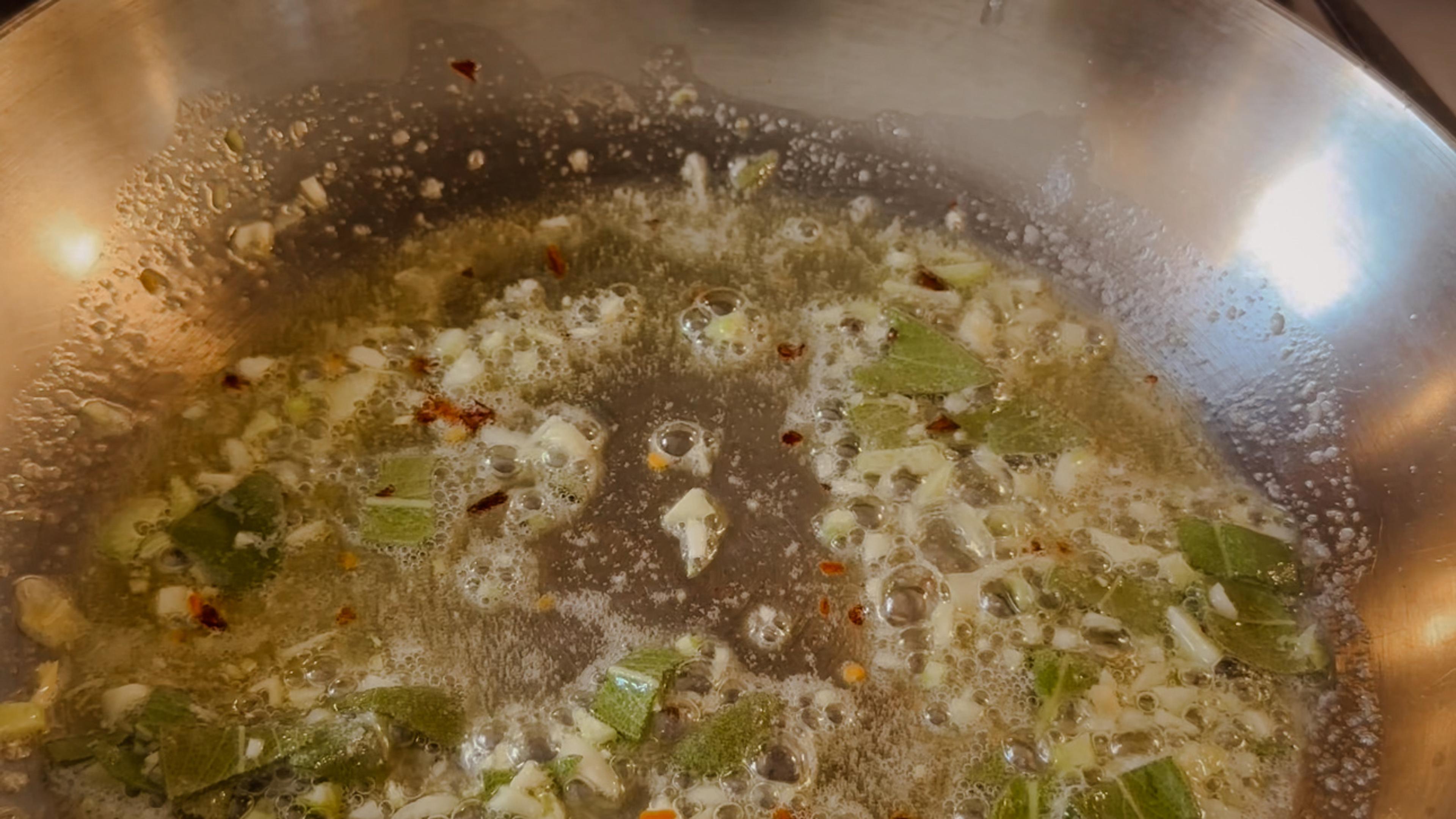 Make the sauce. Heat olive oil and butter in a skillet over medium-low heat. Once warm, add garlic and sage leaves and cook until fragrant, about 1-2 minutes.