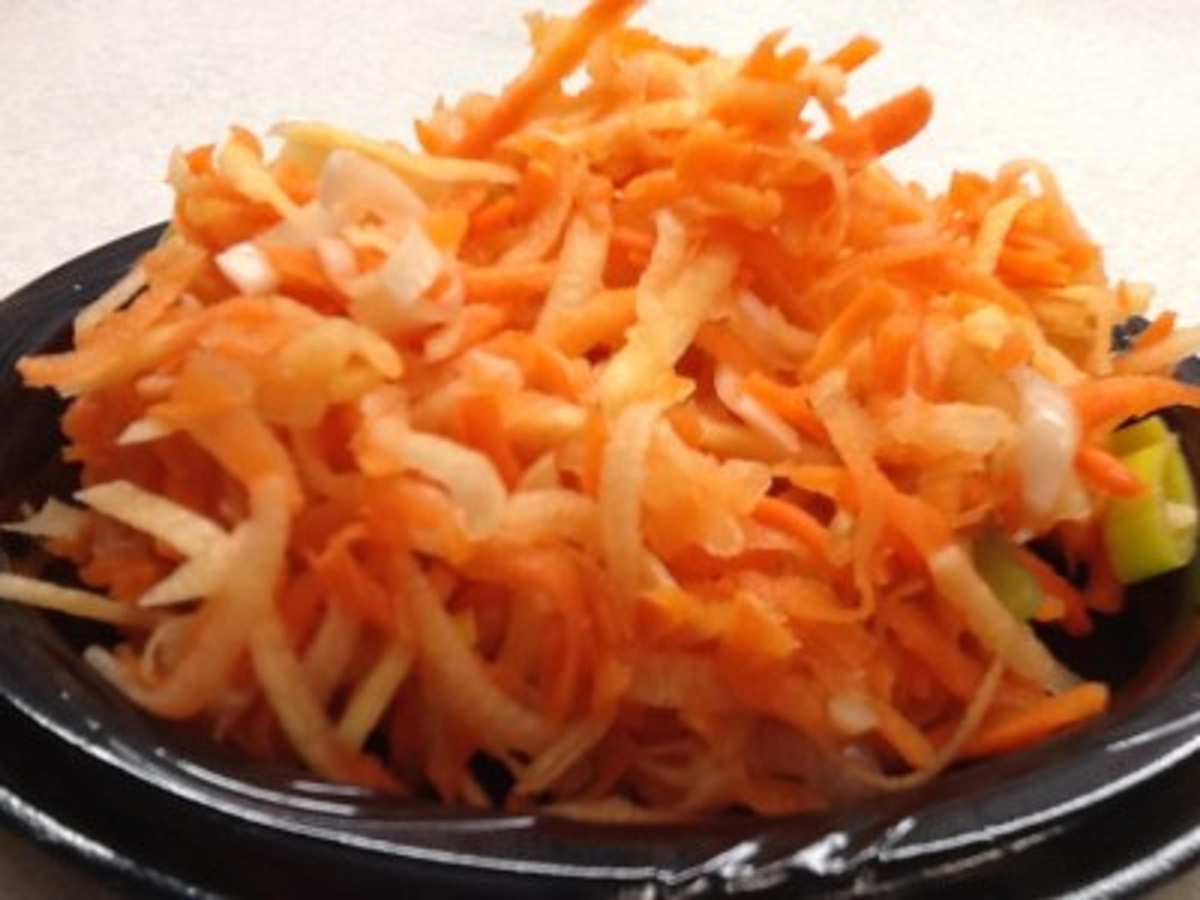 Peel the carrots and rutabaga and grate using a food processor. Slice leeks and combine with carrots and rutabaga in a large bowl, tossing well to combine.