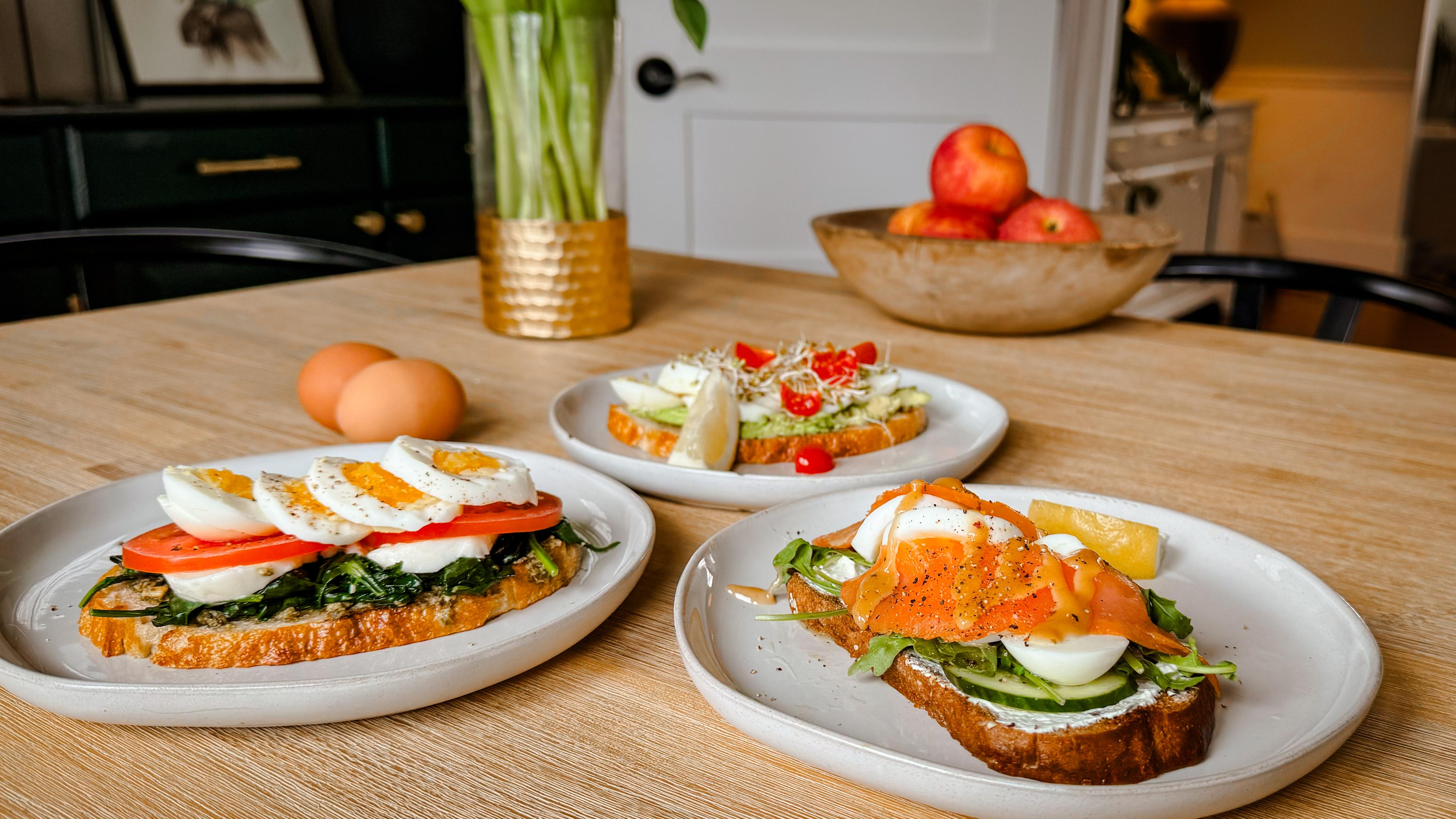 This toast features Scandinavian influence of flavors including rye bread, smoked salmon with lemon, peppery arugula, crisp English cucumber and mustard. Sliced eggs add an extra pop of protein to help keep you full until your next meal.