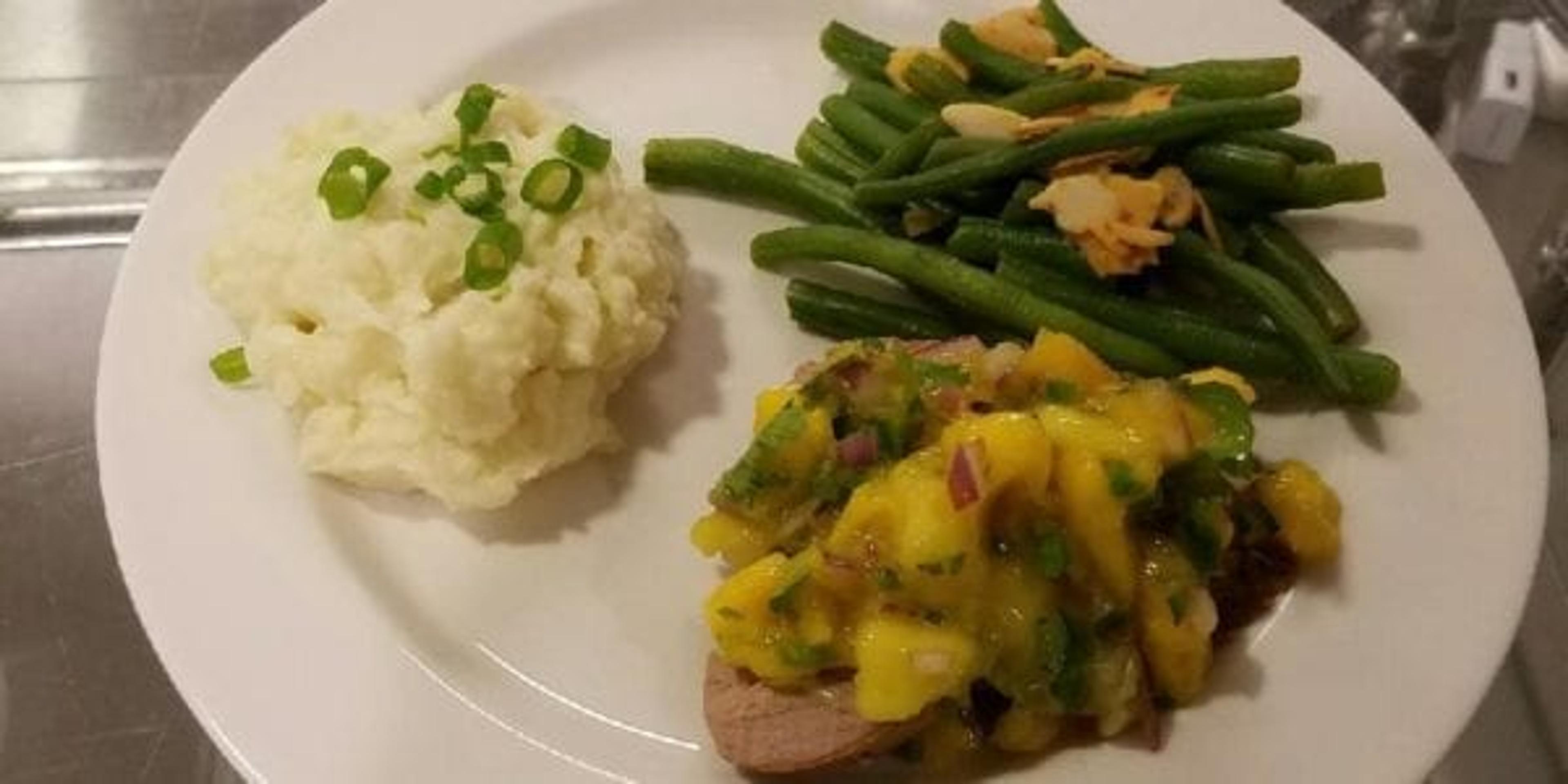 Real Men Can Cook: Tropical Pork Picante with Whipped Cauliflower and Green Beans Amandine