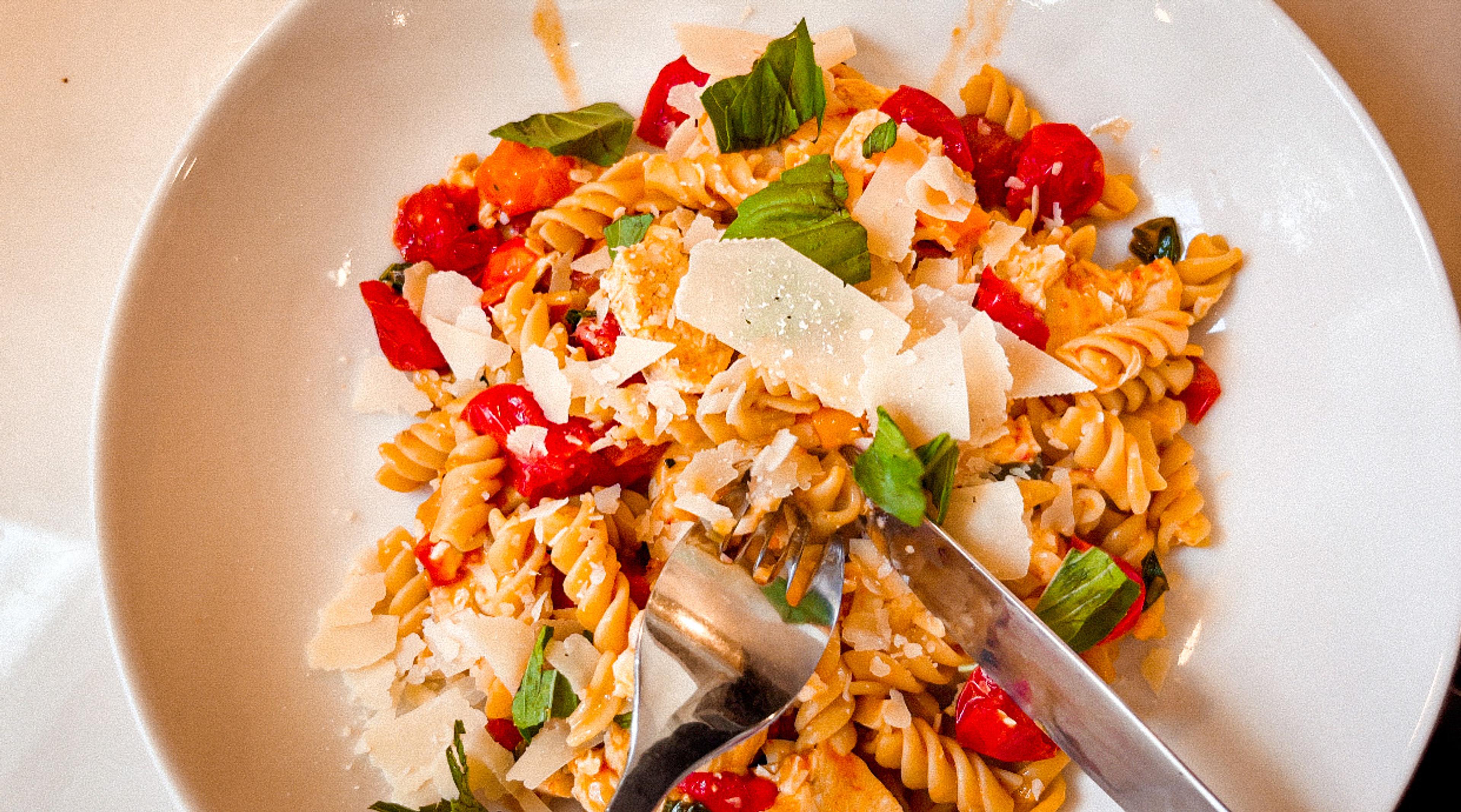 Stir in the spinach and cook until reduced in size. Stir in cooked chickpea pasta. Add salt and pepper to taste and stir. Serve in a bowl and top with parmesan cheese and basil. Enjoy!