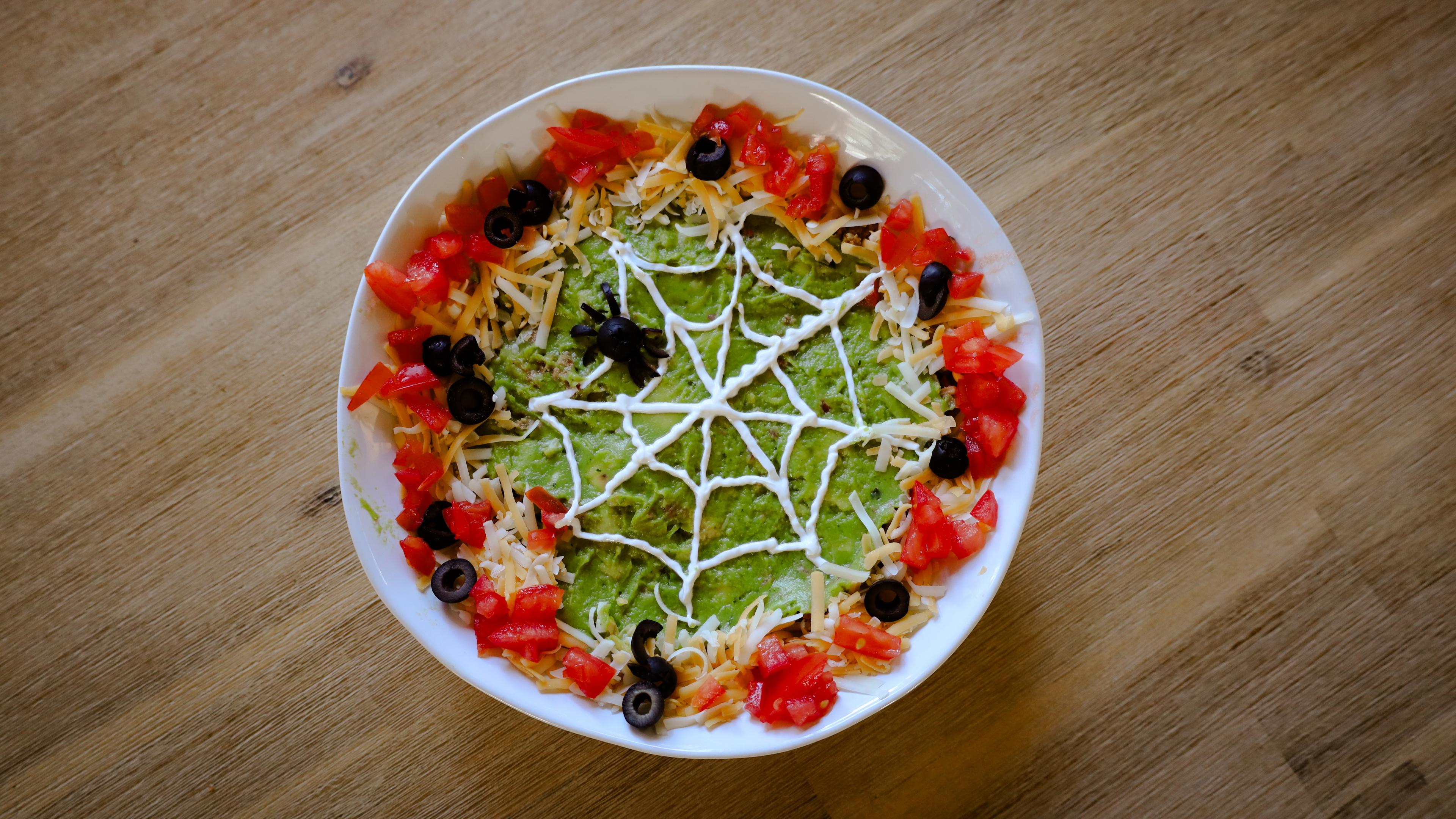 Add sour cream to a plastic or piping bag. Cut a small hole in the corner. Draw a spider web in the middle of the guacamole.