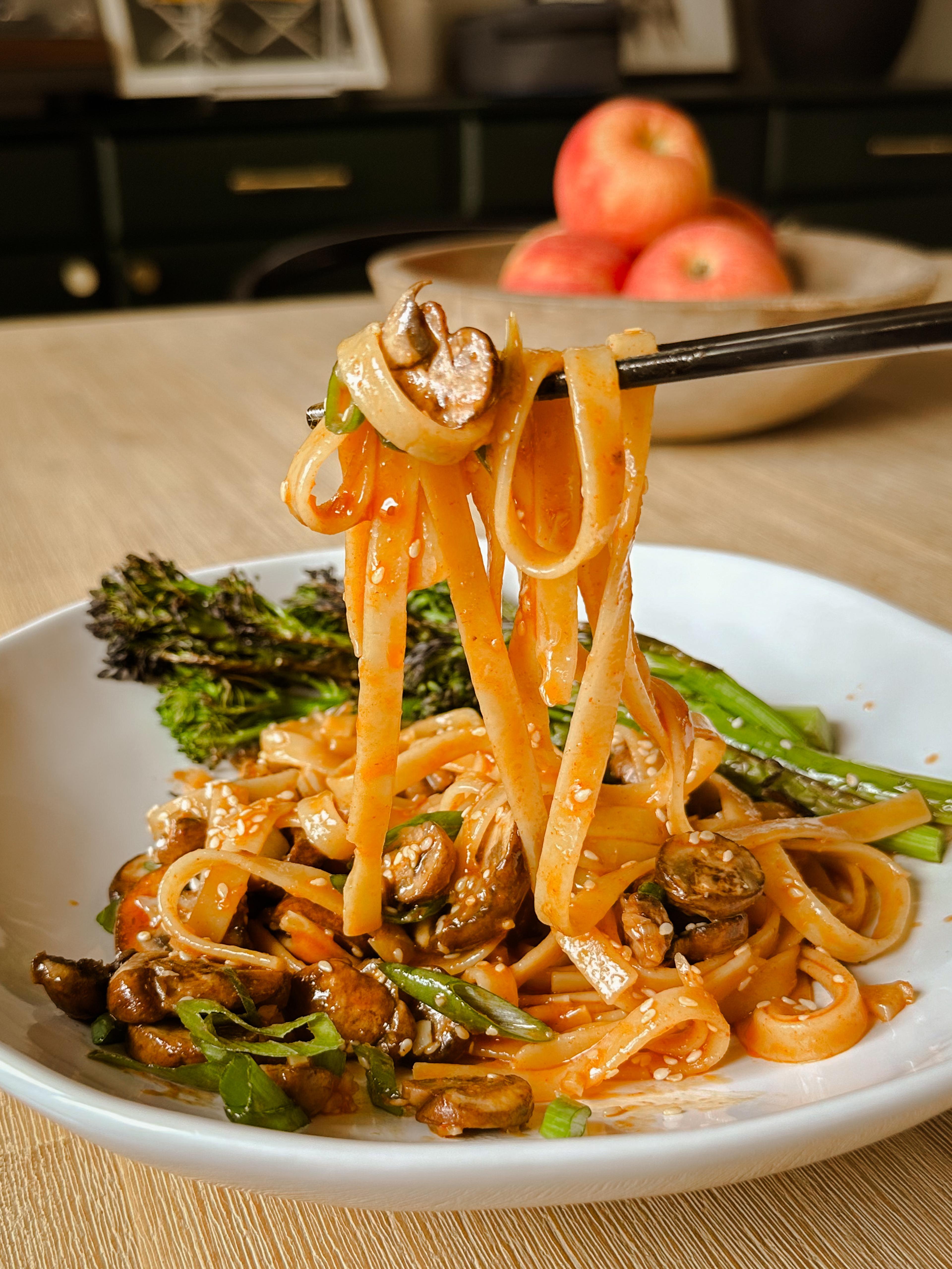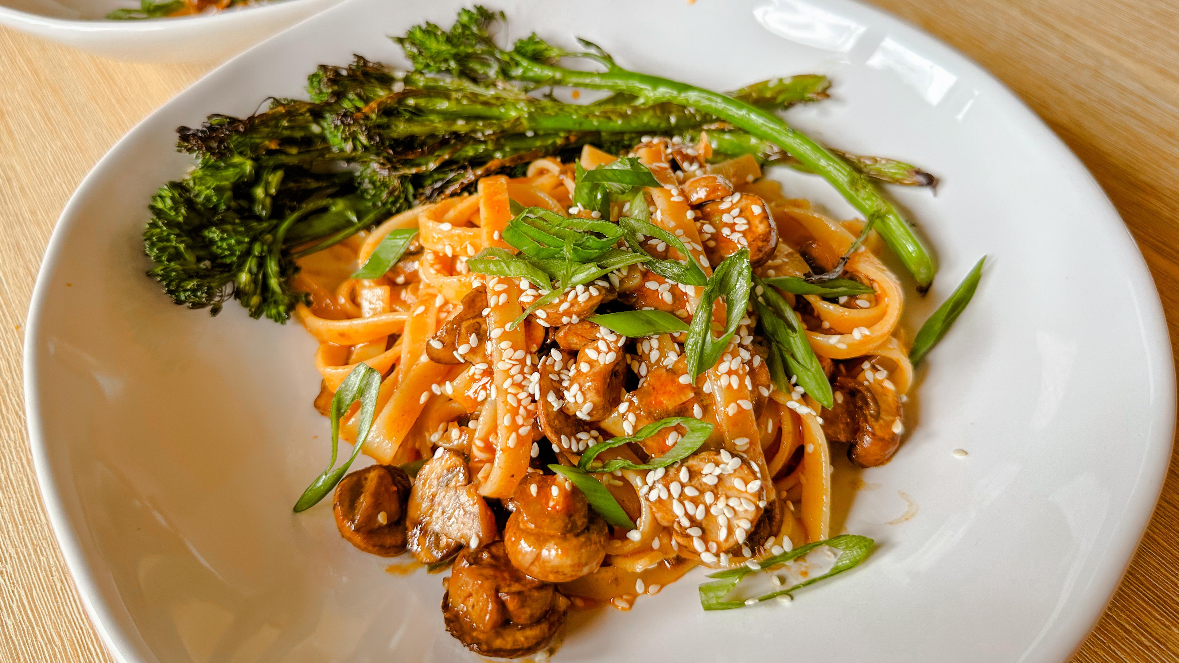 This recipe showcases the famous Korean spicy-sweet paste, gochujang, heart-healthy olive oil, a hint of honey and plenty of garlic. The result is a delicious sauce that coats fettuccine noodles.