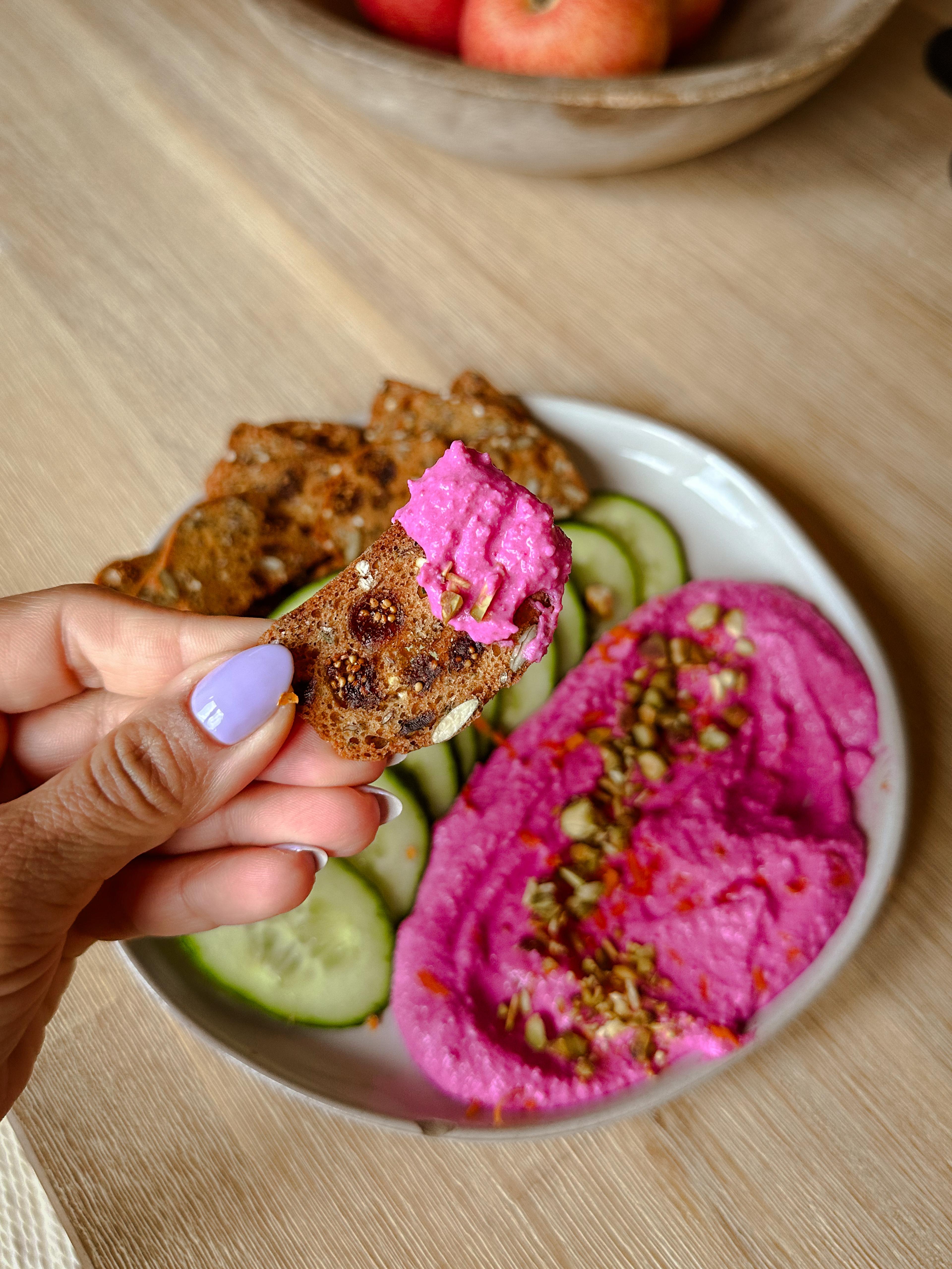 This vibrant recipe is perfect for spring entertaining. Greek yogurt, which is rich in calcium, vitamin D, probiotics and protein, serves as a creamy base for this dip. Beets add a bright pink color as well as antioxidants.