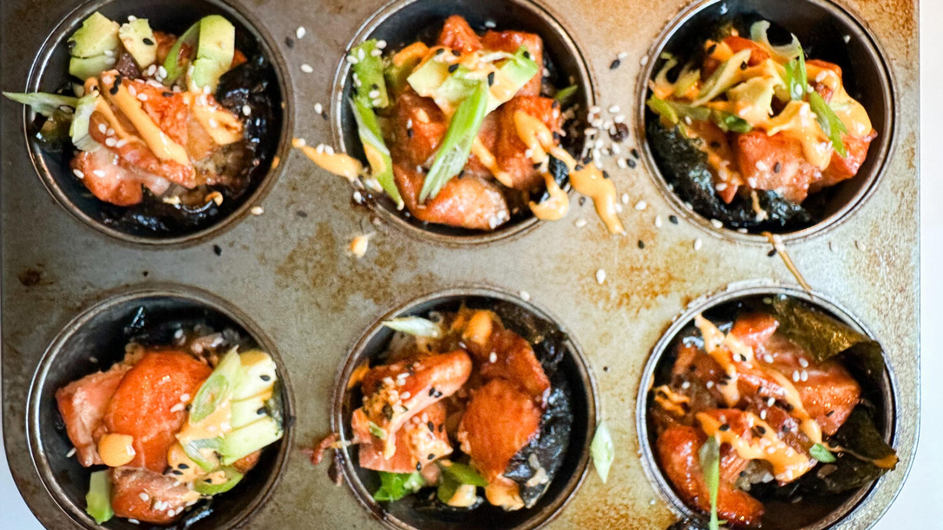 Cut each nori square into 4 pieces. Spray a muffin tin with oil. Add a spoonful of rice, about 3 tablespoons, to the nori square and press into the muffin shapes. Add a scoop of salmon on top, about 3 tablespoons. Bake for 8-10 minutes or until salmon is cooked through.
