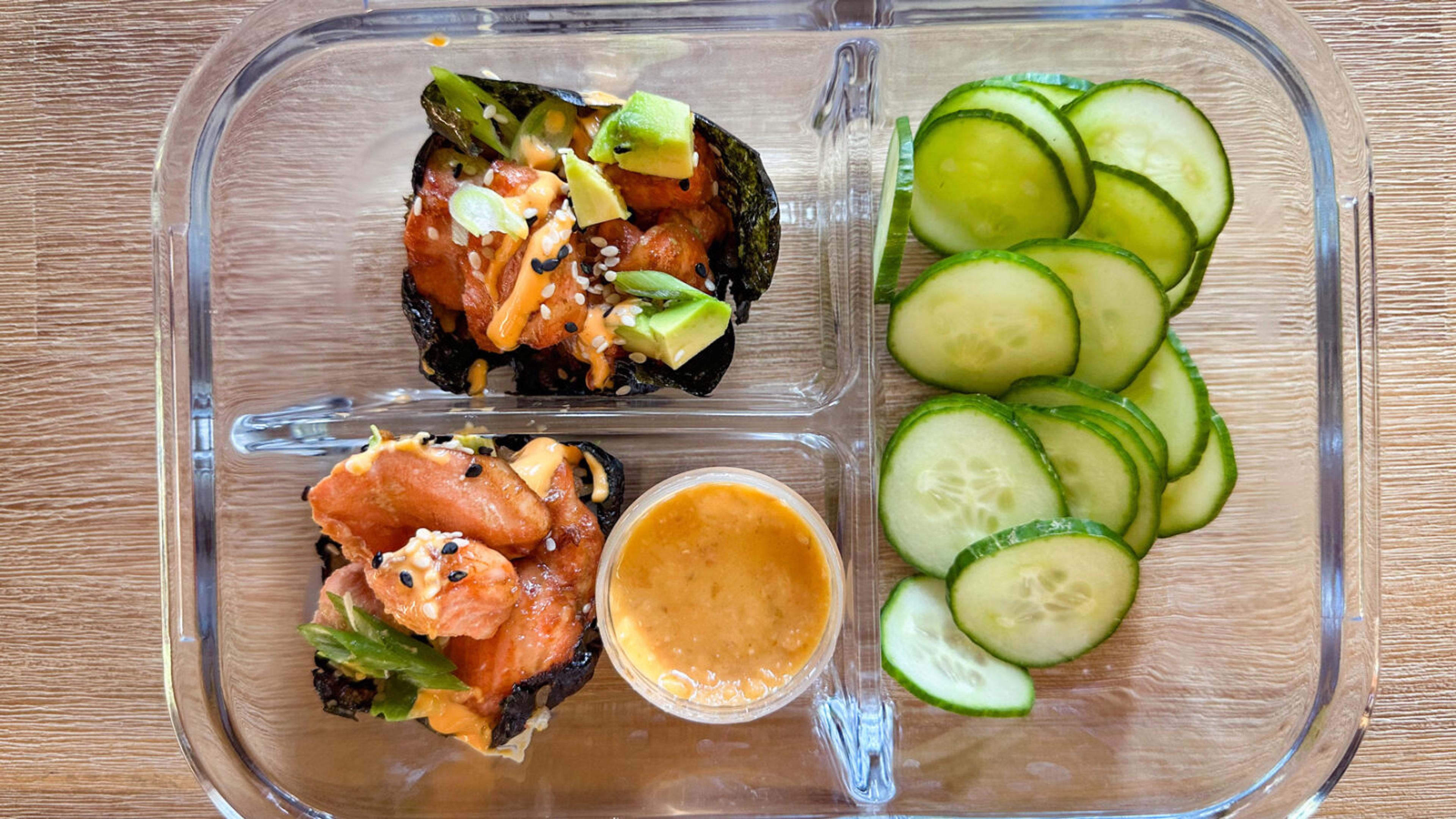Top the rice cups with avocado, green onion, sesame seeds and spicy mayo if desired. Serve with cucumber slices and ginger vinaigrette.