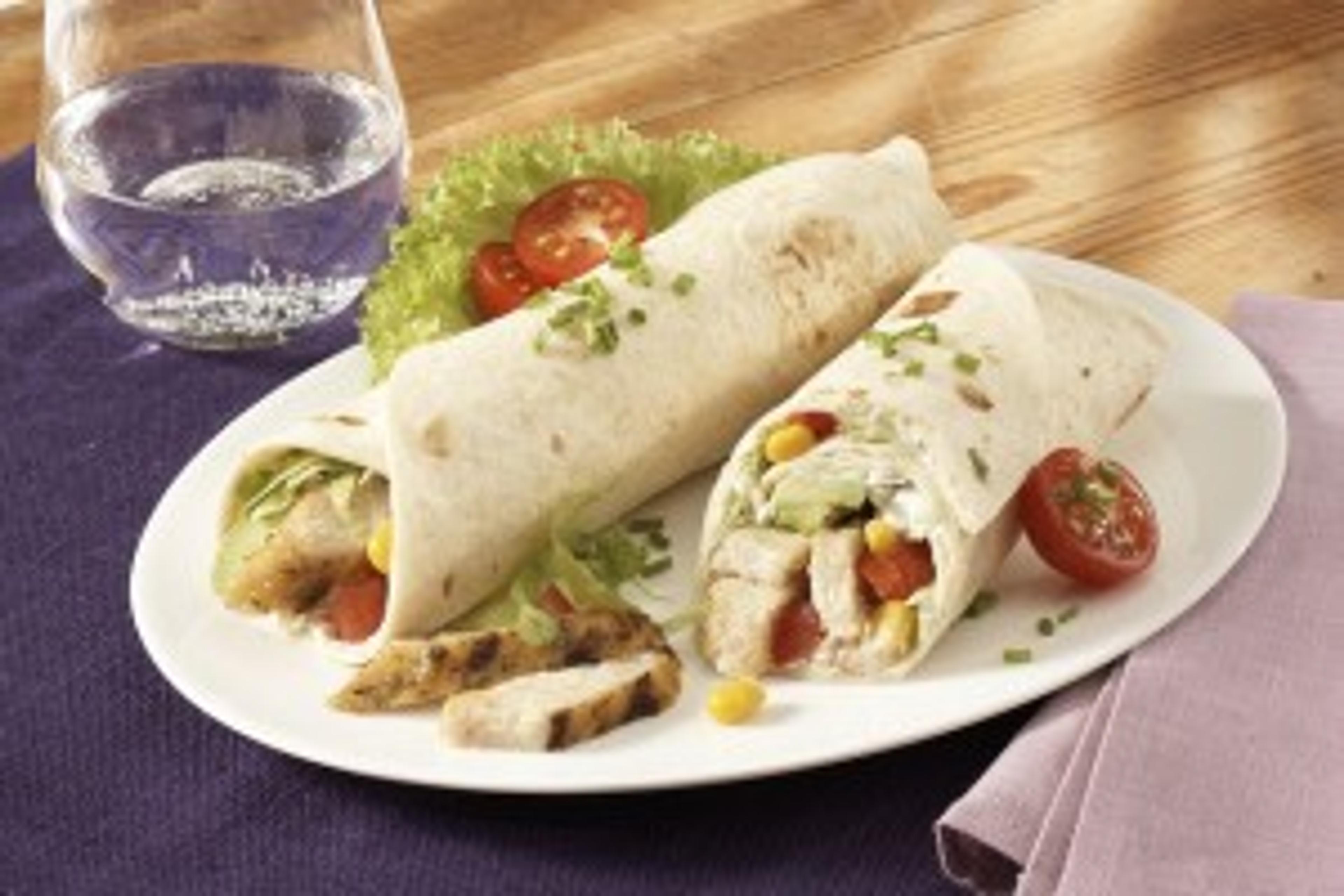 Place first 3 ingredients in a medium bowl; mash with a fork until smooth. Stir in tomato. Place 1 lettuce leaf on each tortilla; spread about 1/4 cup avocado mixture on each lettuce leaf. Top each serving with 1/2 cup Grilled Lemon-Herb Chicken. Roll up. Wrap in foil or parchment paper; chill.