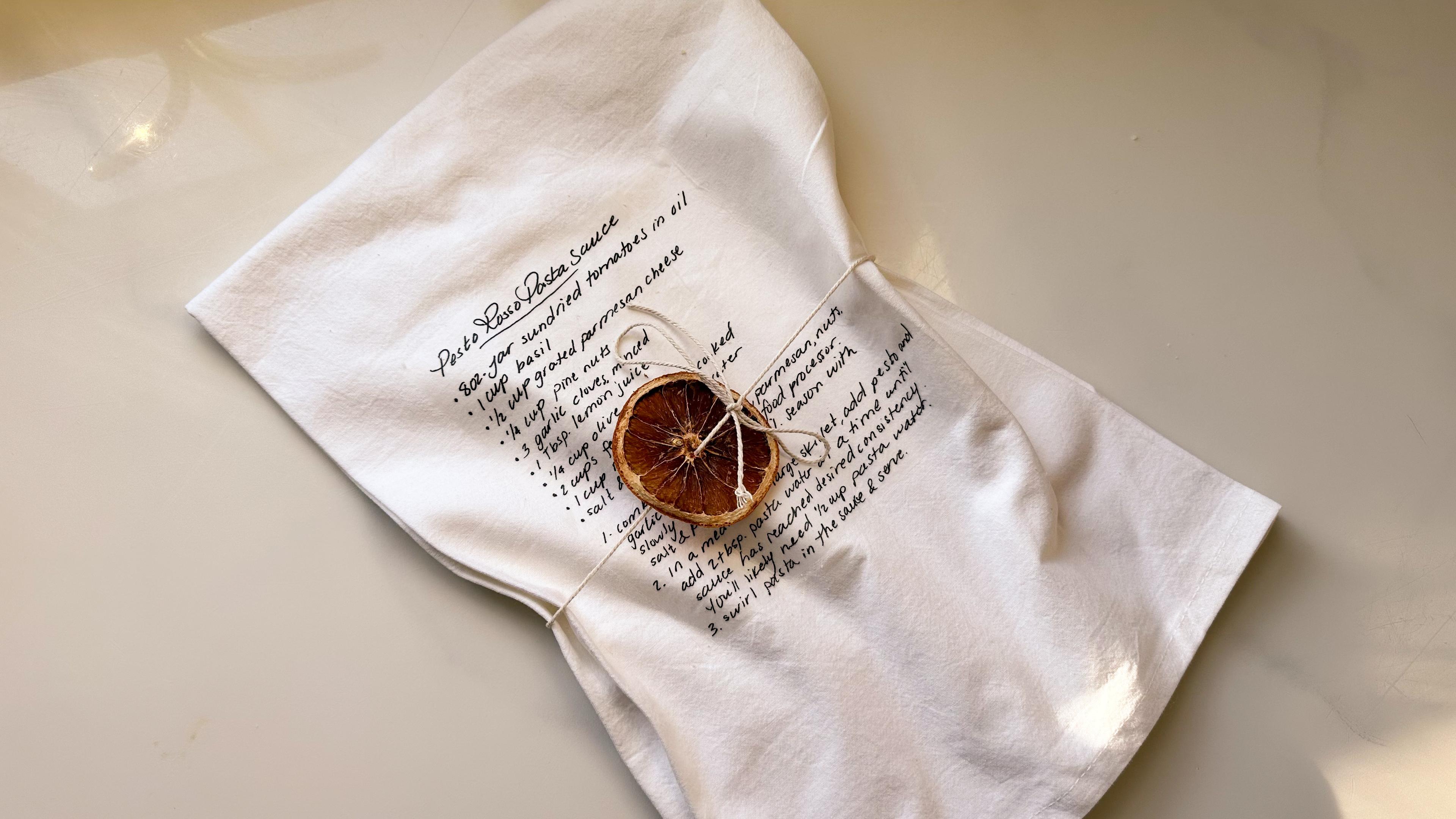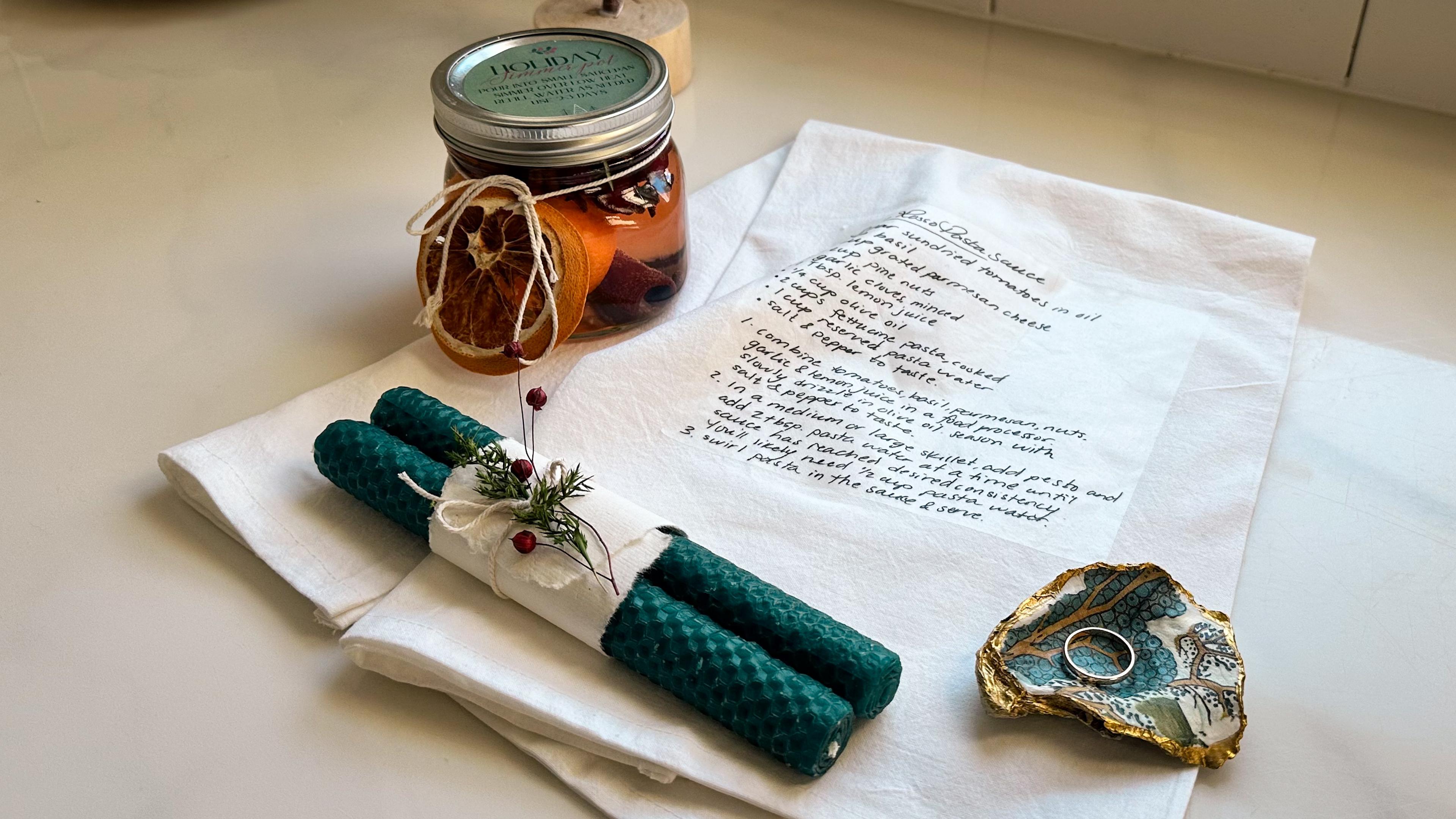 Whether a family member is still with us, or their memory lives on, handwritten recipes are special on their own. This gift idea features a handwritten recipe on a tea towel using the iron-on method found online or at local craft stores. Give it to several family members if buying a big pack of tea towels, or to someone as a unique gift.