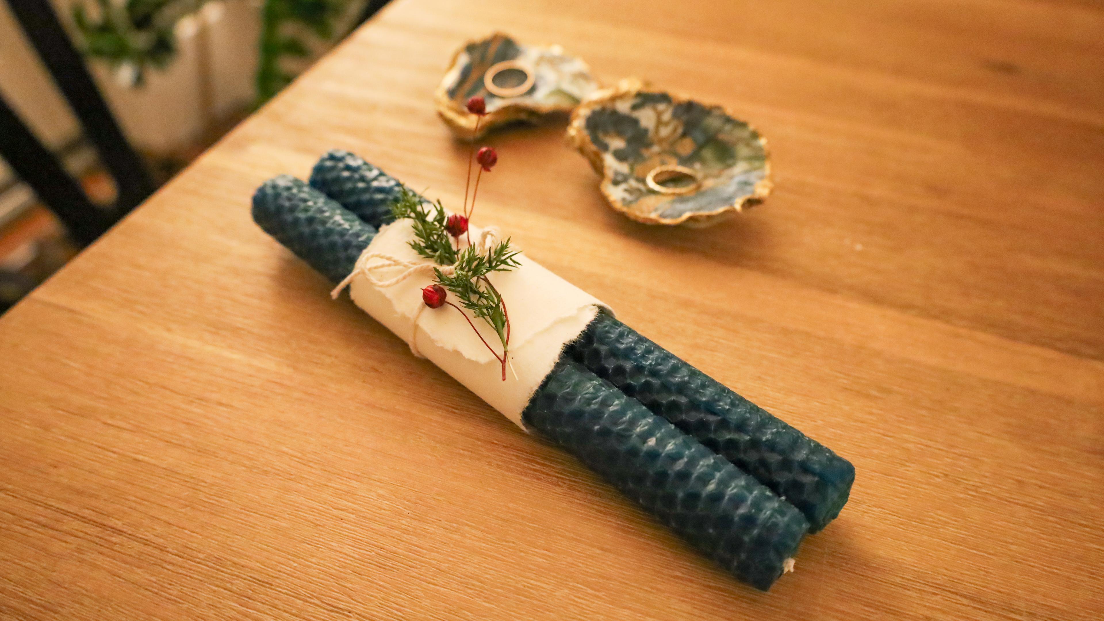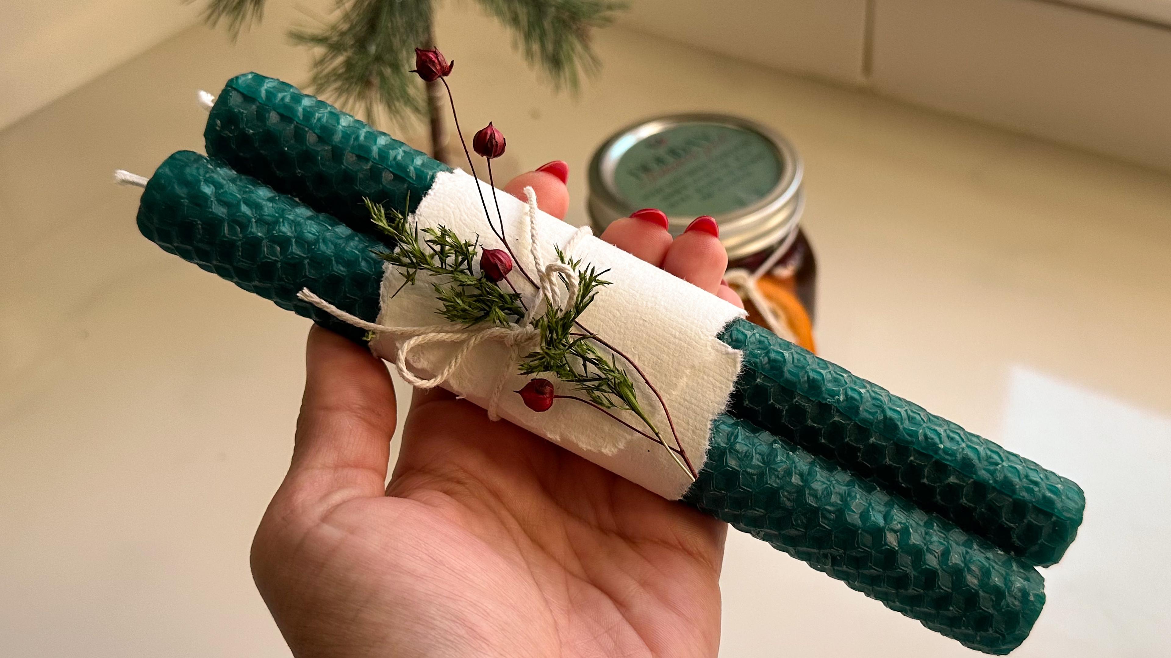 There are many candle making kits and online tutorials on different candle making methods. For example, a beeswax candle sheet can be rolled with an essential oil-soaked wicks, then gifted as a bunch tied together with twine and decorated with dried flowers or fruit.