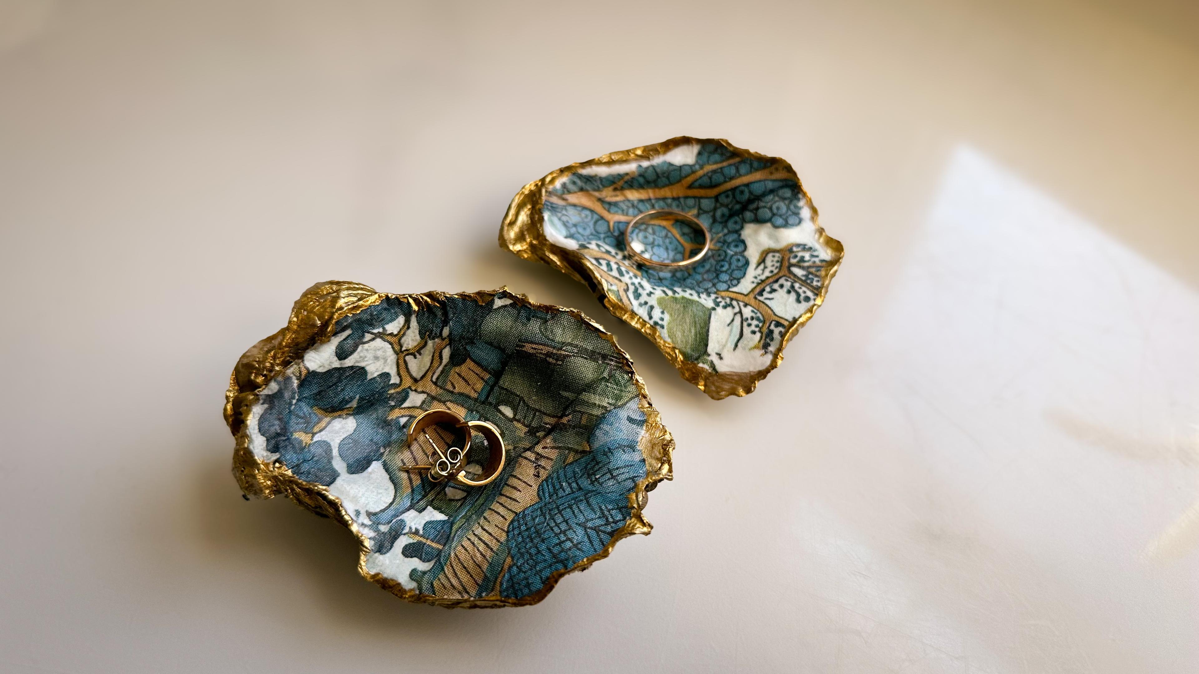 An oyster shell-sized trinket dish can hold items like rings and earrings. It can be customized based on the recipient’s style with the selection of a patterned napkin. For this project, clean and dry used oyster or scallop shells, paint with mod podge and lay a patterned napkin down. Once dry, remove excess napkin material around the shell, top with another layer of mod podge and paint around the rim with gold leaf paint.