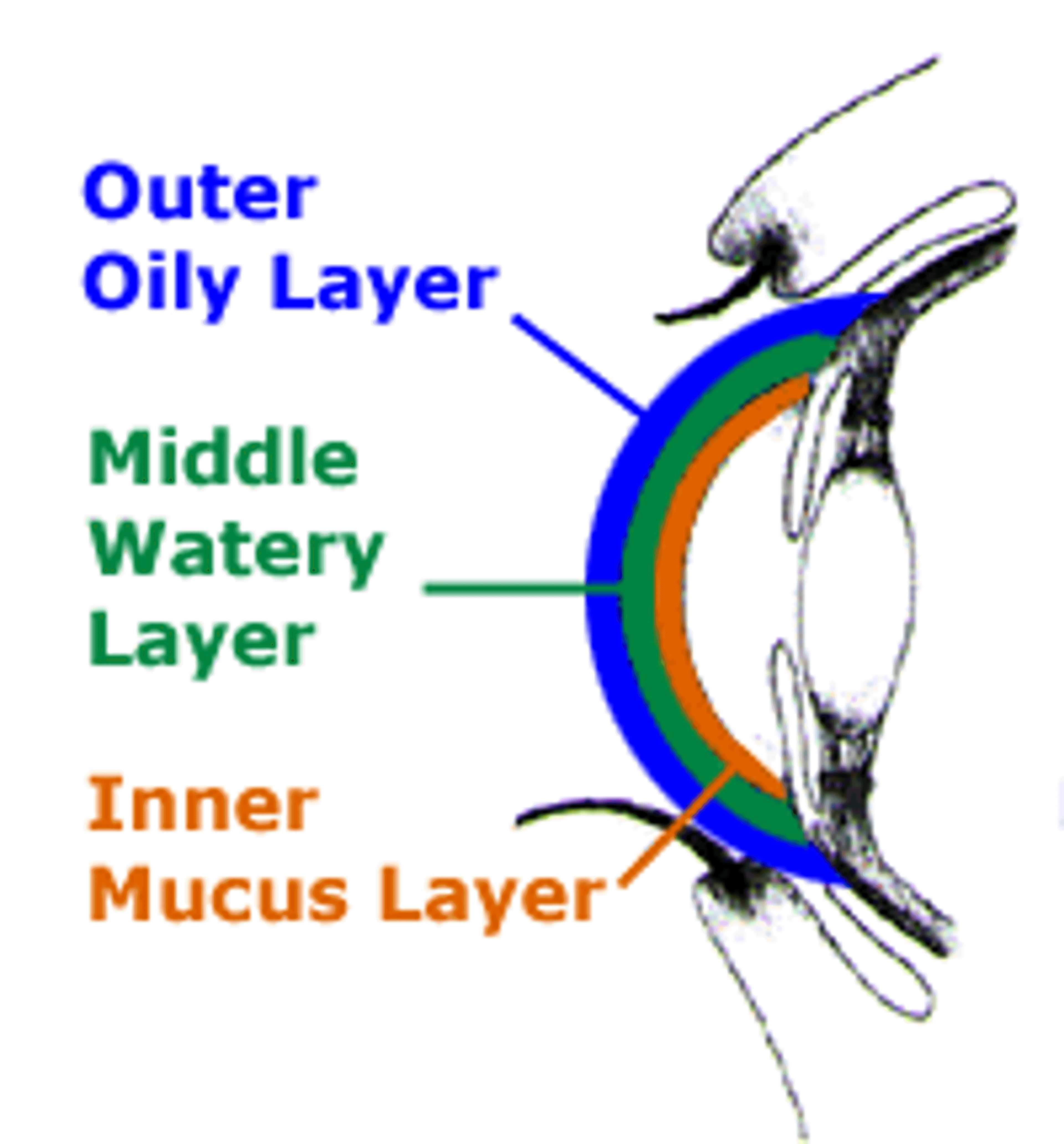 - Poor quality tears: Tears are made up of three layers: oil, water and mucus. Each component protects and nourishes the surface of the eye. A smooth oil layer helps prevent evaporation of the water layer, while the mucus layer spreads the tears evenly over the surface of the eye. If the tears evaporate too quickly or don’t spread over the cornea due to deficiencies with any of the three tear layers, dry eye symptoms can develop.