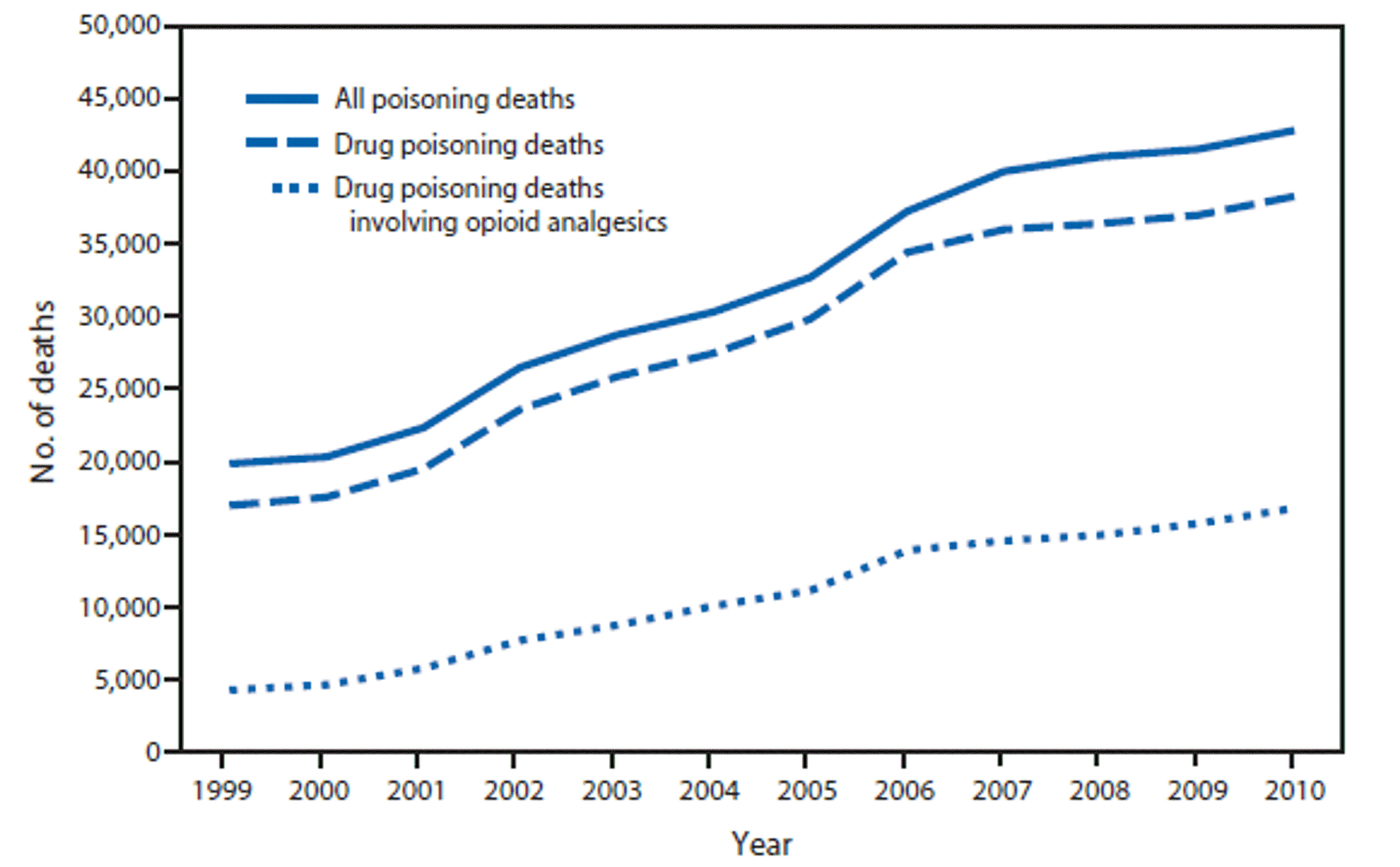 From CDC: QuickStats: Number of Deaths From Poisoning, Drug Poisoning, and Drug Poisoning Involving Opioid Analgesics — United States, 1999–2010