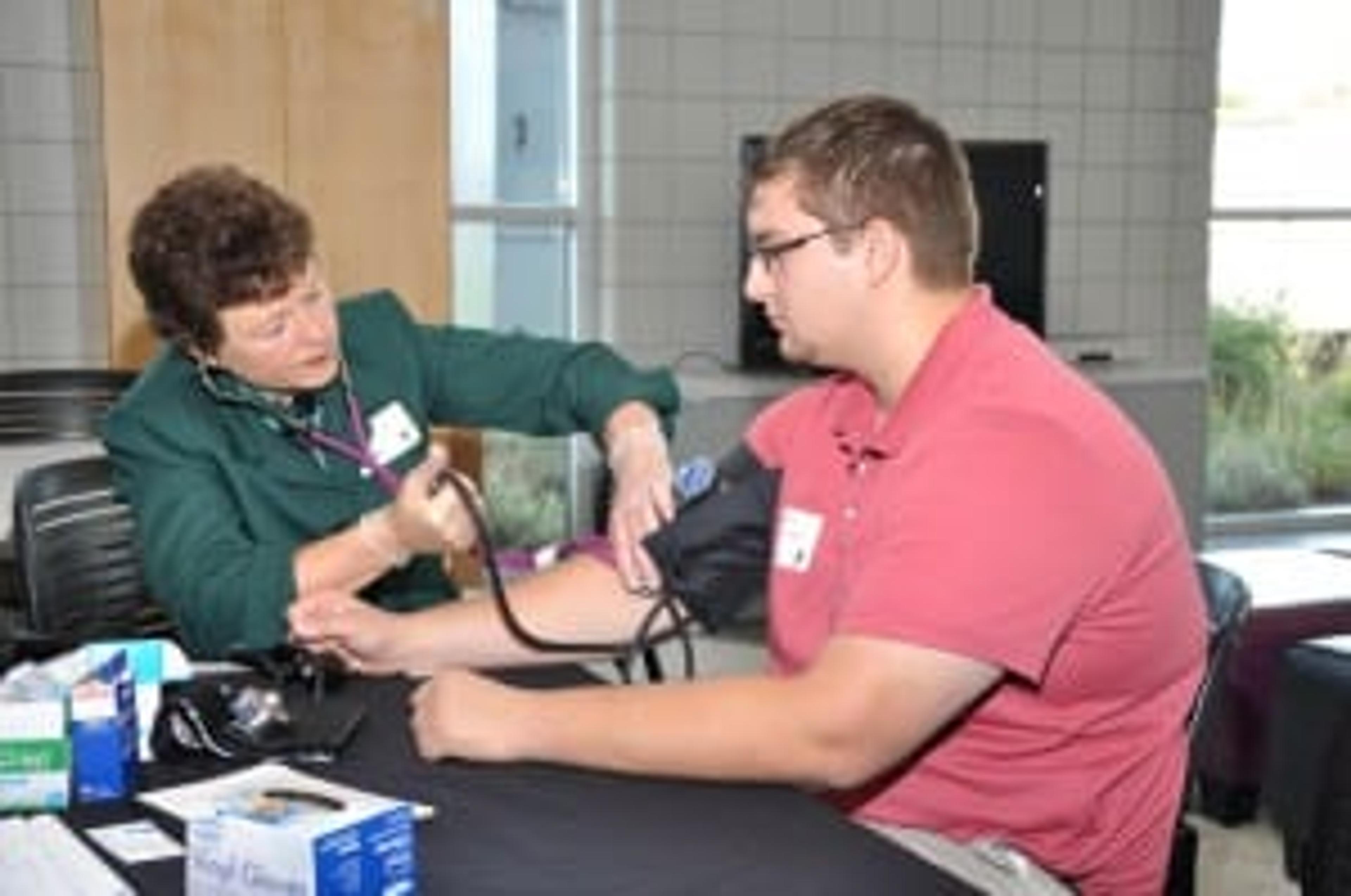 Sherry Bliar, YMCA, testing a volunteer's numbers at the BCN Wellness luncheon kickoff event on 09.24.12
