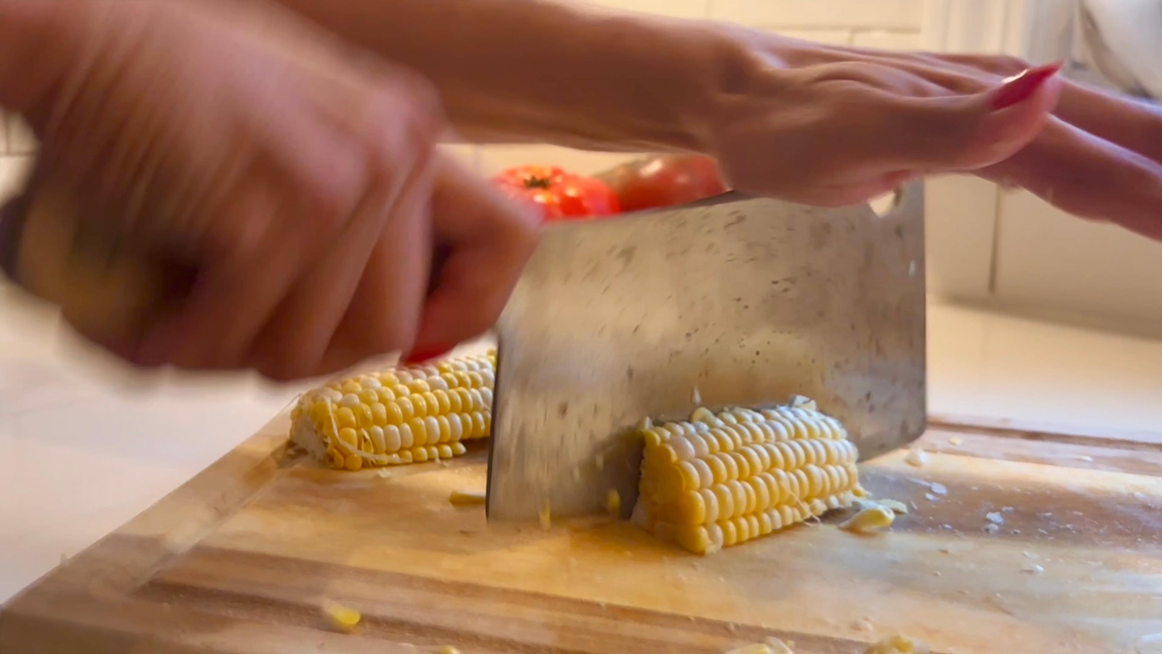 Husk corn and trim the ends. Carefully cut each ear in lengthwise into quarters, then in half, creating “ribs.”