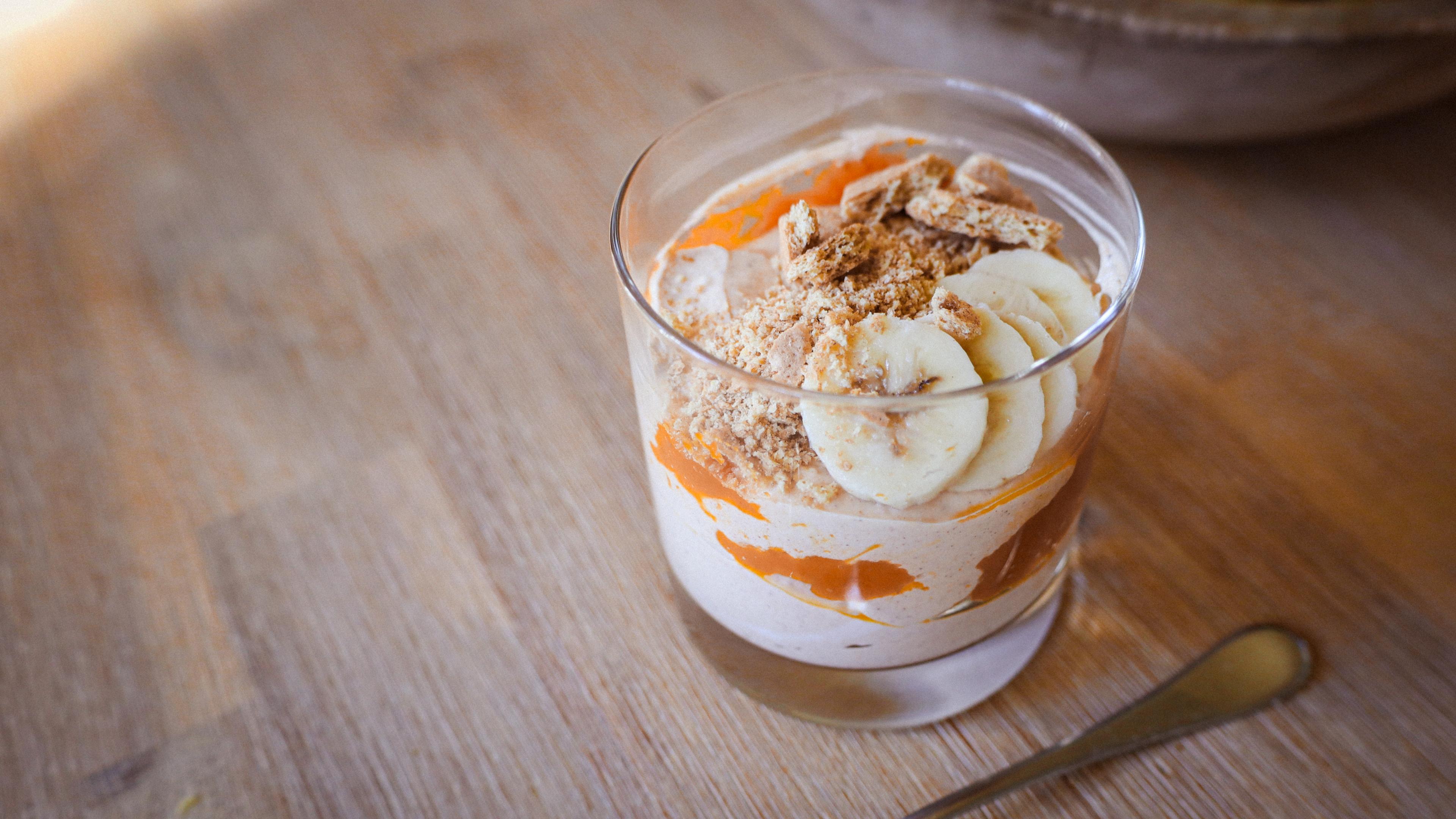 This healthier no-bakebreakfast rendition of a cheesecake blends fall flavors of pumpkin puree, maple syrup and pumpkin pie spice with yogurt and light cream cheese. The yogurt provides protein while the cream cheese gives the mixture that classic cheesecake flavor. Simply blend the mixture in a blender until smooth and top with a crumbled graham cracker cookie and banana slices.