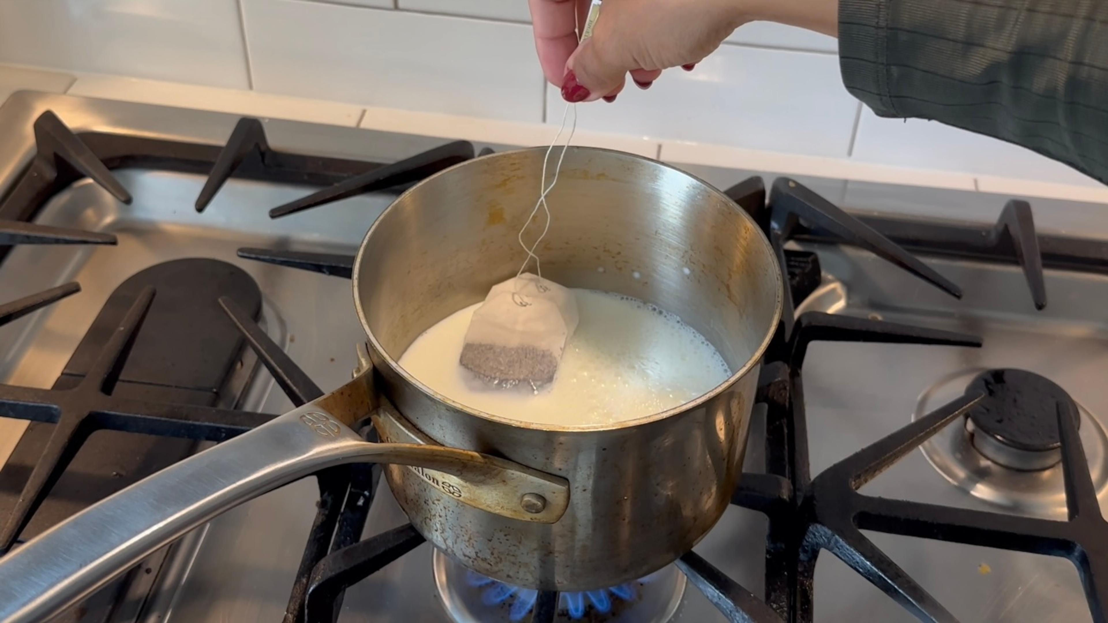 Turn off the heat and add tea bags to the hot milk. Wait 3 to 5 minutes for the tea to steep, then remove the bags.