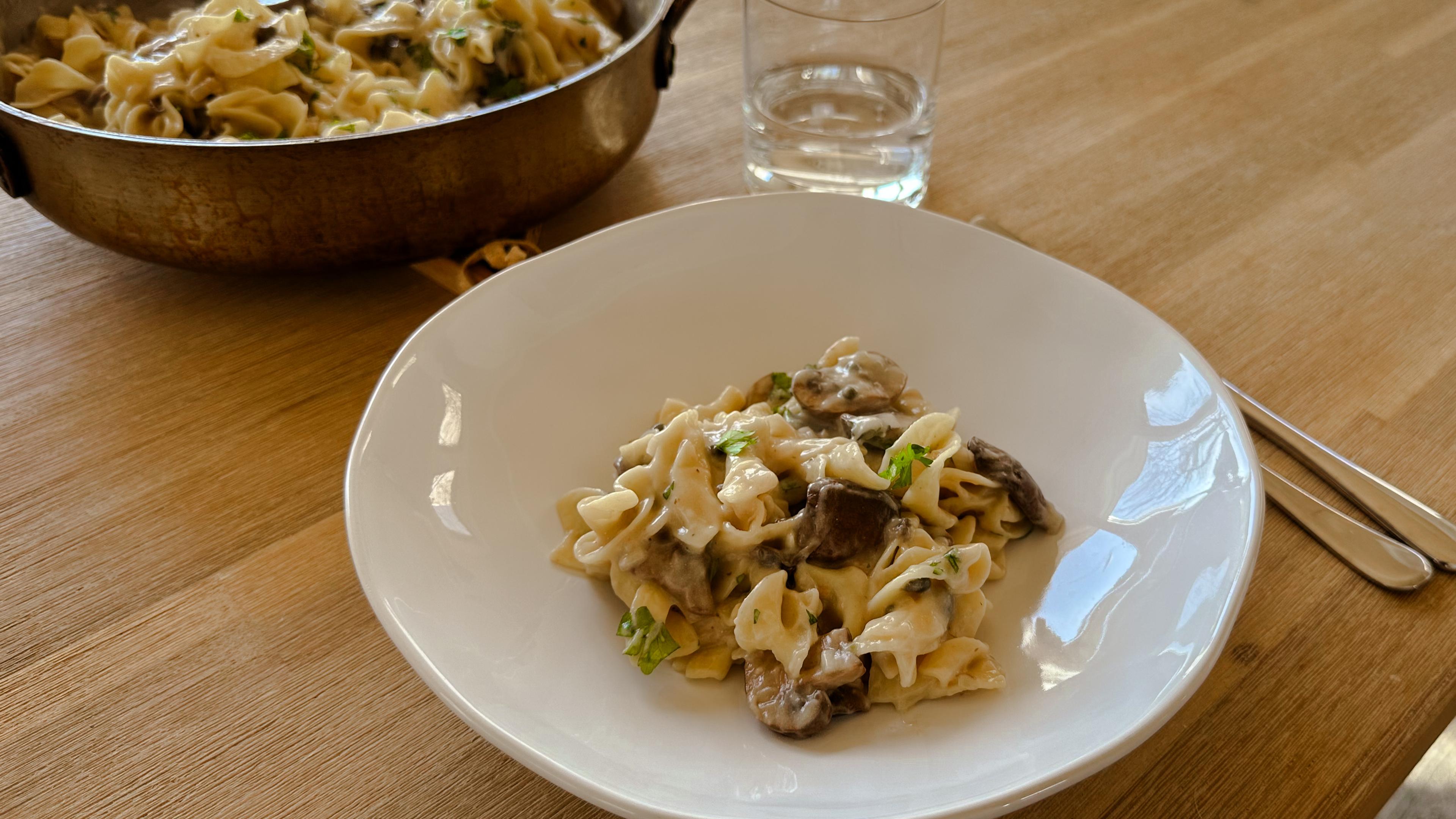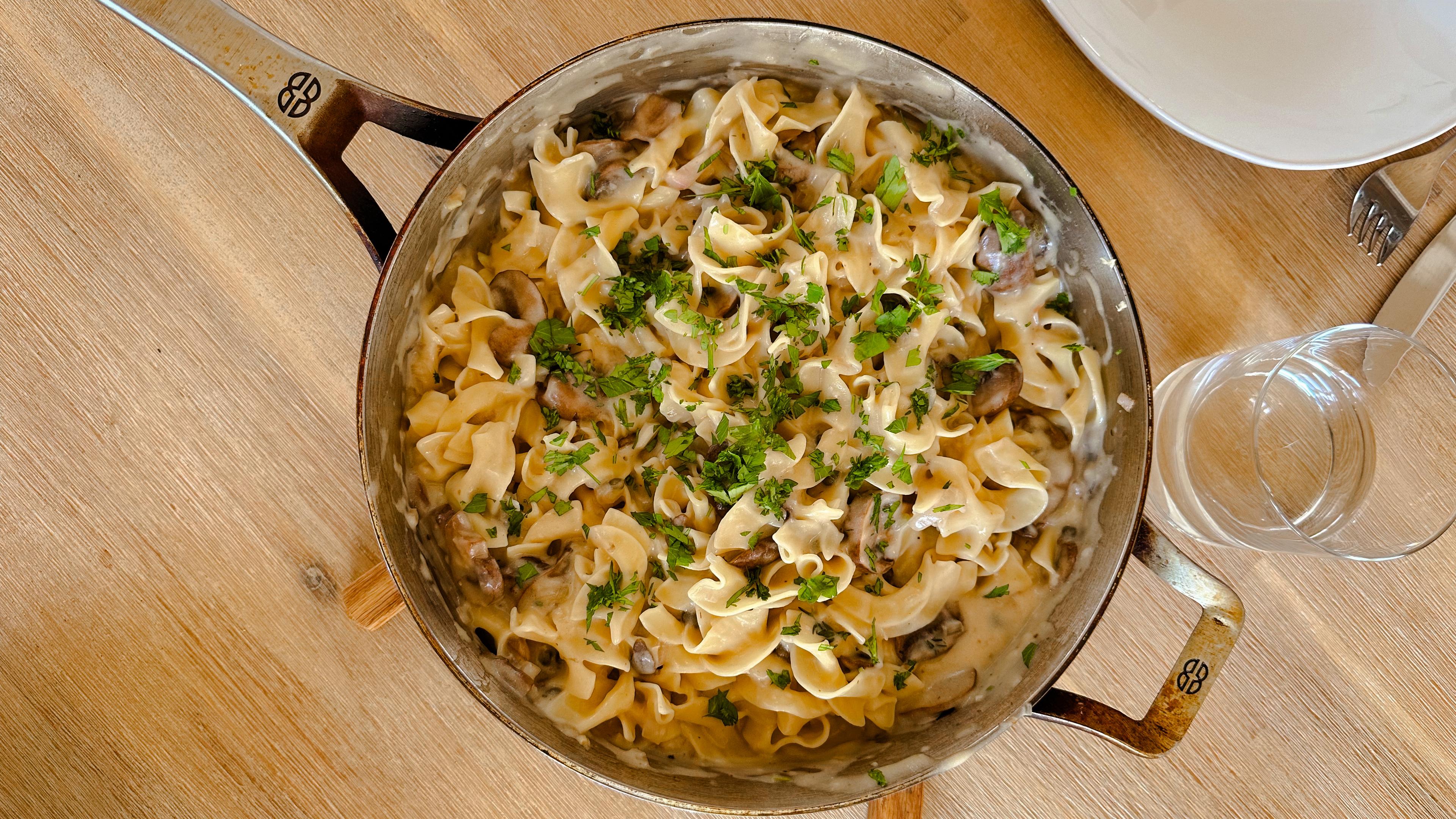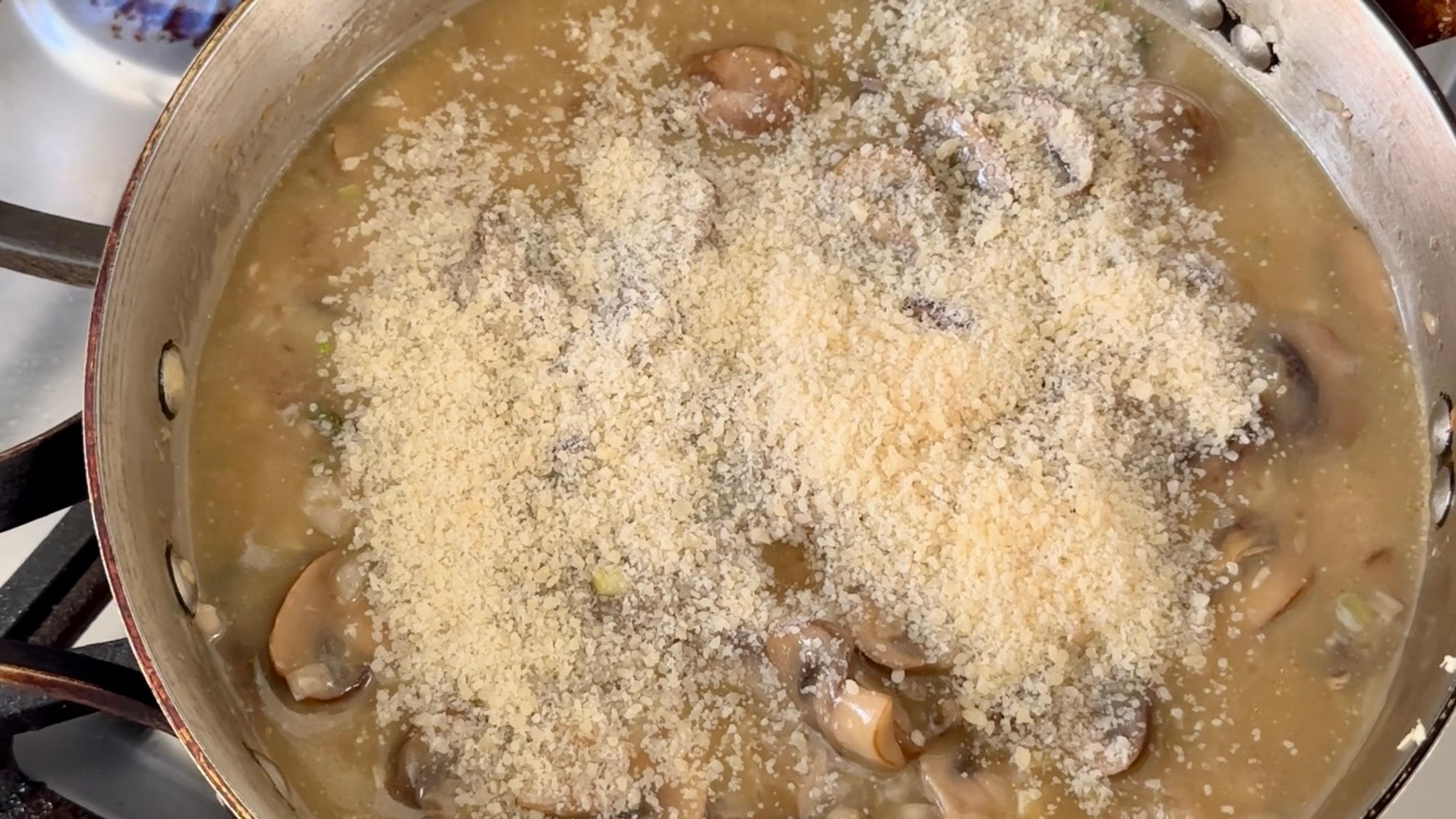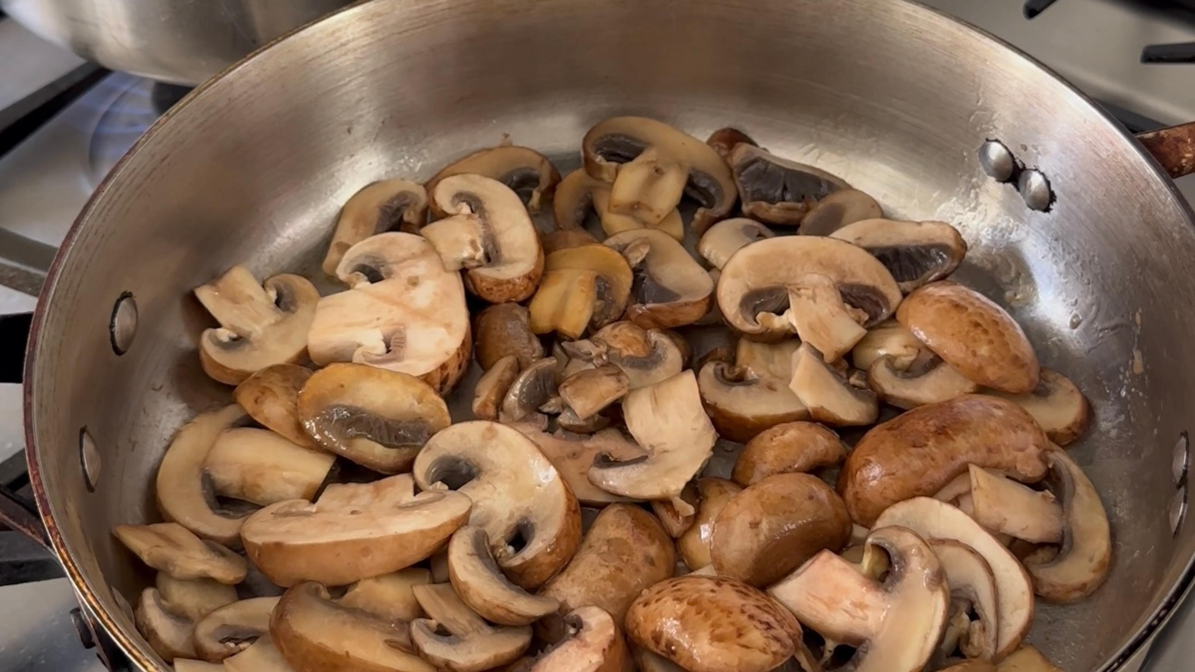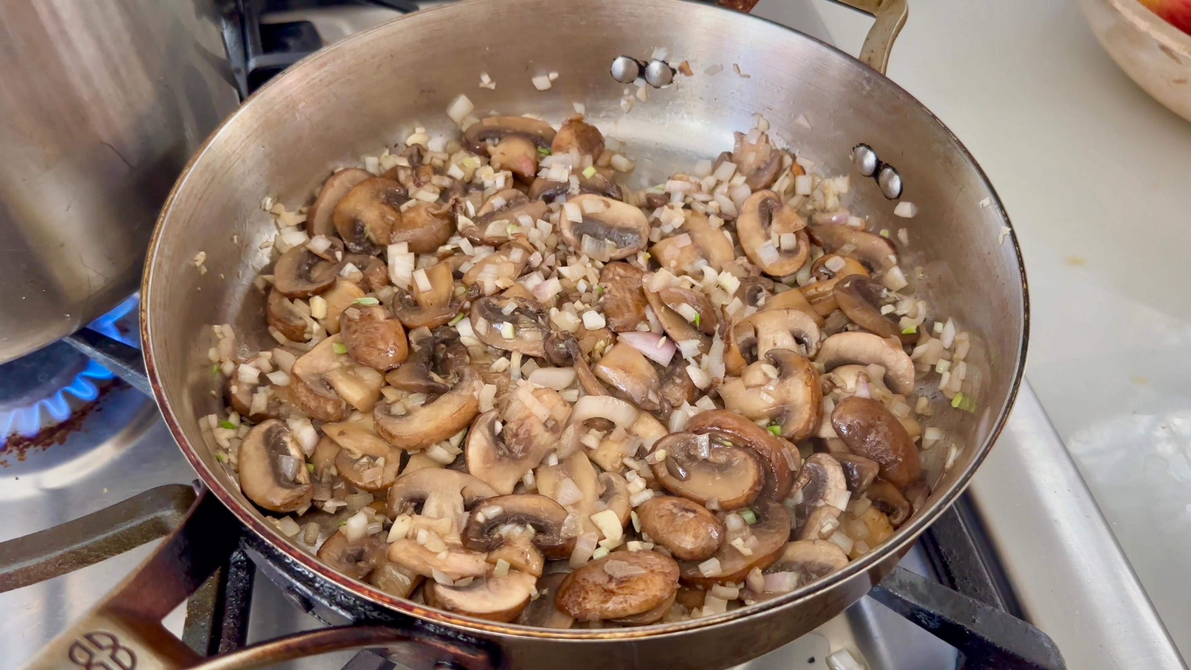 Heat a large pan over medium heat and add half of the olive oil. Once warm, add mushrooms, stirring frequently until mushrooms have released their liquid and are just starting to brown, about 8 minutes.