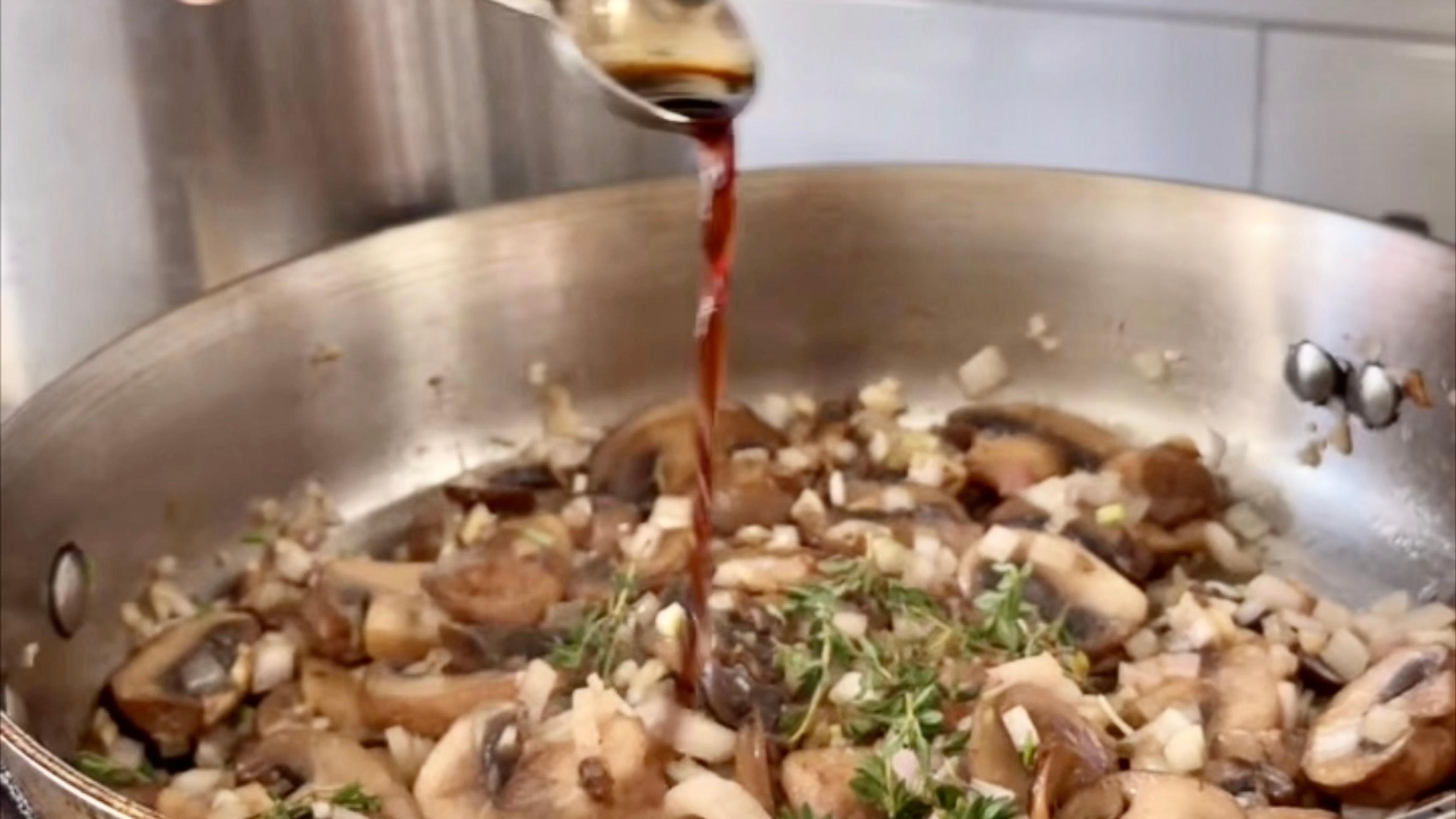 Add thyme, Worcestershire sauce and mustard and cook, stirring, until mostly evaporated, about 30 seconds.