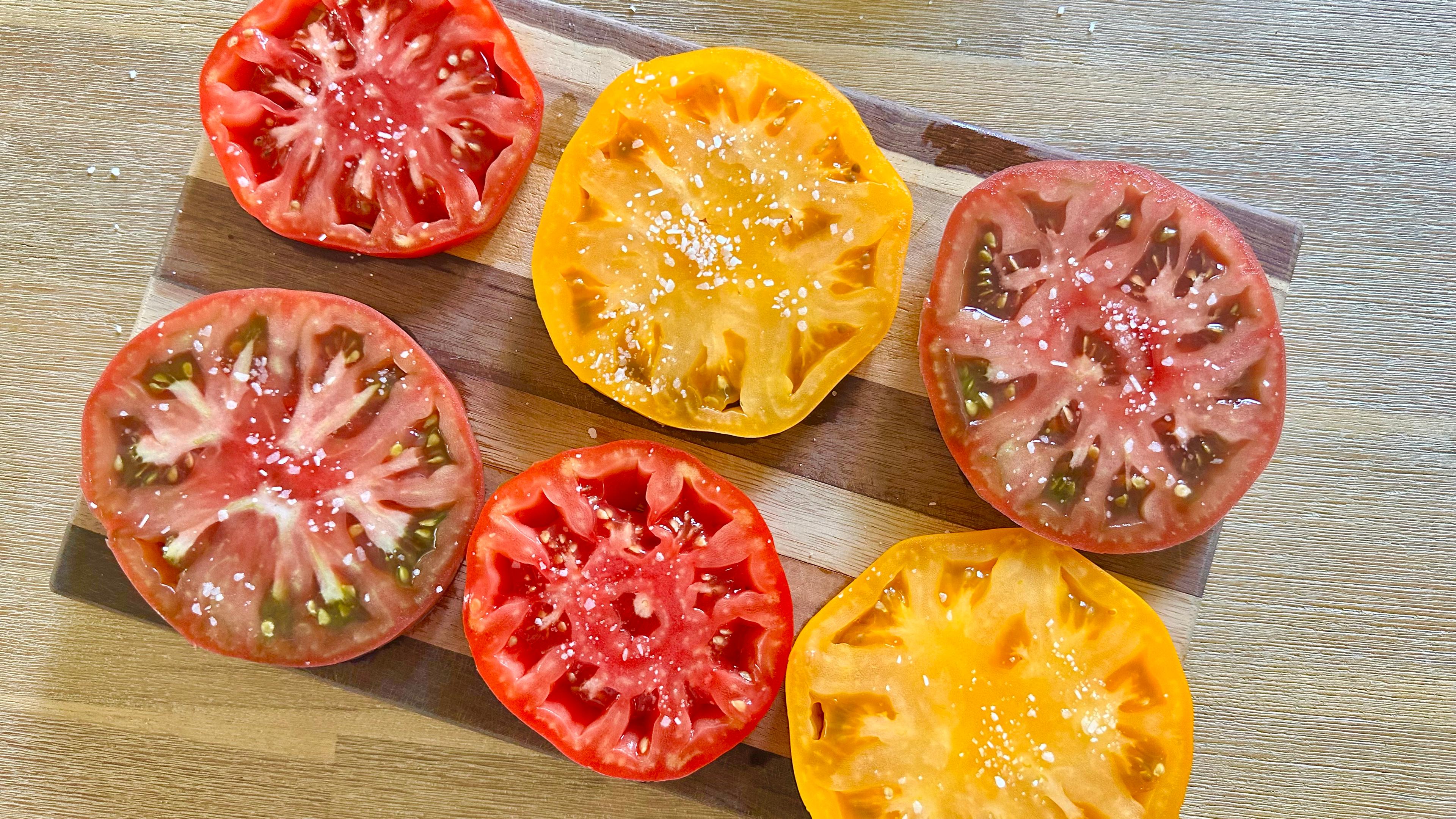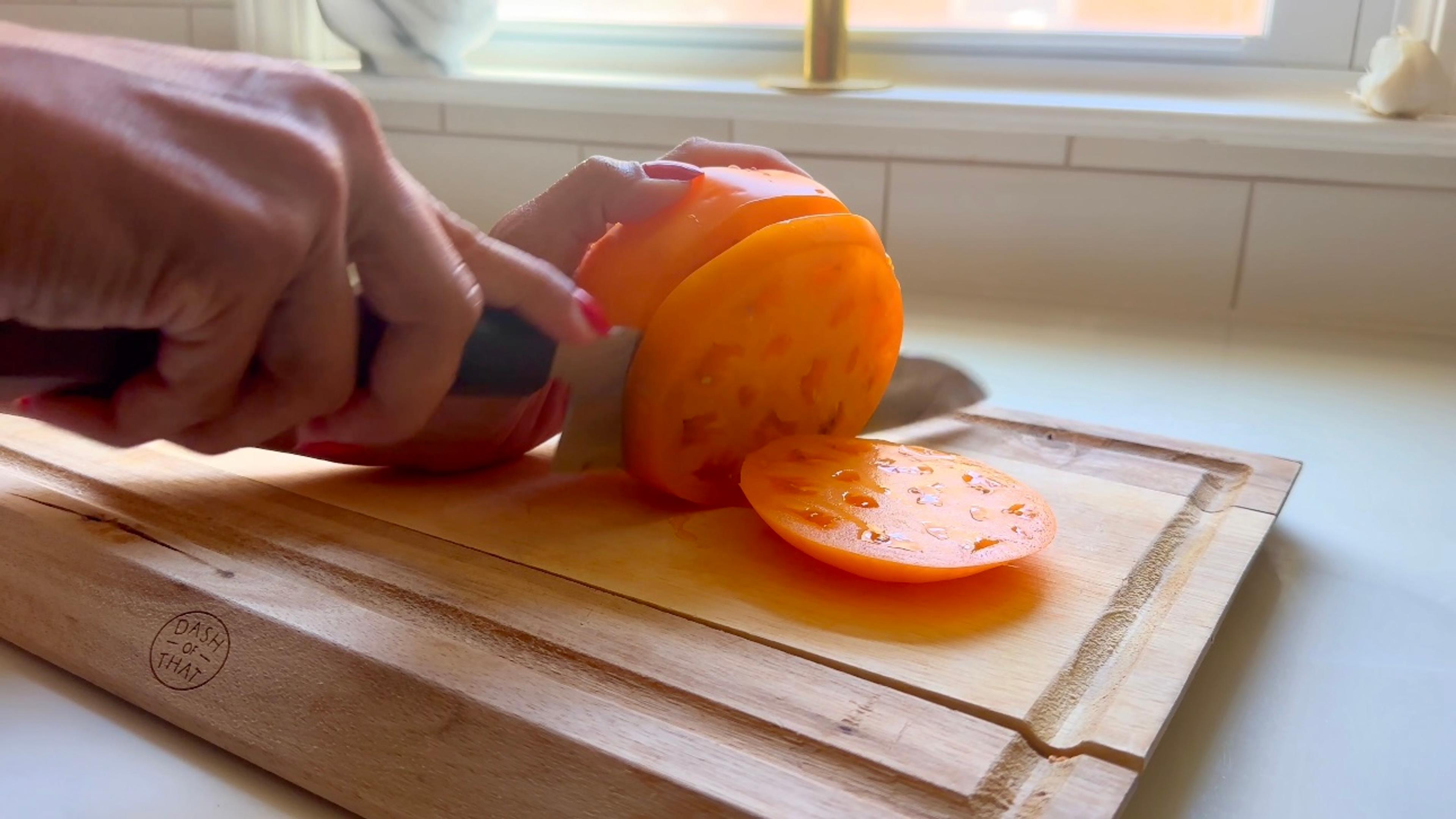 Wash and slice the tomatoes into 3/8-inch-thick rounds.