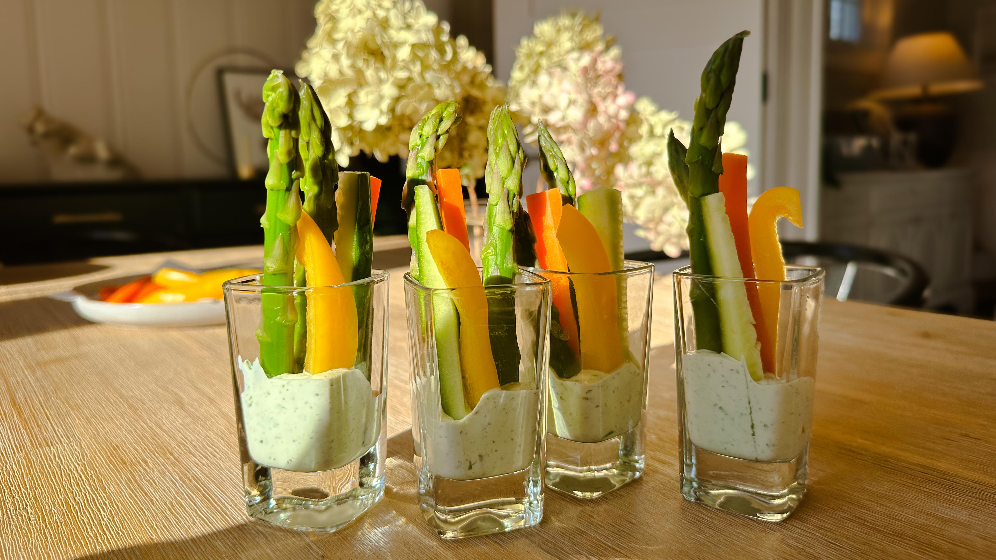 In shooters or small glasses, add a dollop of the sauce at the bottom. Stick individual cuts of blanched and fresh vegetables in each one.