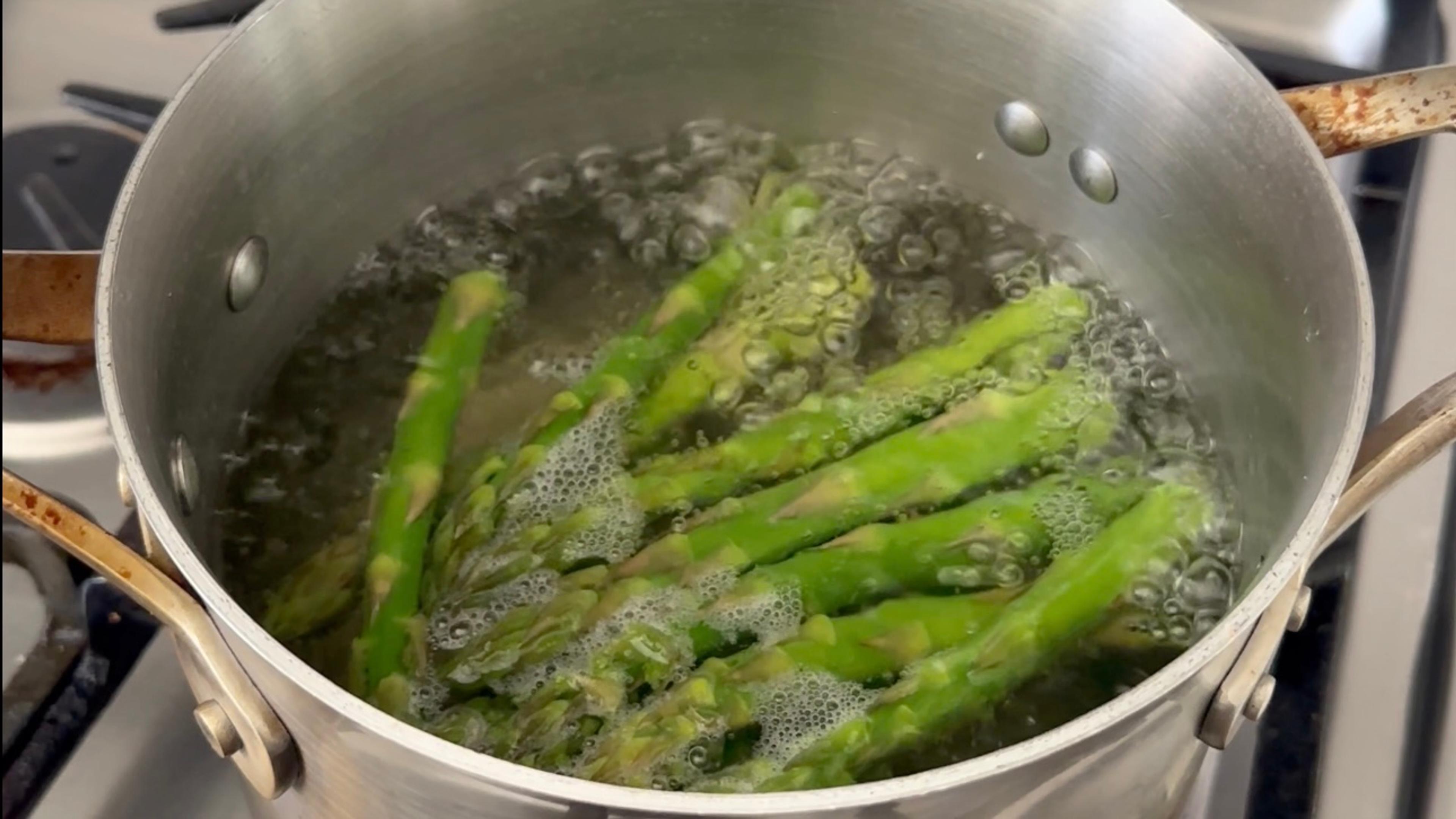 Boil the asparagus and carrots separately as they have different cooking times. Thin asparagus should take 1.5-2 minutes. Thicker asparagus may take 2.5-3 minutes. Test for tenderness throughout. Carrots should boil for 1.5-2 minutes.