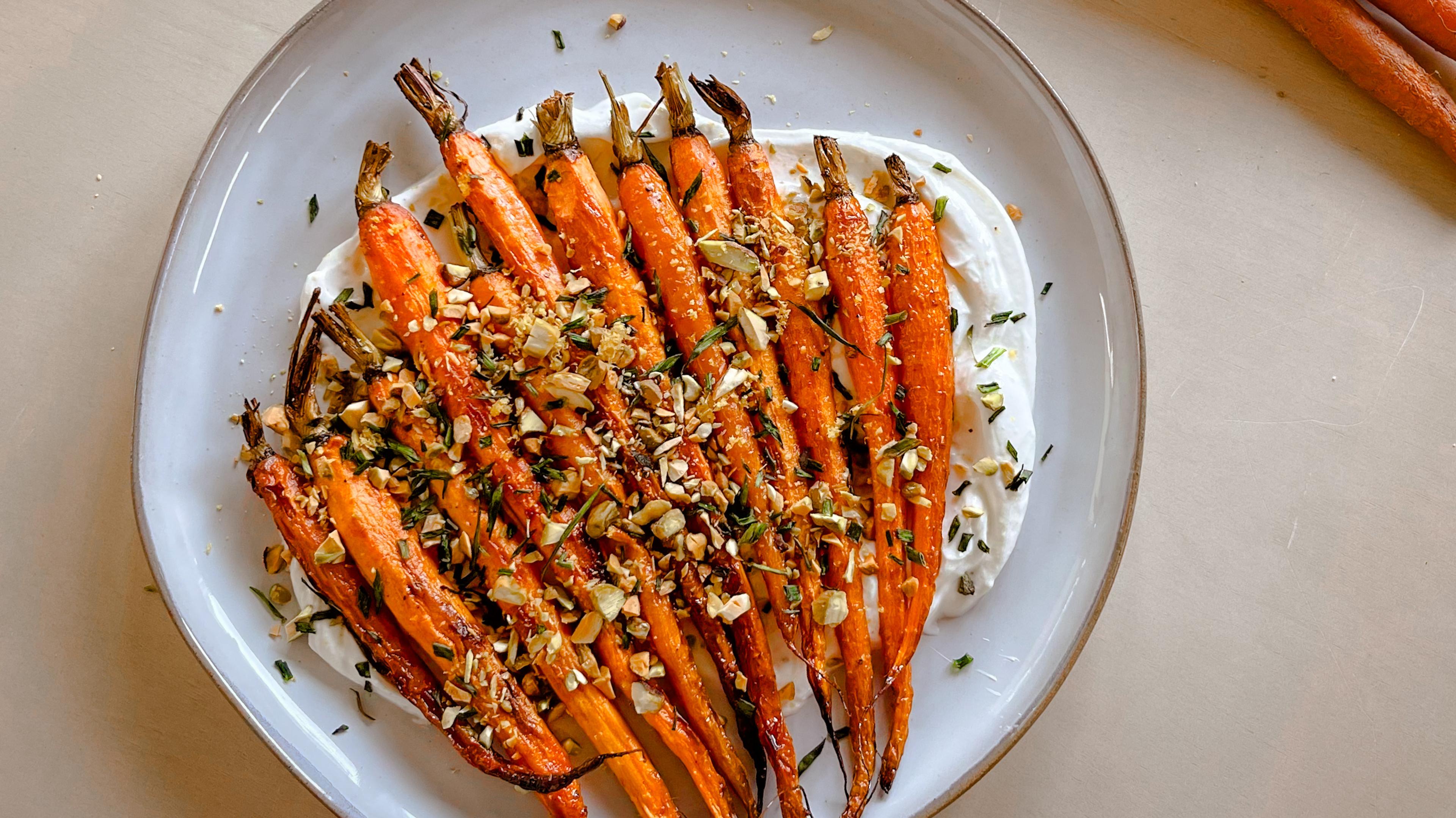 Carrots are in season during the spring, making them perfect to incorporate as an appetizer or side at an Easter celebration. These glazed carrots are roasted until fork tender and served with a creamy Greek yogurt sauce for a dose of protein. The pistachios add a nice contrasting crunch and flavors that work so well with this spring crop.
