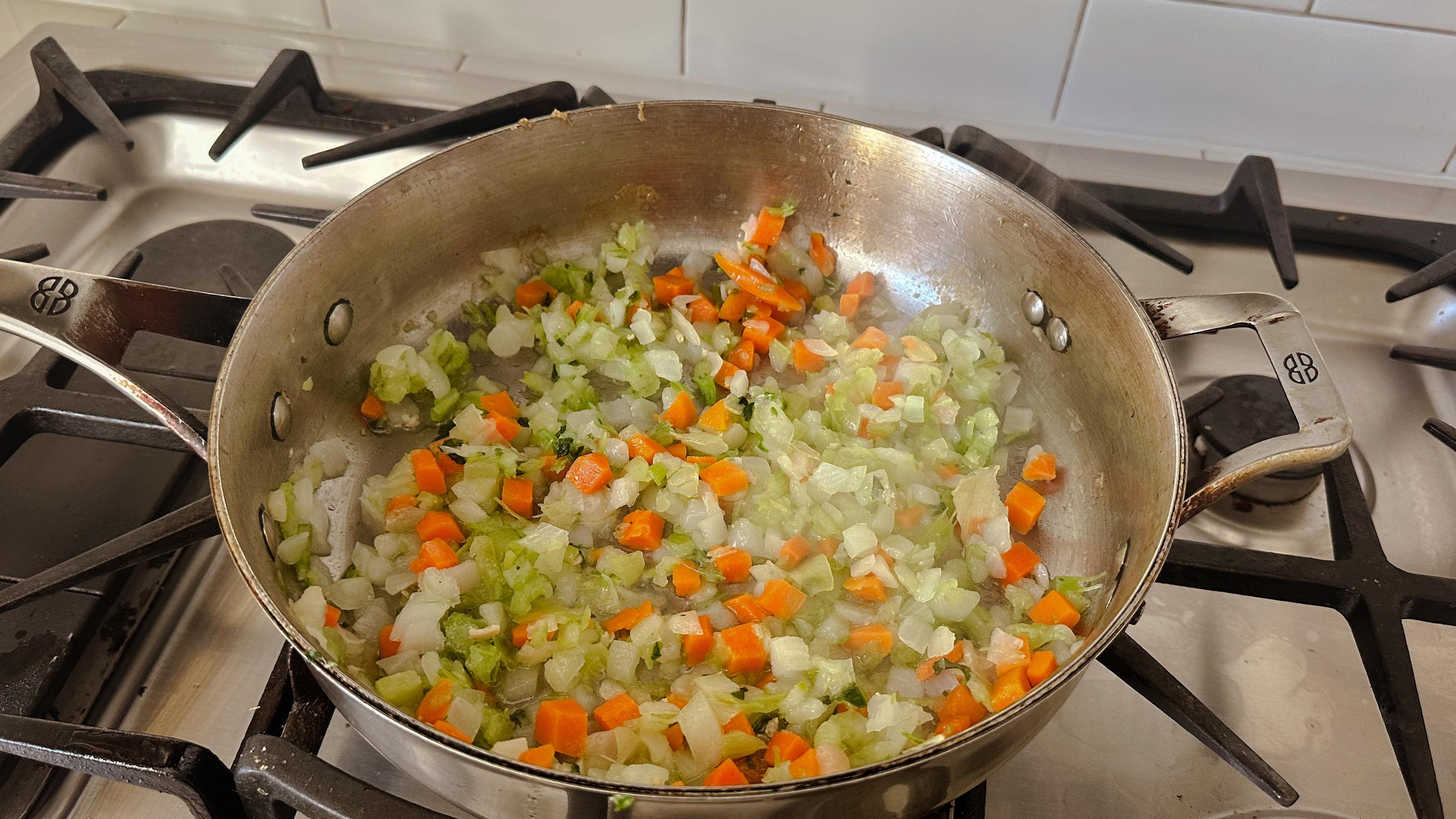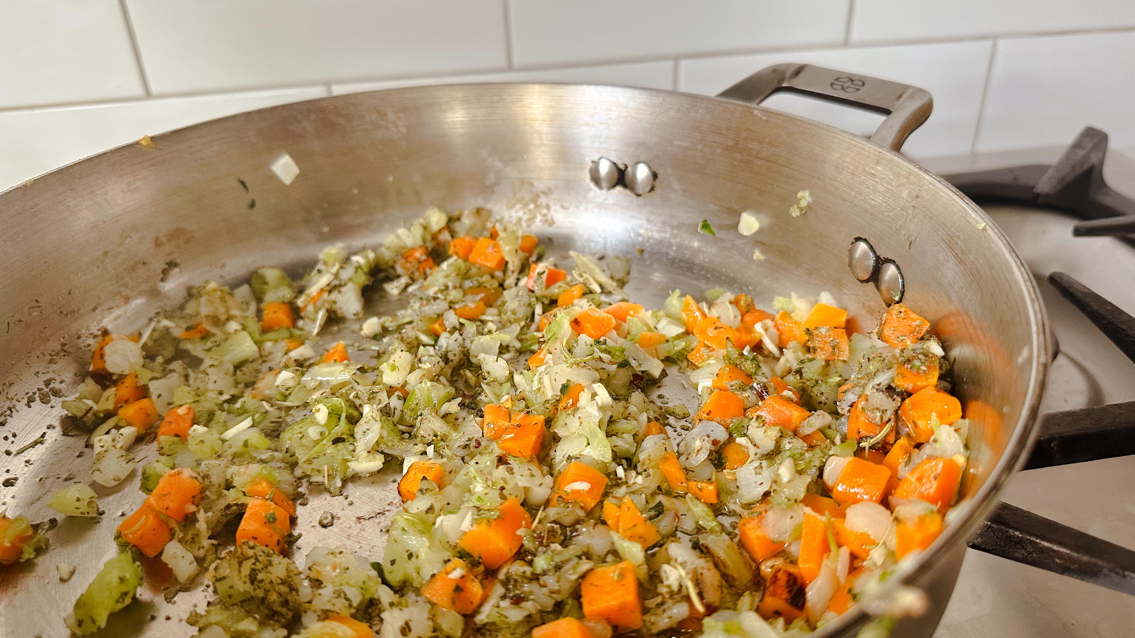 Add remaining olive oil along with the mirepoix mix - carrots, celery and onion. Cook for 8-10 minutes until softened, stirring occasionally.